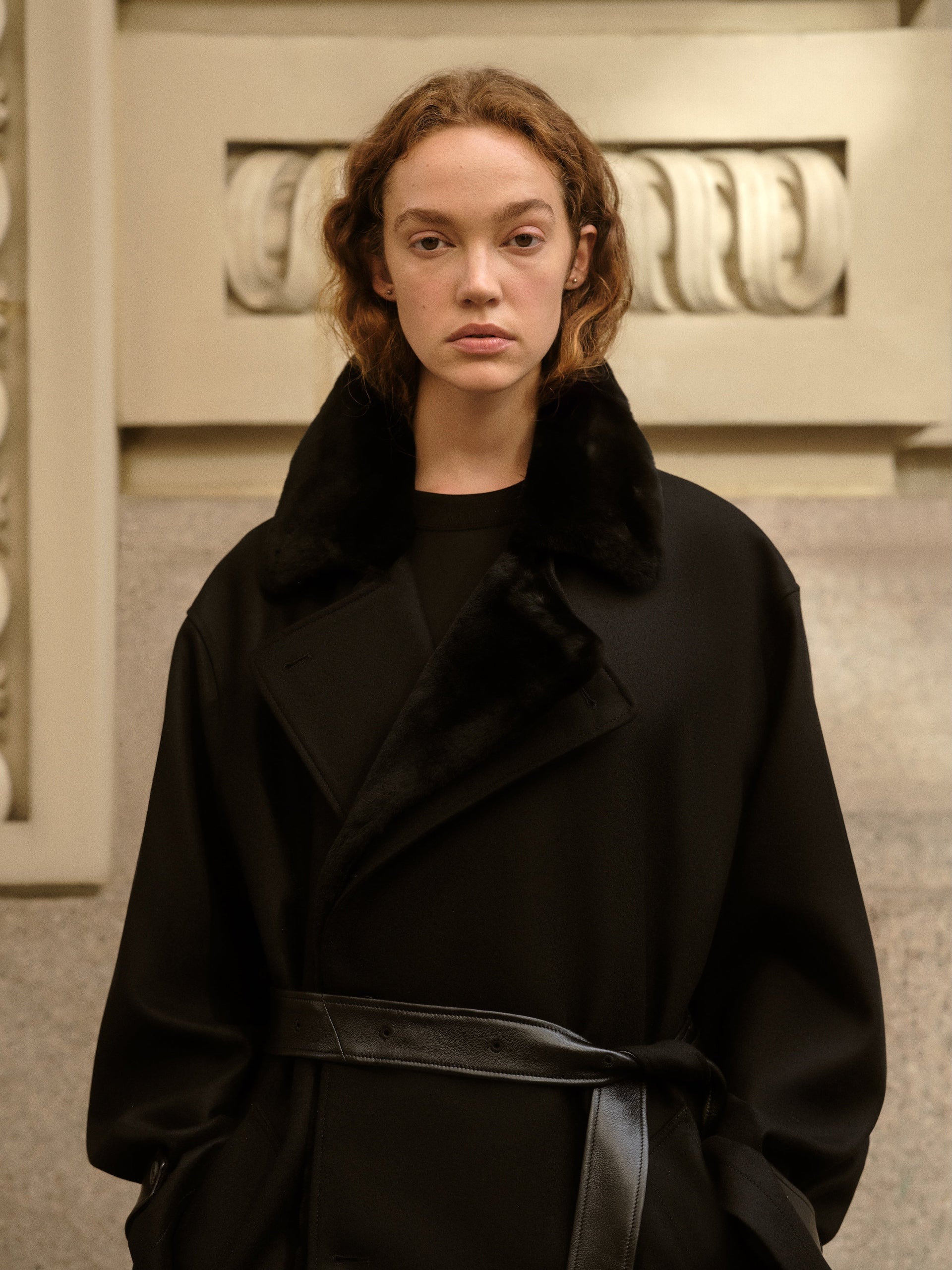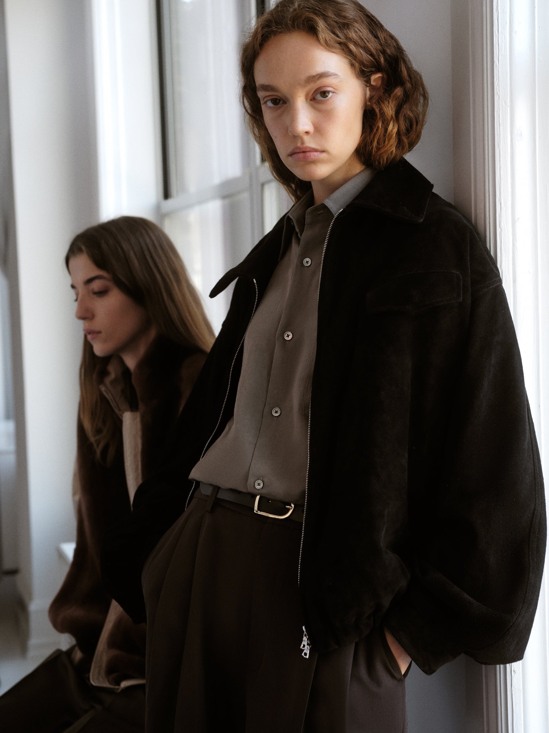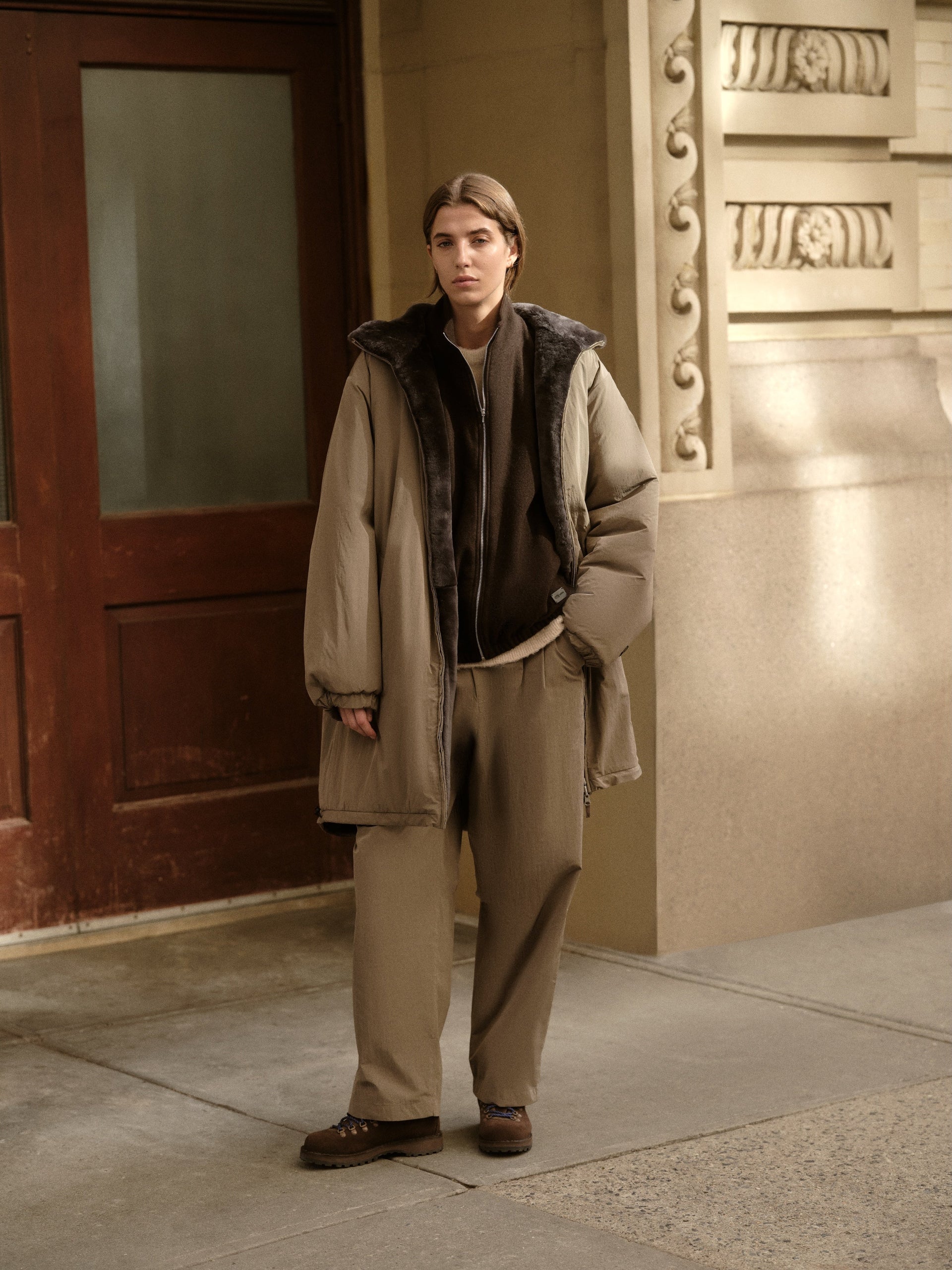 Comprising a mix of technical fabrics with cozy, upscale luxurious wool and knit blends, all styles are made in an updated, collaborative palette, comprising earth tones like Walnut, Everglades, and Kindling with staple Bright White and Black Beauty. Explore jackets designed for versatility like the Mouton Inner Reversible Parka and Jacket, tailored overcoats like the Double Lapeled Double Breasted Coat and the Oversized Double Breasted Blazer, and inner layers like the Linen Buttondown, the Alpaca Knit Crewneck Pullover, and the Oversized Pocket Tee. Material highlights include cashmere blends, sheep leather, and wool, each silhouette complete with discrete, tonal co-branding found only on a leather patch.