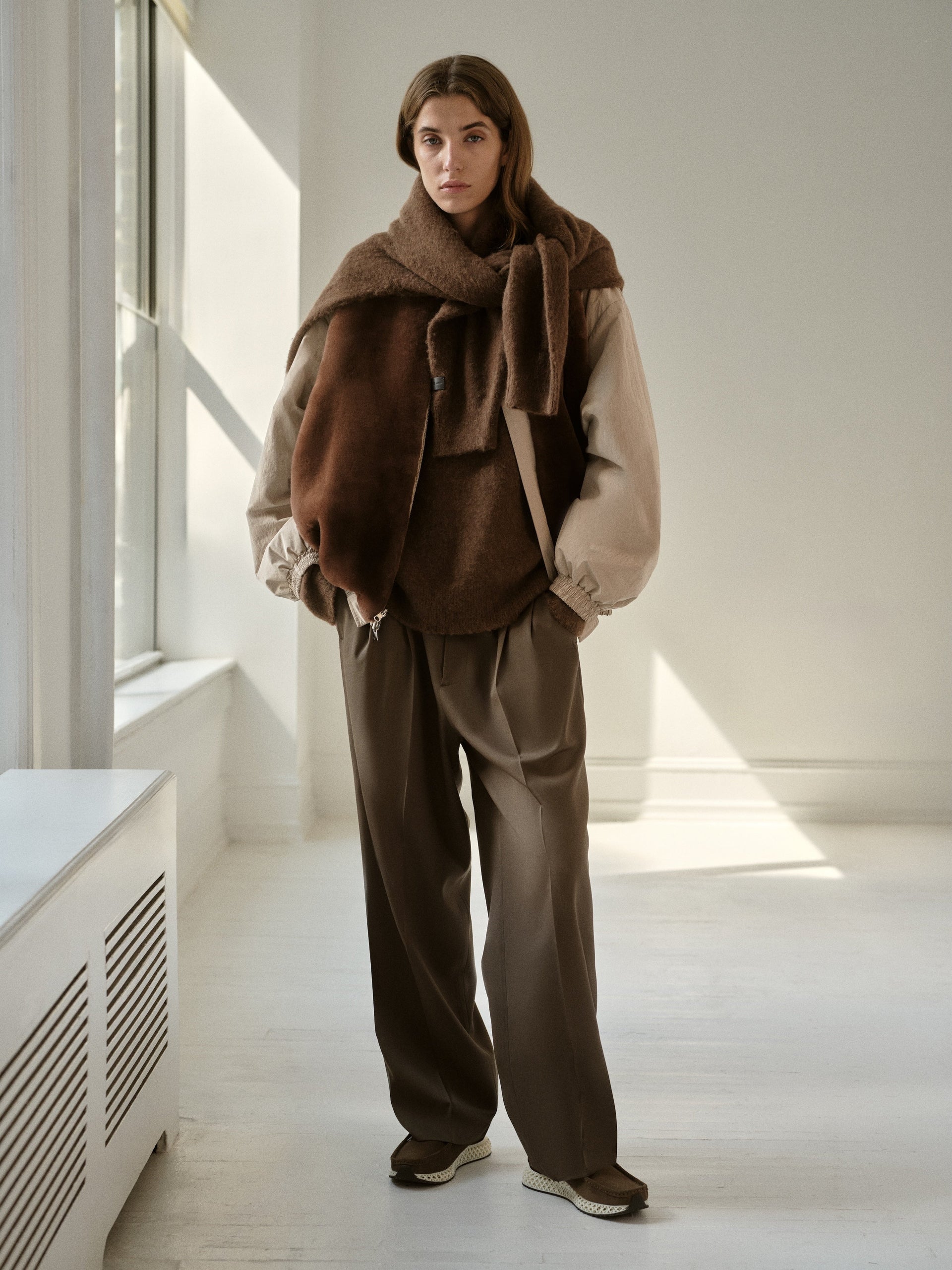 本コレクションでは、機能性に優れたテクニカルファブリックと、上質で心地よいウールやニットブレンドを組み合わせ、すべてのスタイルを仕立てています。カラーパレットは今回のコラボレーションのために新たにアップデートされており、Walnut、Everglades、Kindling といったアーストーンを基調に、定番の Bright White と Black Beauty を組み合わせた構成です。ラインナップには、ジャケット、ダブルブレストコート、リバーシブルパーカのほか、Linen Buttondown、Alpaca Knit Crewneck Pullover、Oversized Pocket Tee などのインナーウェアを展開。さらに、カシミヤブレンドのパンツ、シープレザーのトラウザー、ウールスーティングのセットアップなども揃い、いずれもレザーパッチにさりげなく施されたトーナルのコラボレーションロゴが特徴です。