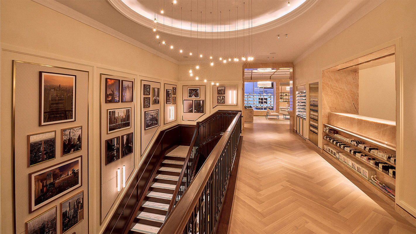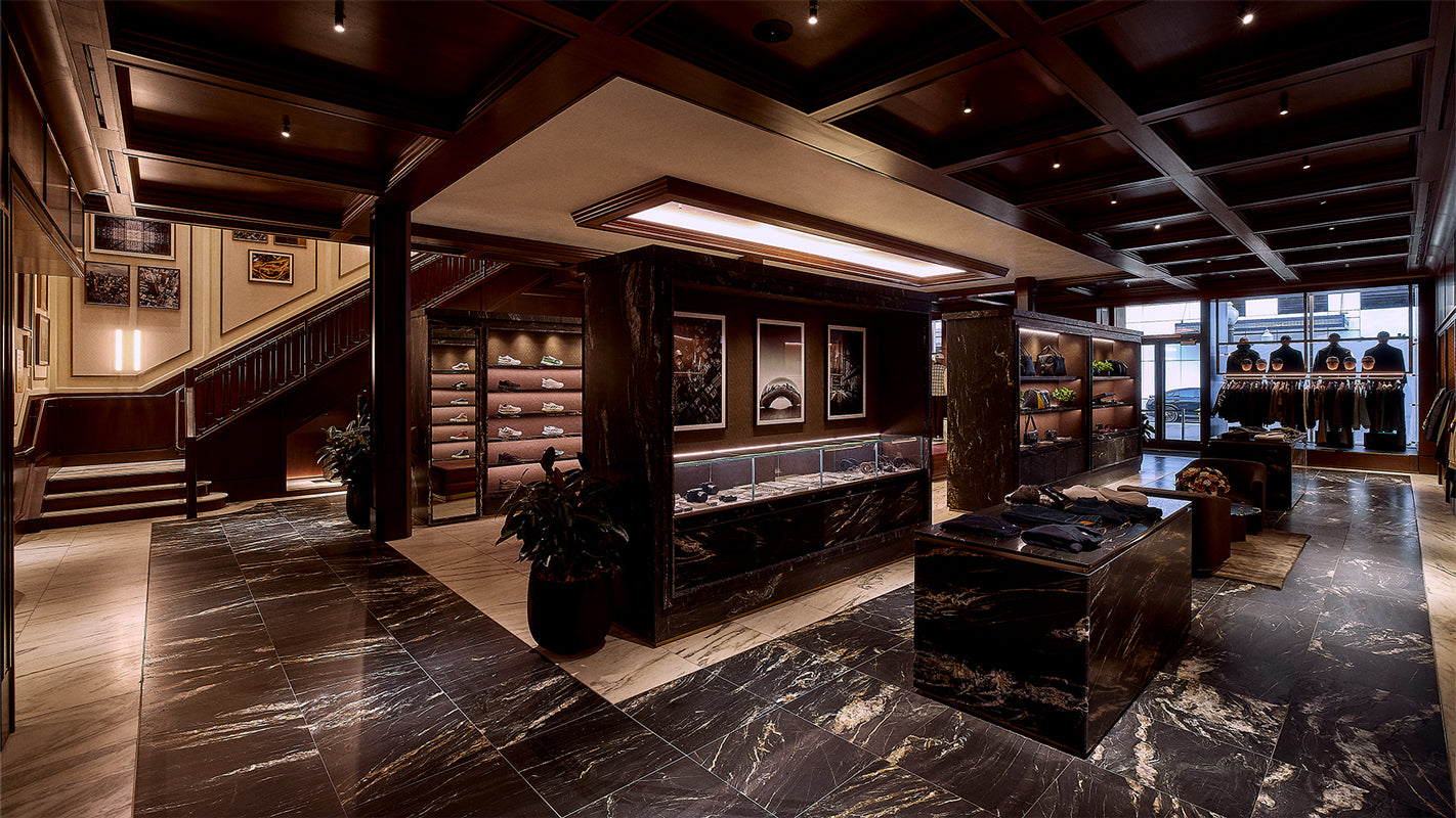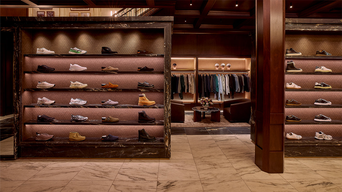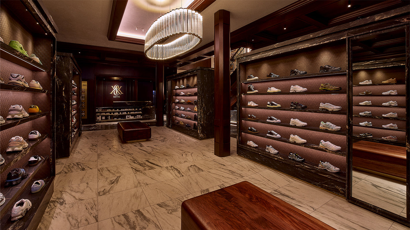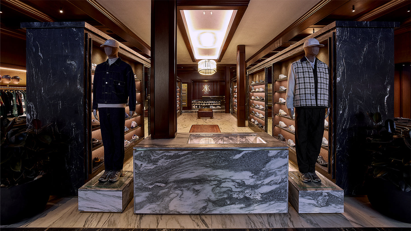 Visitors are surrounded by dark walnut millwork and a coffered ceiling when they enter the first floor of the space, housing Kith, additional brands, and footwear for men. There is Belvedere flooring complete with Montclair Danby marble bordering and apparel niches lined with custom K&K Crest embossed velvet and leather wallcovering. Displayed prominently along the center of the store are monolithic Belvedere caseworks displaying Kith’s lifestyle accessories, and jewelry on one side. On the opposite side features Men’s footwear accompanied by custom Mark Jupiter walnut benches.
