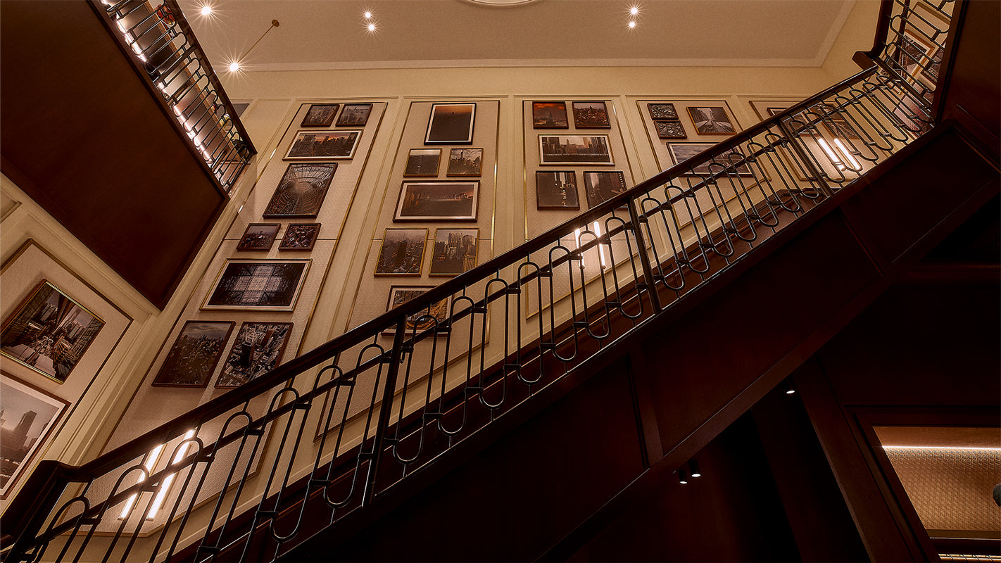 Ascend the statement staircase made of the same dark walnut and Montclair Danby marble found on the steps as the main space to enter the second floor—warmth and hospitality speaks loudest at the stairs, especially with the large gallery wall made of custom K&K wallcovering panels and dark walnut wainscotting, softened with plaster. The gallery wall features over thirty curated photographs from Chicago-based artists showcasing the city’s beautiful cityscape and textures.