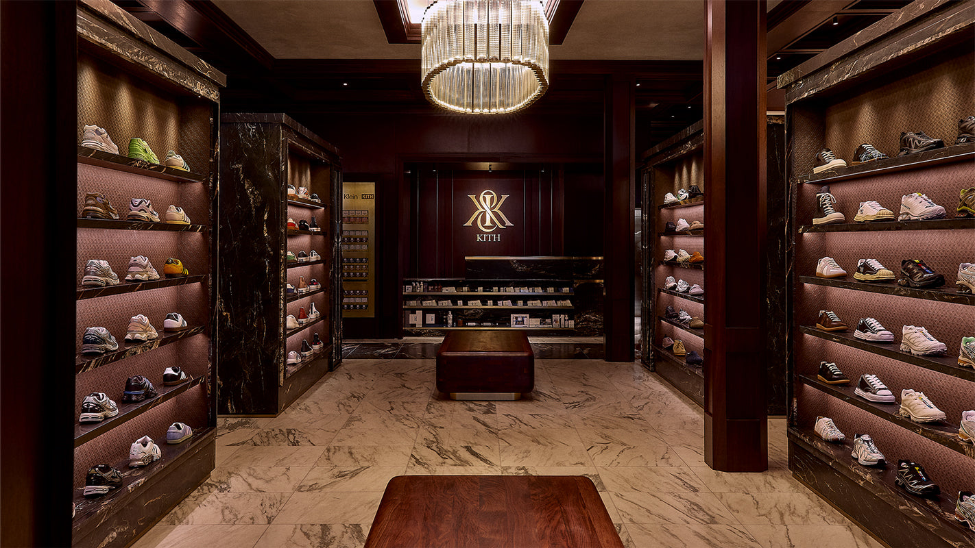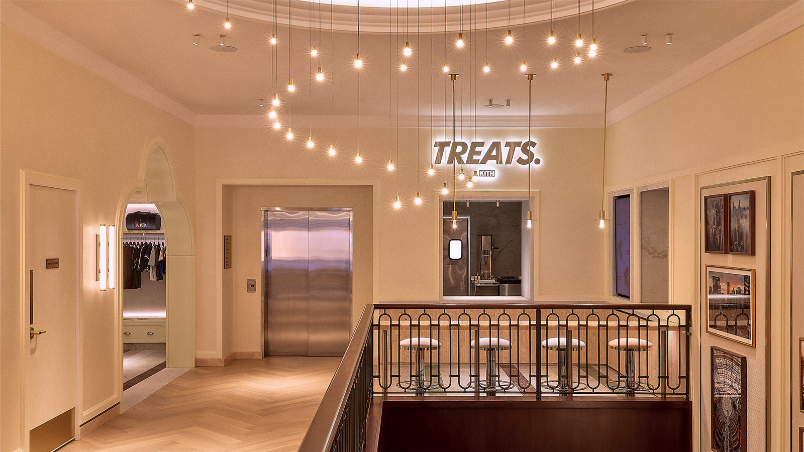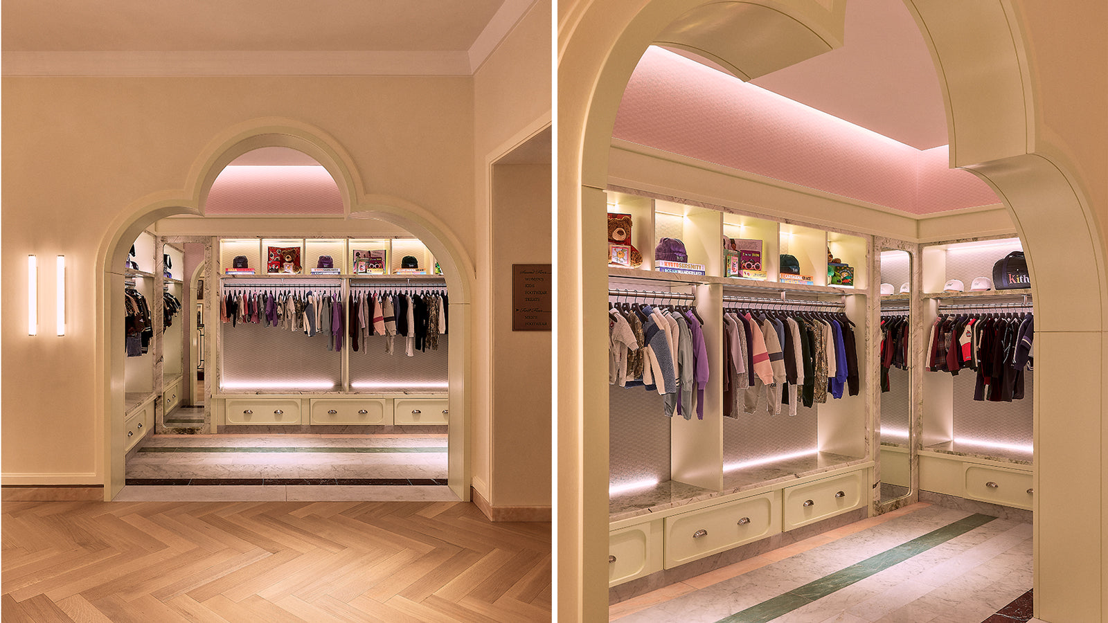 The Women’s Accessories Room is an intimate, soft space lined with tufted wallpaper, custom Rosa Aurora Macchia Vecchia jewelry vitrines and handbag display, and a mosaic tile floor. Throughout the store, guests will find a few more intimate spaces like this, such as the Kid’s Room—distinguished by its signature cloud motif archway and multi-colored stone flooring. And lastly, Kith Treats is found across the way with dedicated seating, the perfect last stop for visitors to take a beat and enjoy the view of the store.
