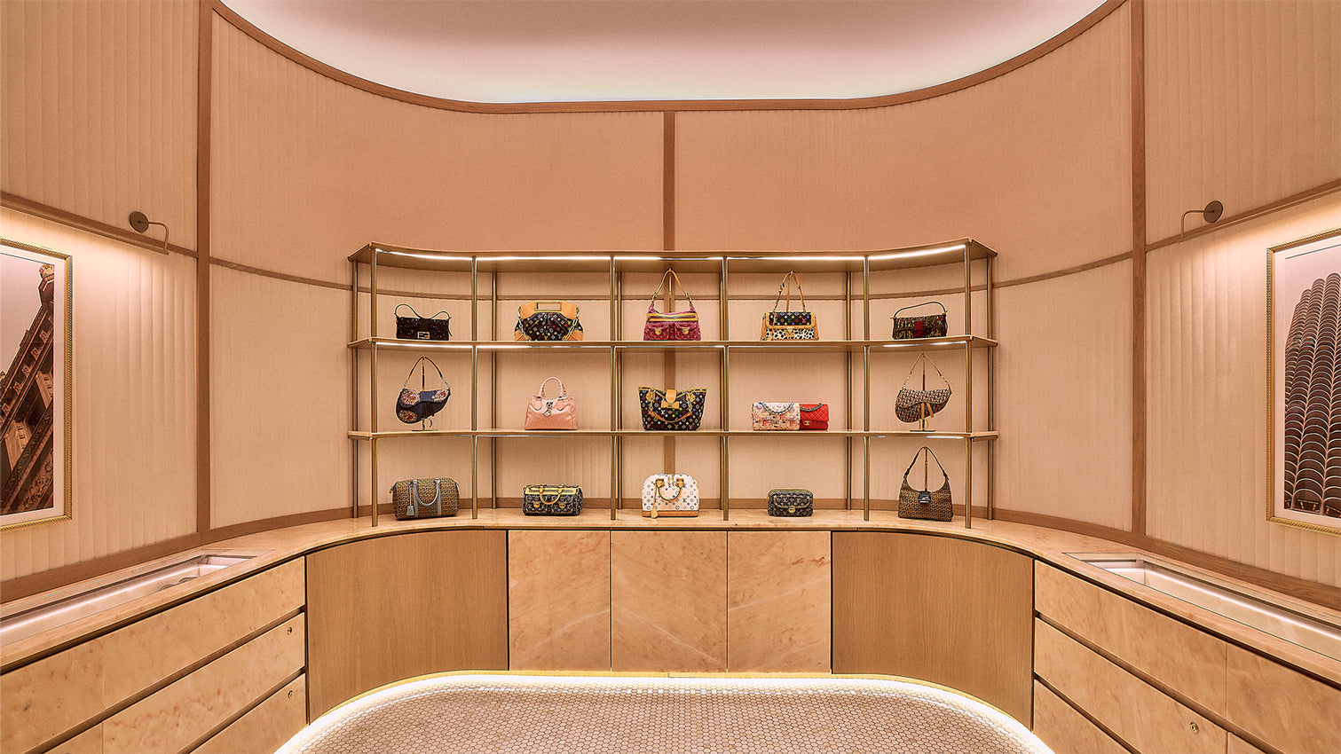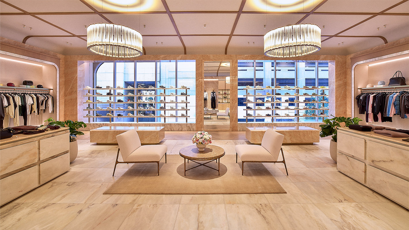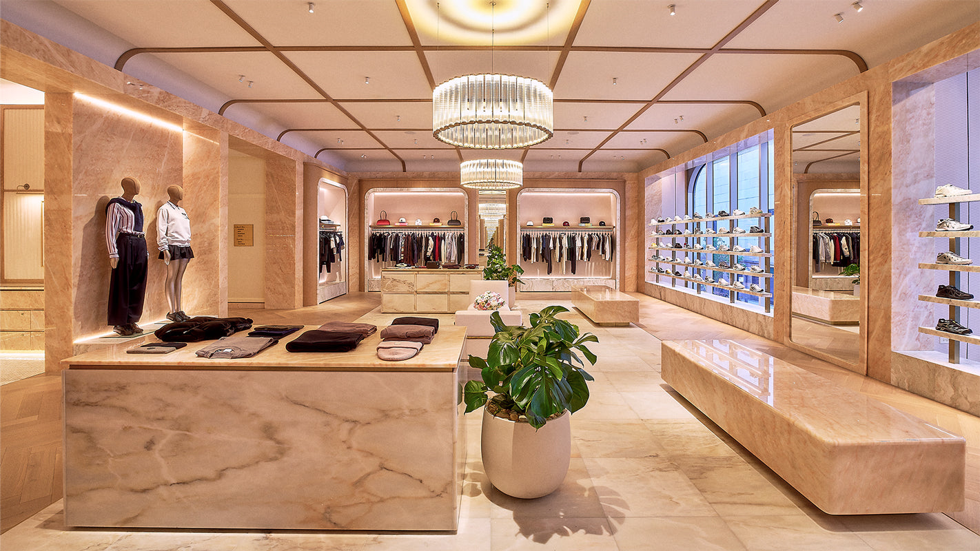 The second floor is dedicated to Kith Women, additional women’s brands, footwear, and Kith Kids, featuring a lighter space that contrasts the men’s floor. Adorning the top of the staircase is a custom chandelier centerpiece consisting of over thirty-times individual pendants hanging in a helix formation, captivating guests and evoking a new feeling upon entering into the women’s space. Visitors are charmed with the oak trimmed lime wash ceilings, Rosa Aurora Macchia Vecchia marble lined walls, and Rosa Aurora floor inset with an oak herringbone band. The apparel niches along the perimeter of the room are made of custom oak millwork embellished with Verde Jasmine marble frames. Displayed against the large store front windows is Women’s footwear and just opposite of it is a room dedicated to Women’s handbags and accessories.