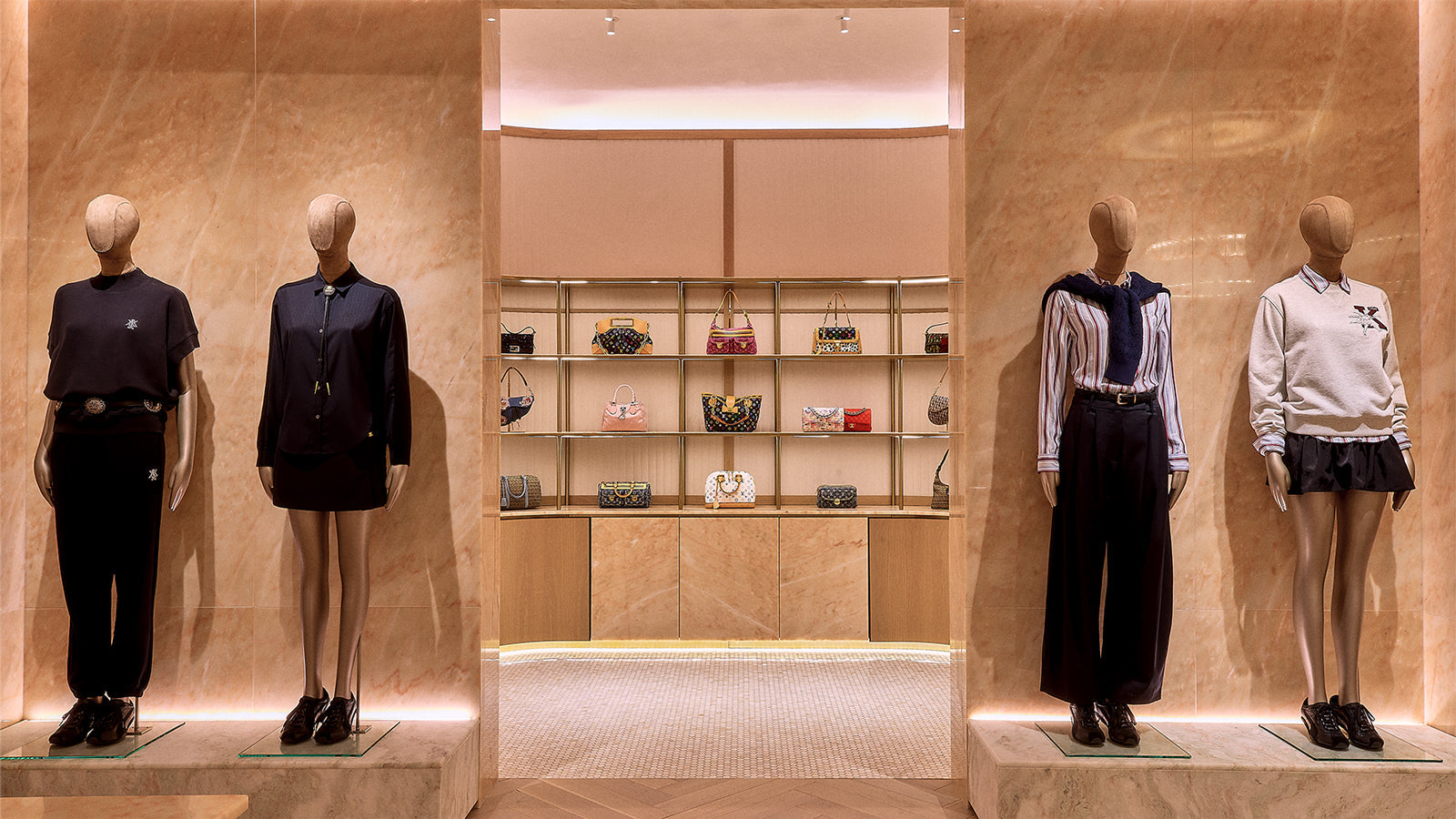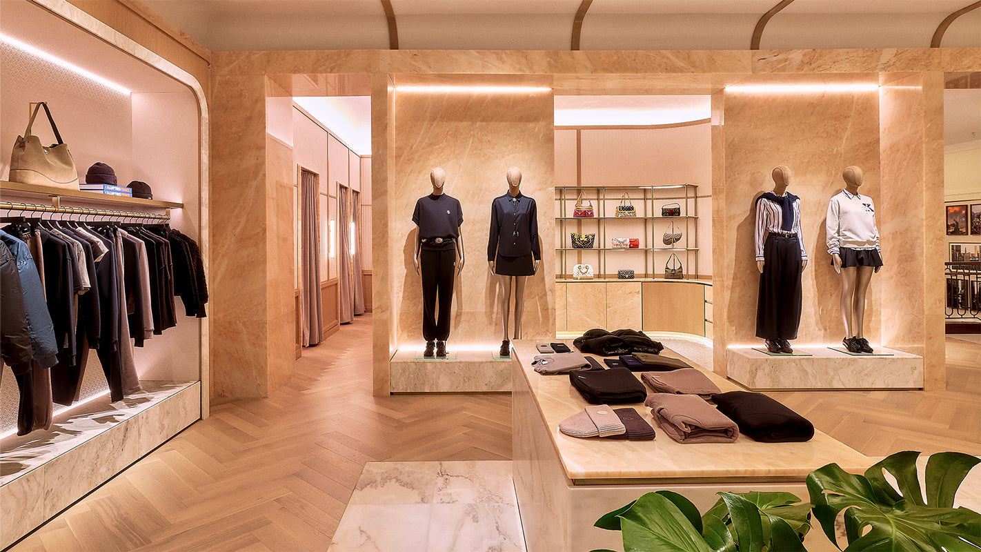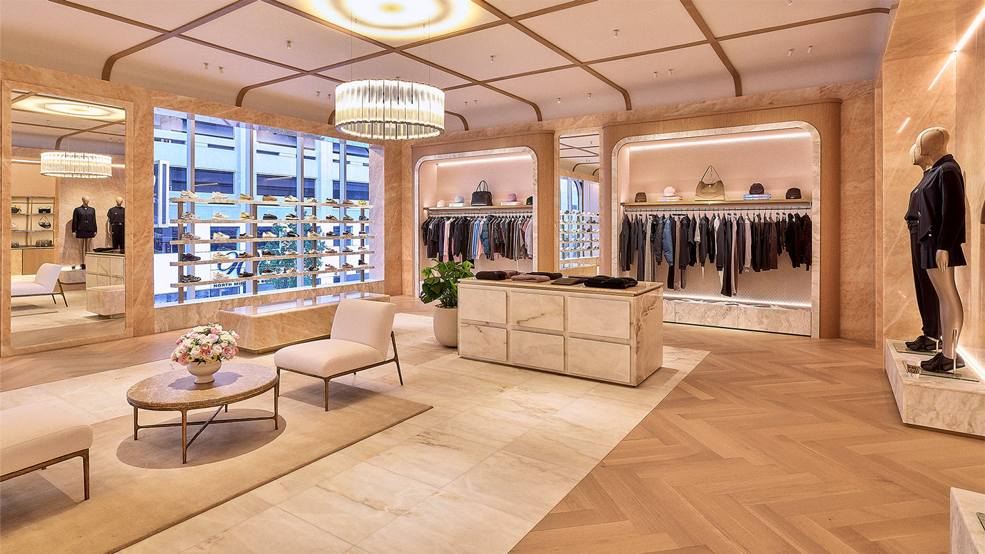 The second floor is dedicated to Kith Women, additional women’s brands, footwear, and Kith Kids, featuring a lighter space that contrasts the men’s floor. Adorning the top of the staircase is a custom chandelier centerpiece consisting of over thirty-times individual pendants hanging in a helix formation, captivating guests and evoking a new feeling upon entering into the women’s space. Visitors are charmed with the oak trimmed lime wash ceilings, Rosa Aurora Macchia Vecchia marble lined walls, and Rosa Aurora floor inset with an oak herringbone band. The apparel niches along the perimeter of the room are made of custom oak millwork embellished with Verde Jasmine marble frames. Displayed against the large store front windows is Women’s footwear and just opposite of it is a room dedicated to Women’s handbags and accessories.