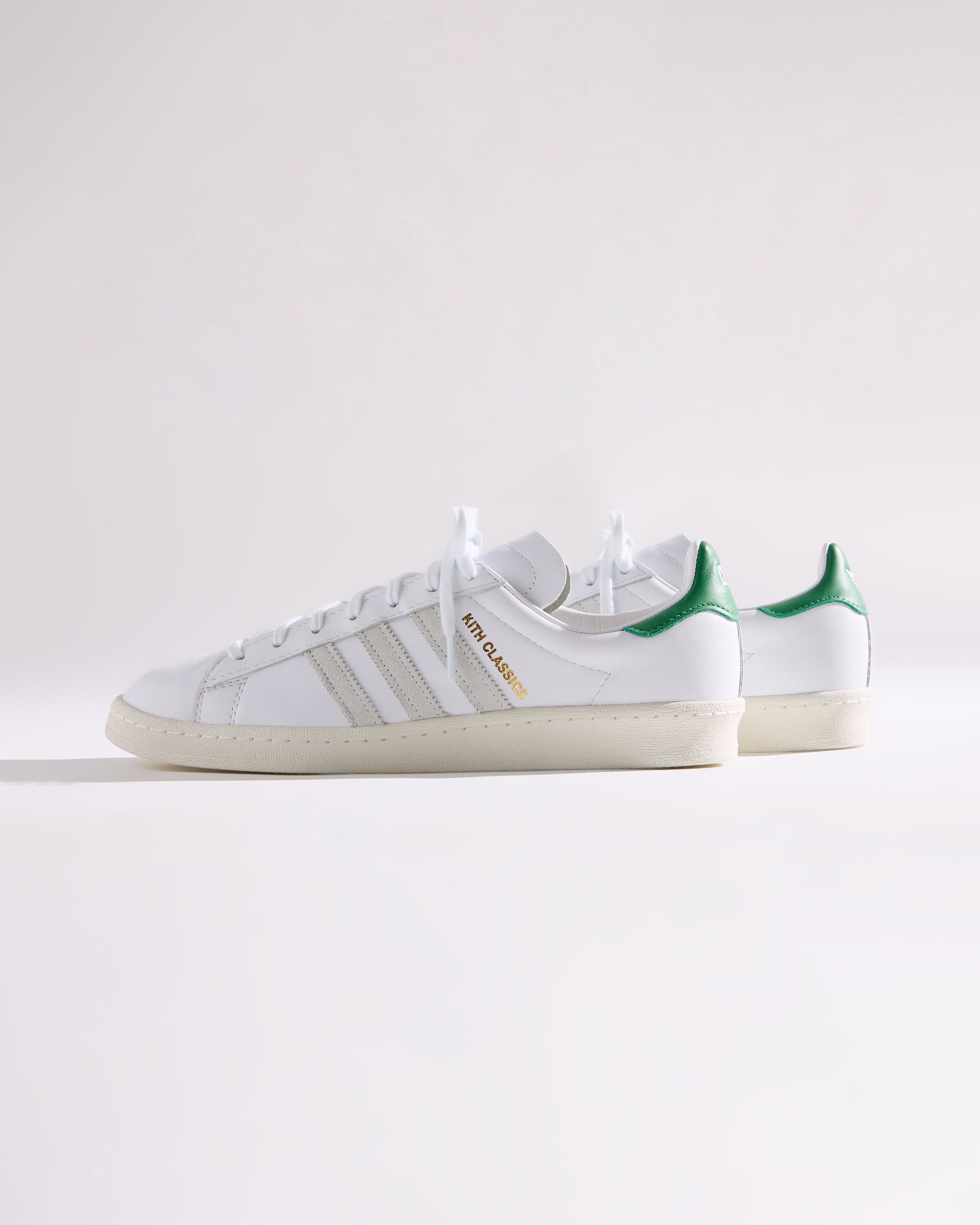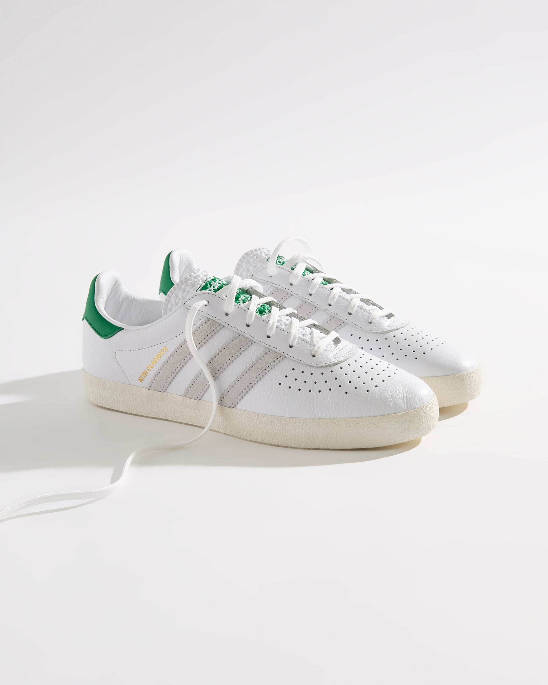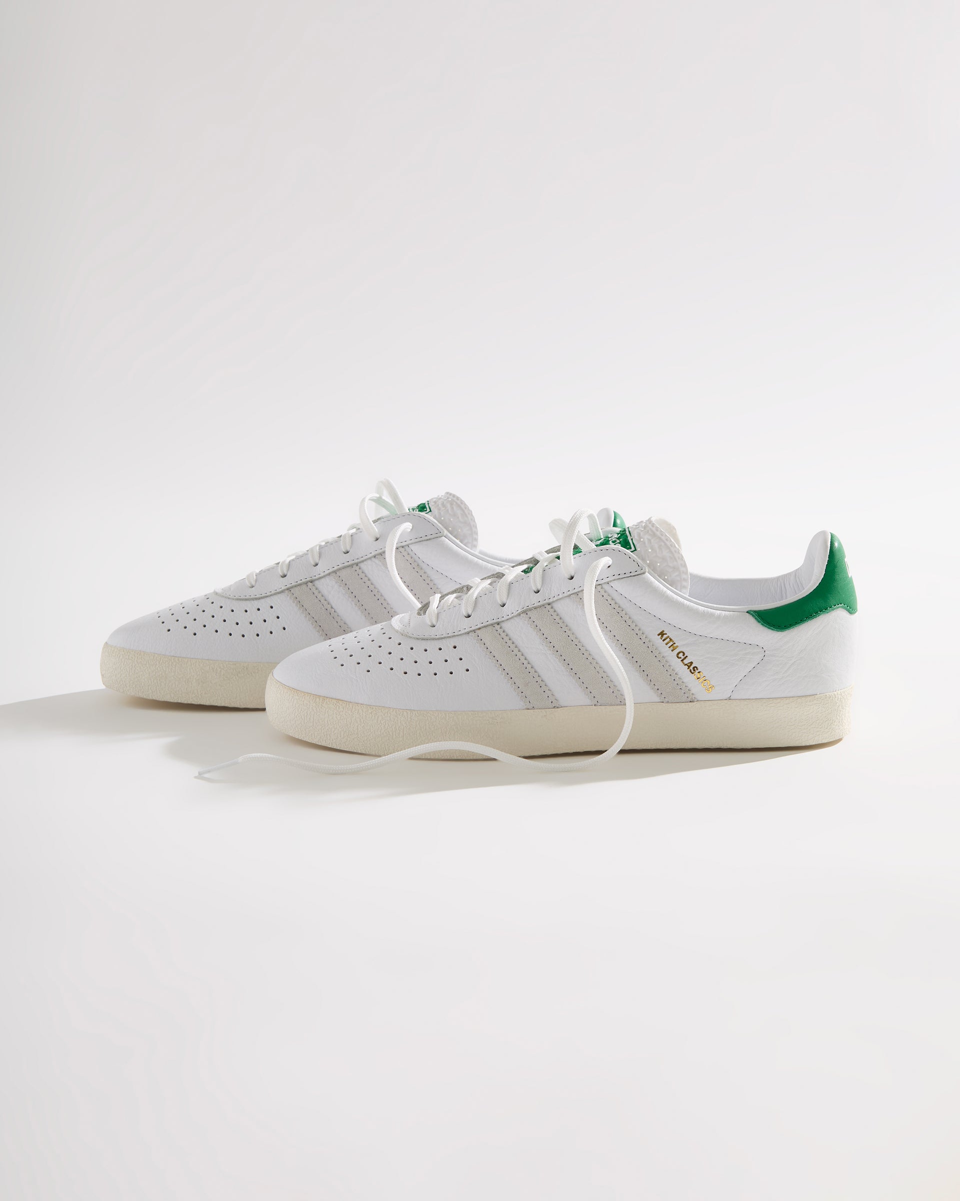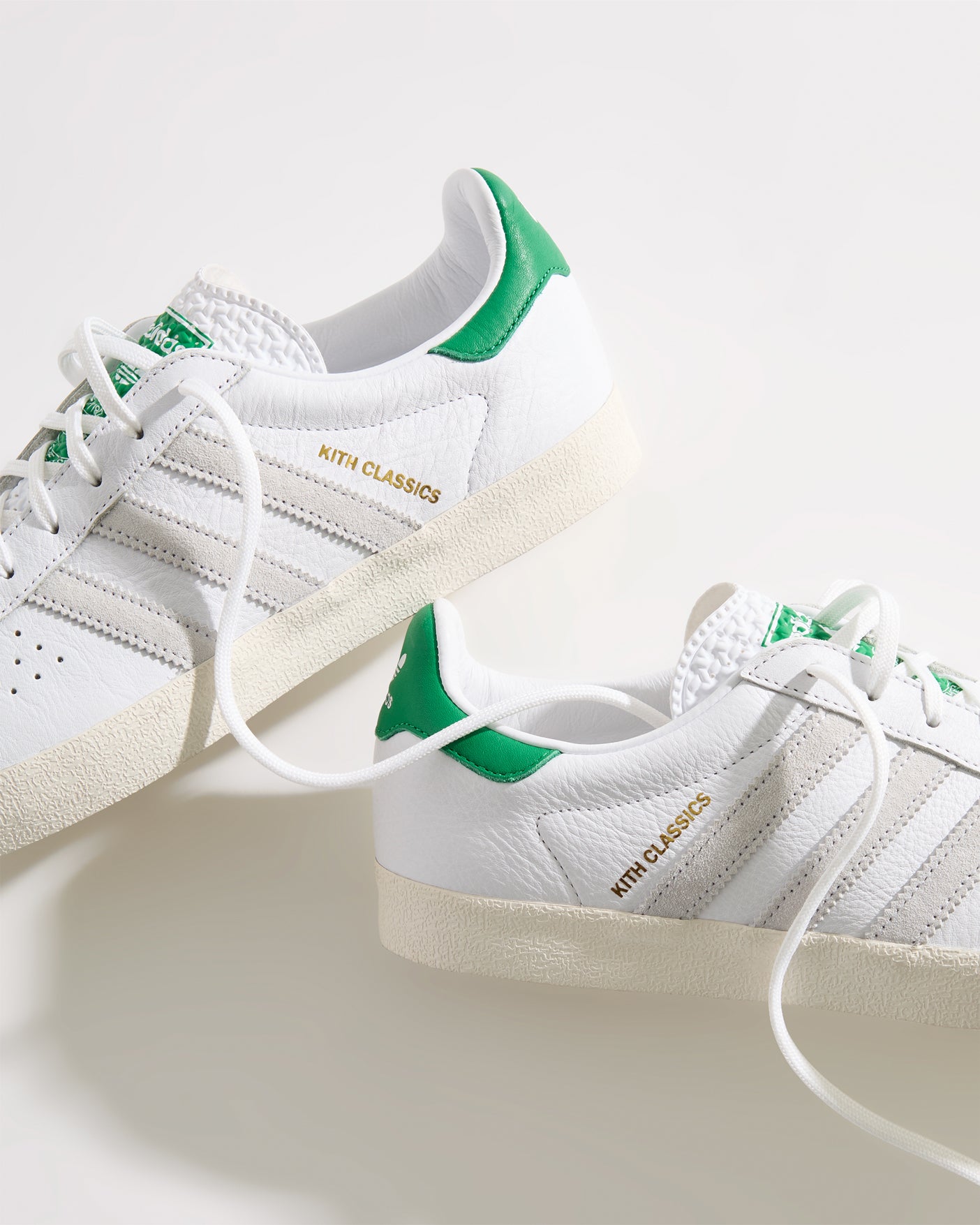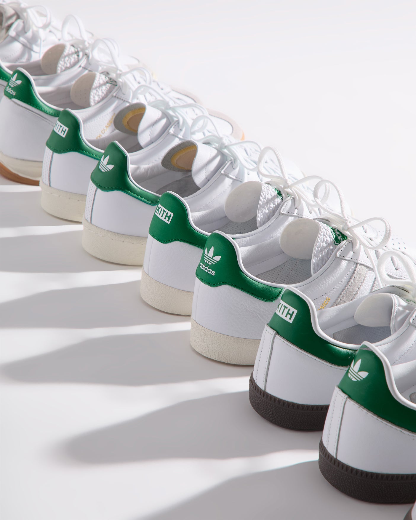 すべてのモデルにプレミアムレザーを使用し、ヒールにはグリーンのKith Classicロゴを配置。一部のモデルには、ゴールドフォイルのKith Classicsブランディングと、スエードのレーザーエッジ加工を施したadidasストライプをあしらいました。