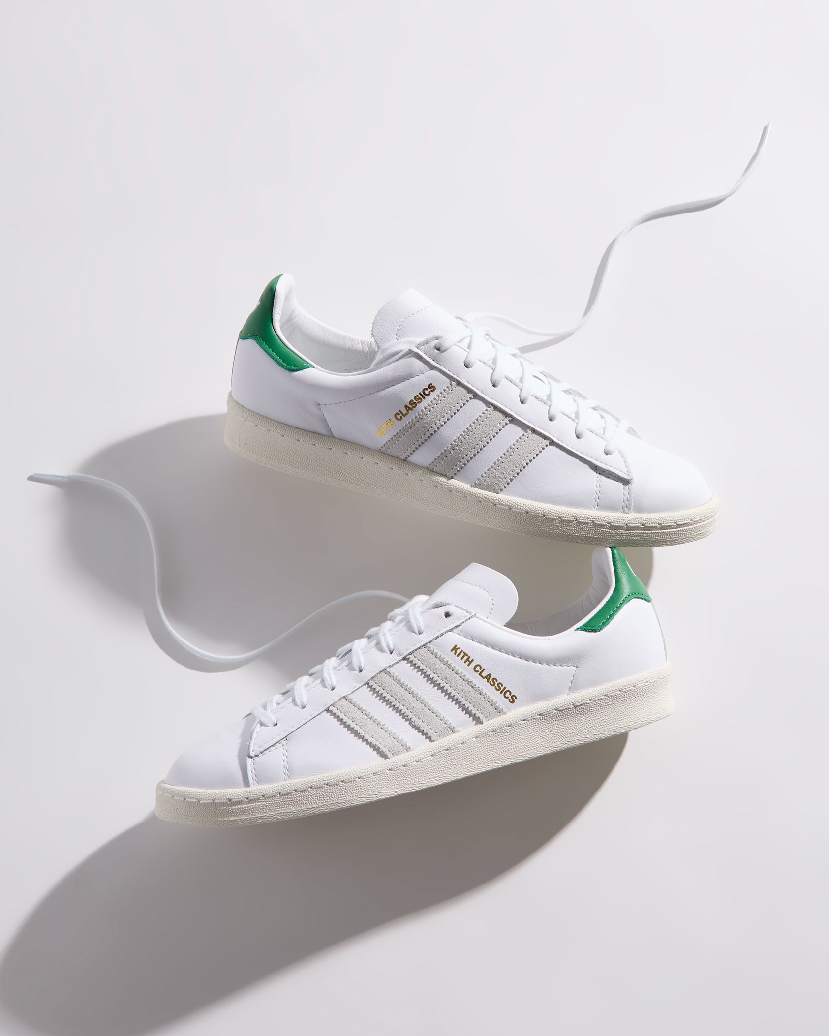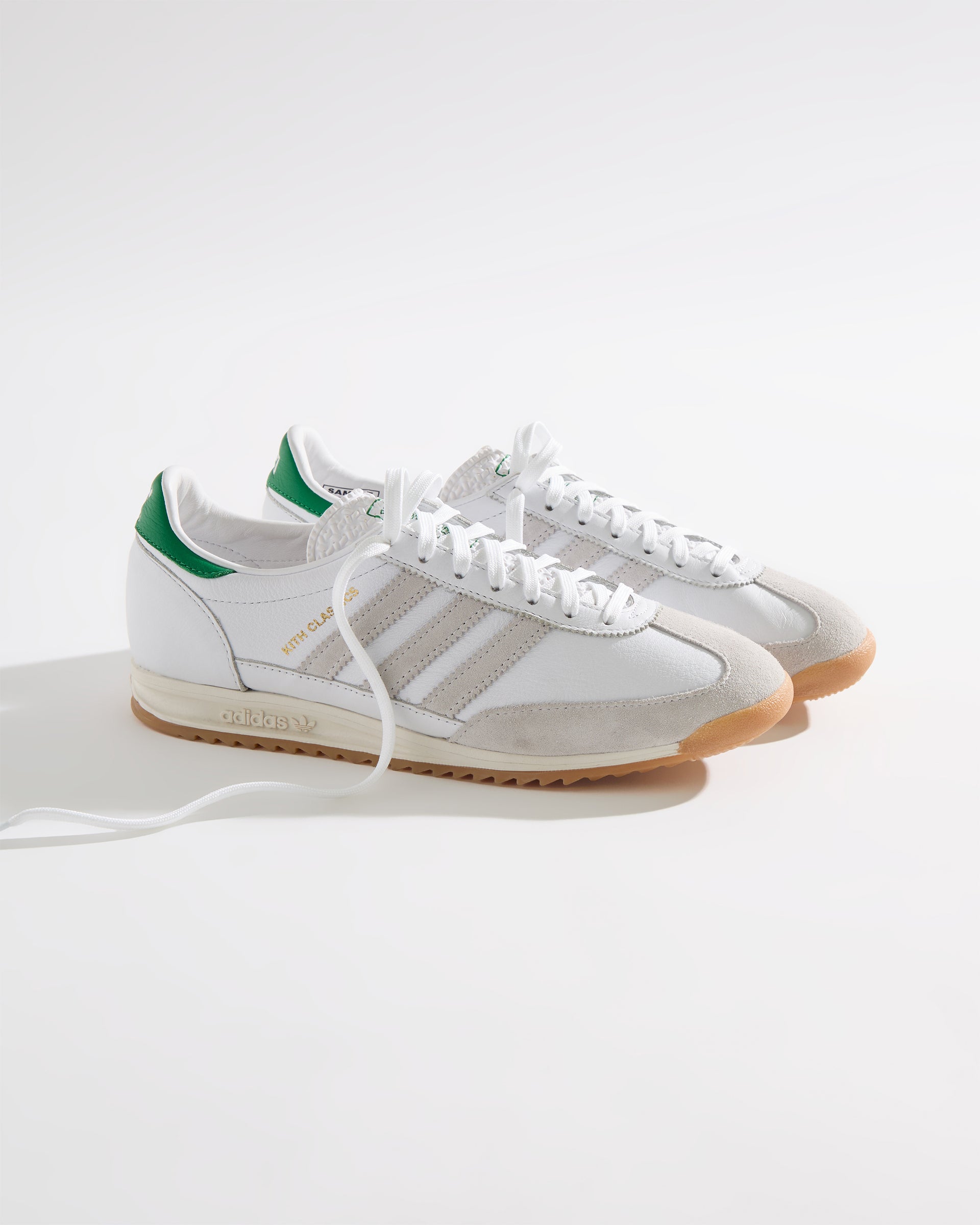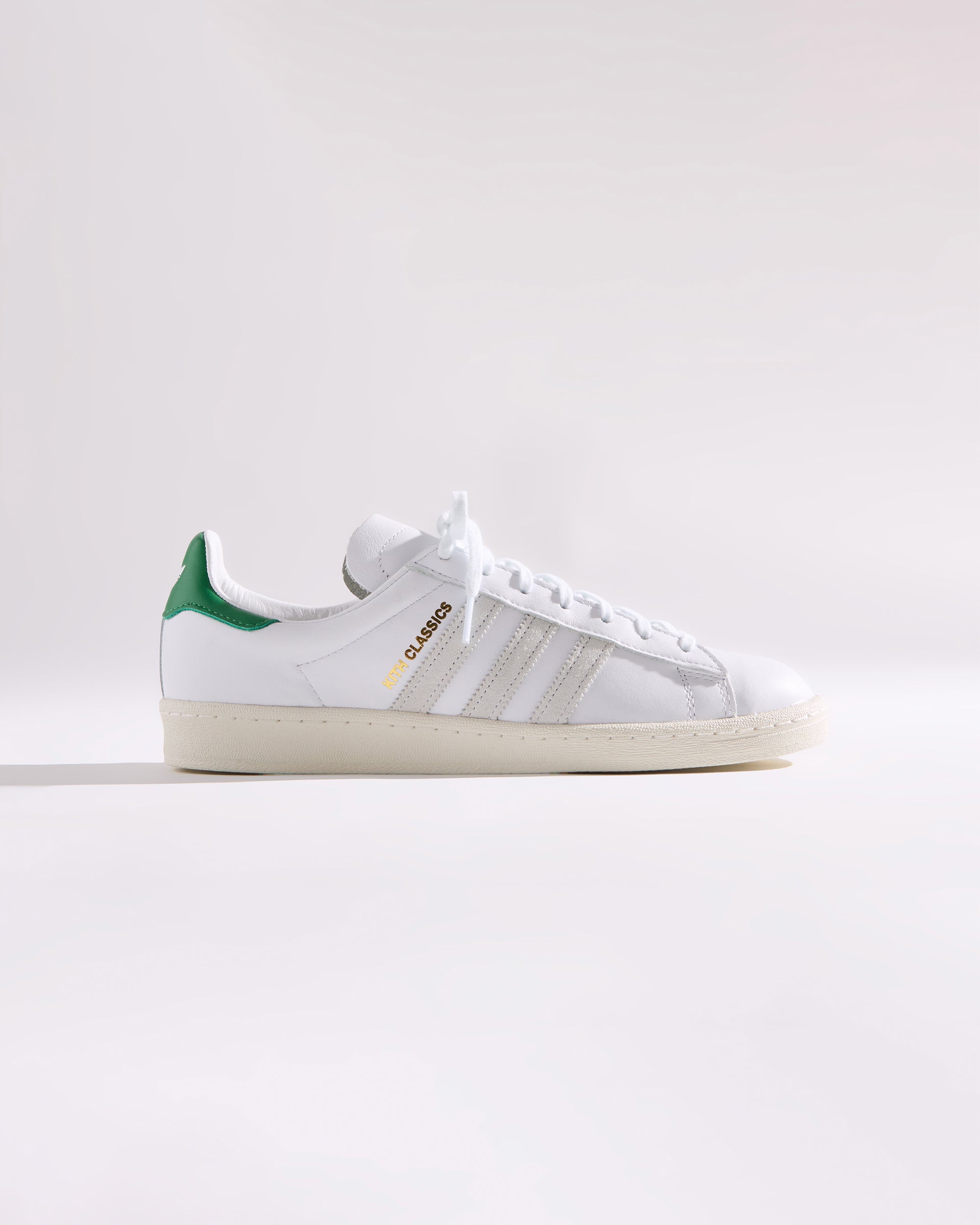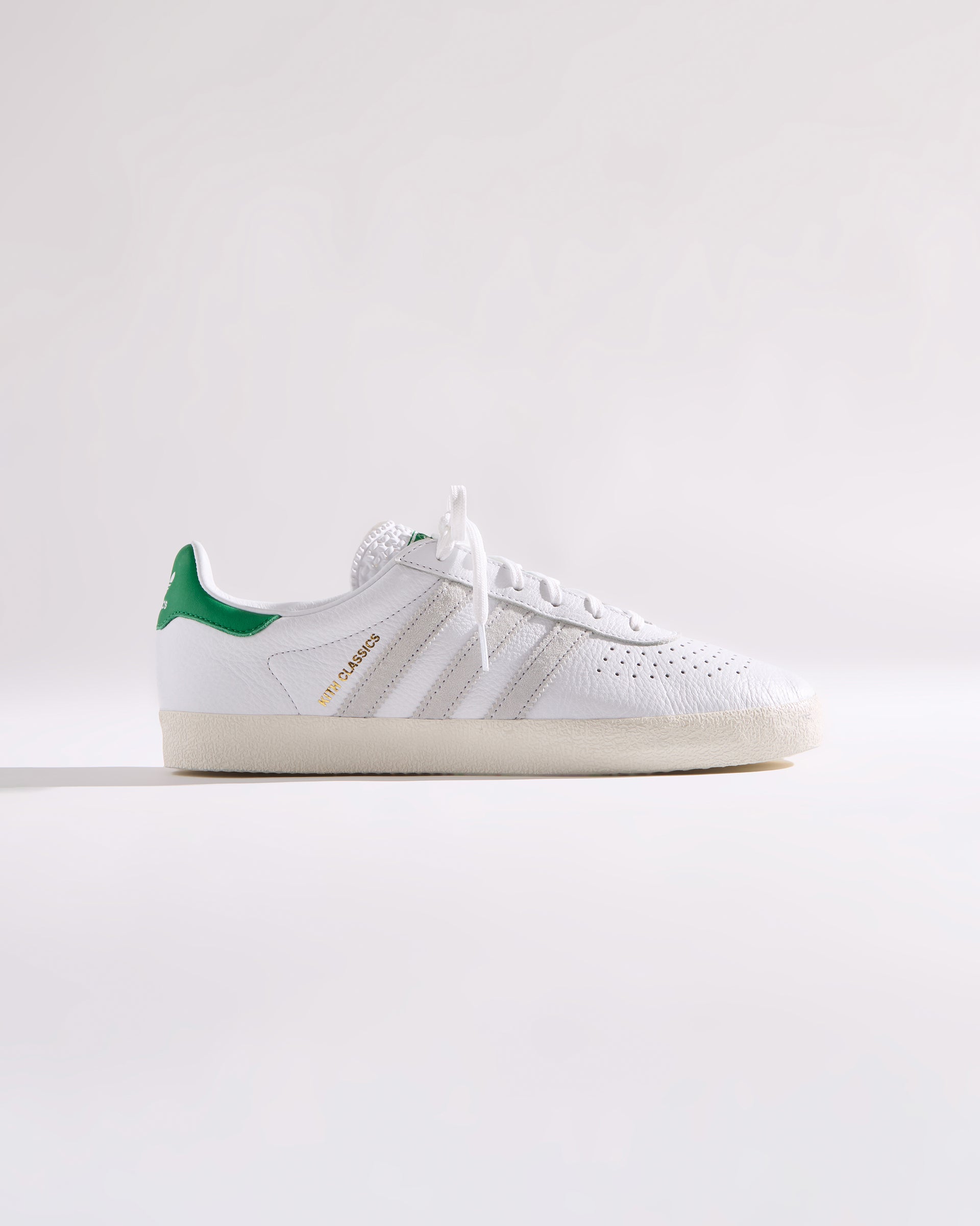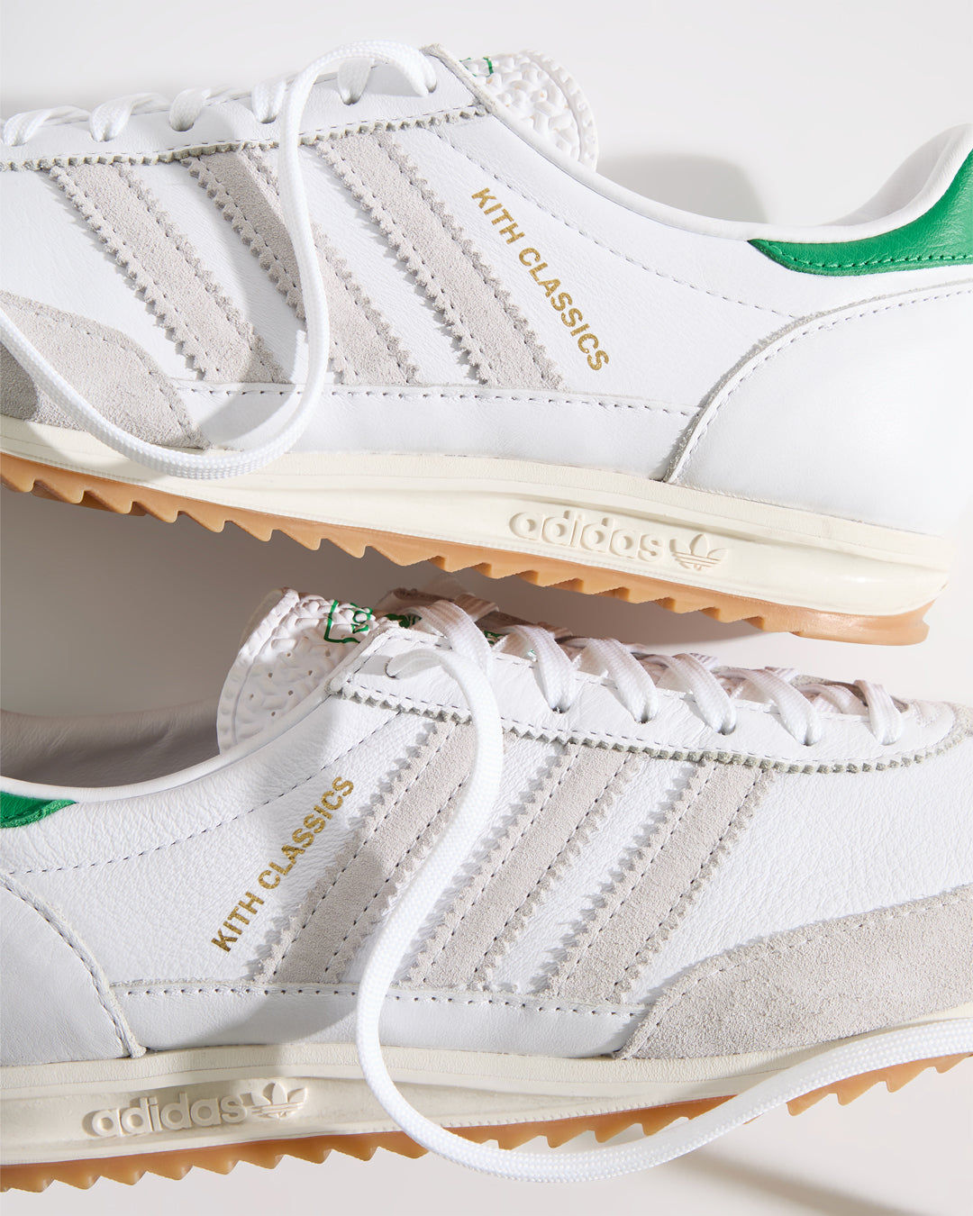 すべてのモデルにプレミアムレザーを使用し、ヒールにはグリーンのKith Classicロゴを配置。一部のモデルには、ゴールドフォイルのKith Classicsブランディングと、スエードのレーザーエッジ加工を施したadidasストライプをあしらいました。