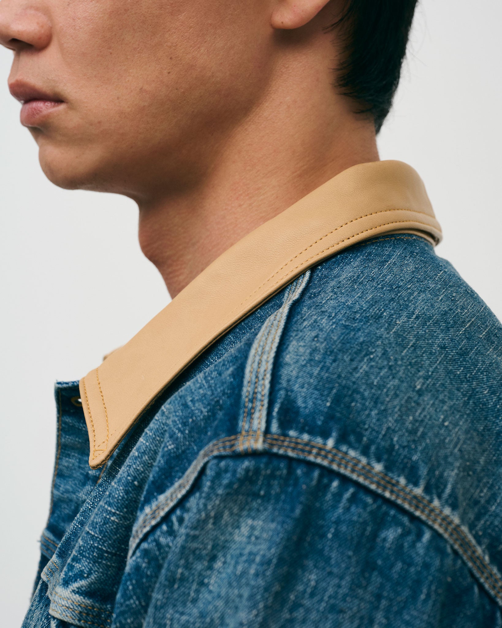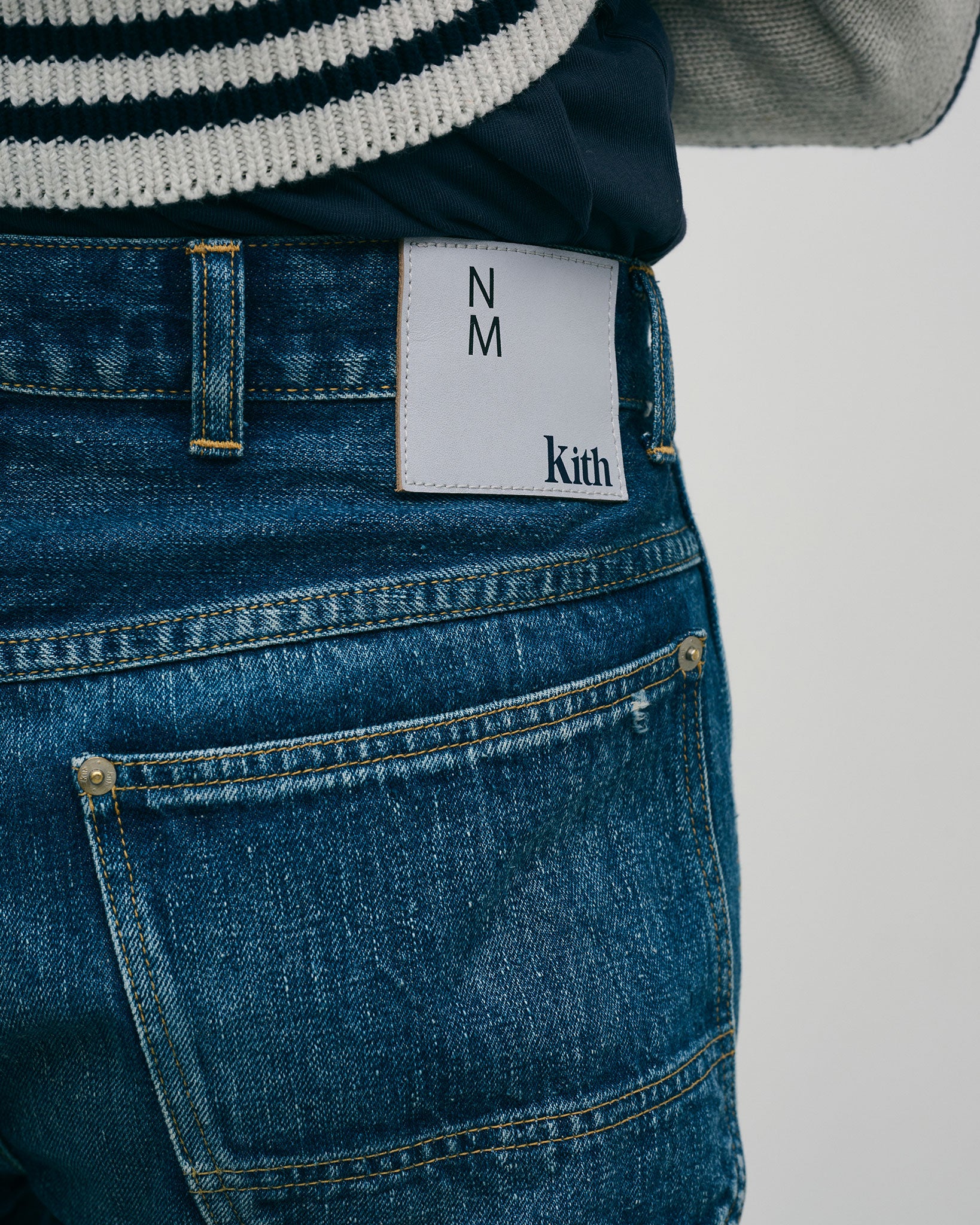 The denim jacket takes cues from the early cowboy jacket style, featuring a singlepocket and a buckle detail on the back.The standout feature lies in New Manual's processing techniques. The sleeves are finished with meticulous attention to color variation, and the overall fade highlights a balanced contrast. The collar is crafted with deerskin, adding a touch of luxury that reflects Kith’s signature style. As a unique collaboration detail, only the left sleeve features New Manual's original button.