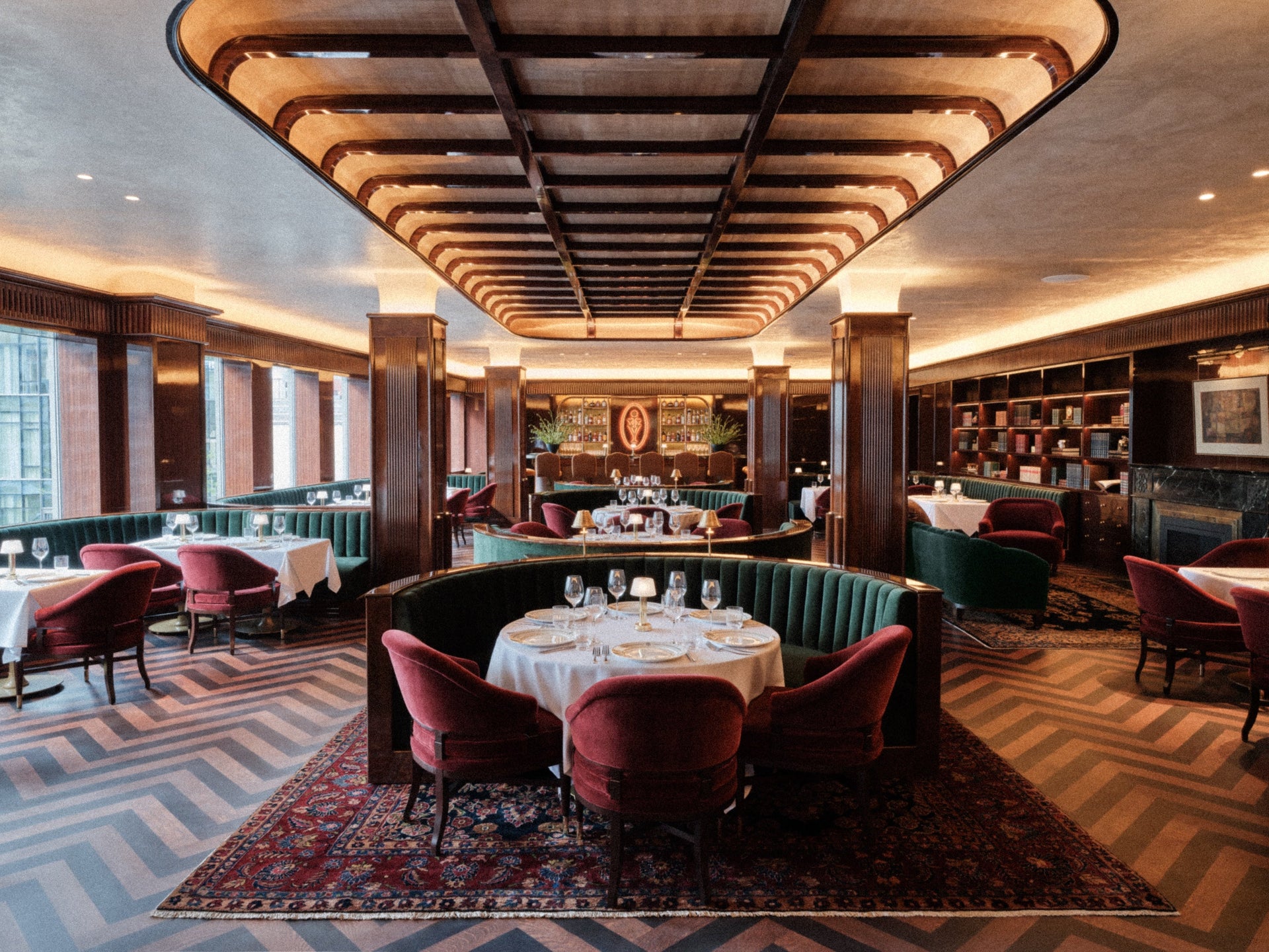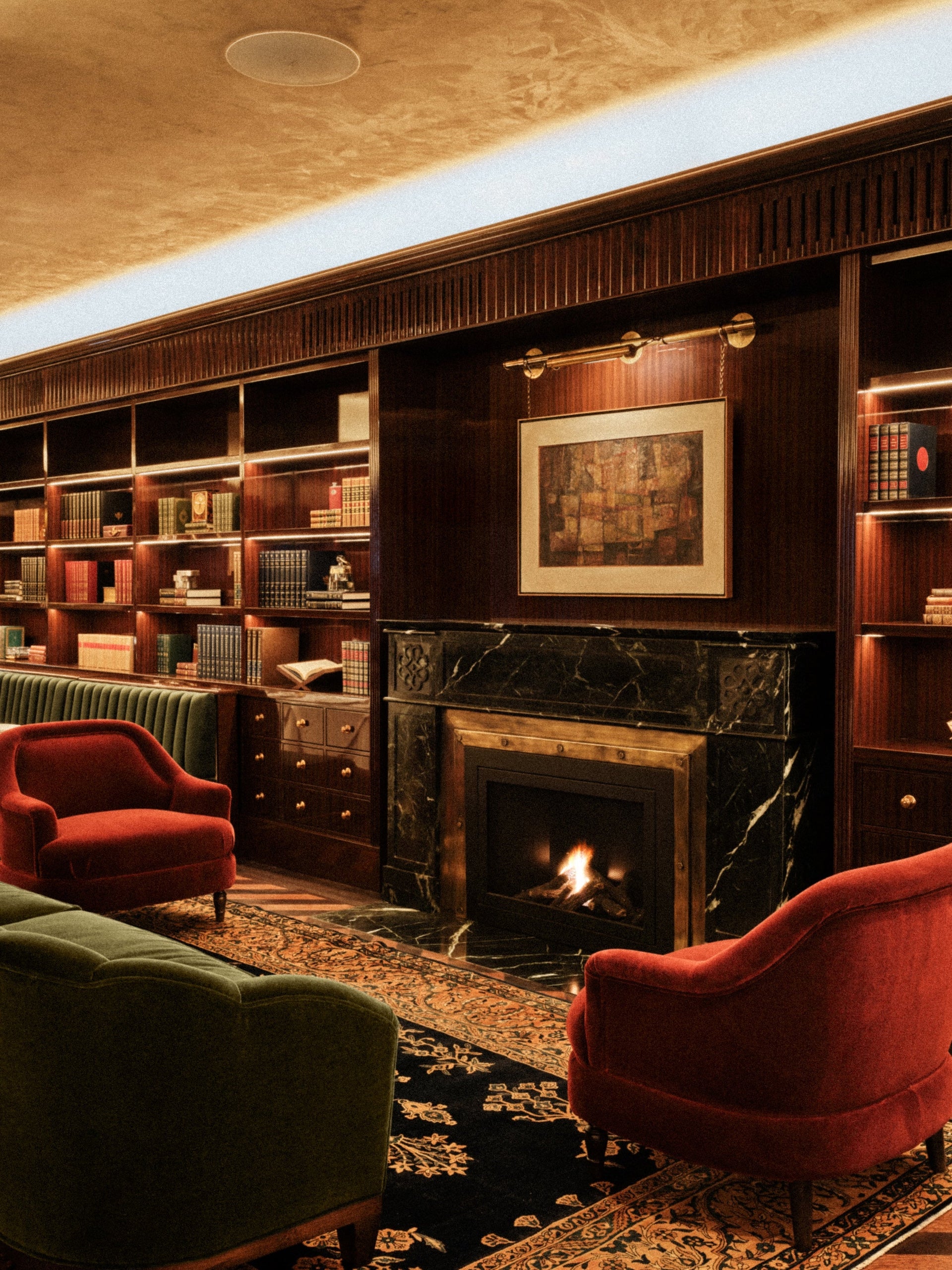 この取り組みは、各分野の革新者であるパートナーの存在によって実現しました。ダイニングでは、ニューヨークの名店 Cafe Mogador と提携し、クラシックな料理に新たな視点を加えた、モロッコにインスピレーションを得た地中海料理の新しいメニューとサービスを提供します。インテリアには、ヴィンテージのペルシャ絨毯が用いられ、温かみと個性を加えるとともに、深みのあるローズウッドのアクセントや、グリーンとバーガンディを基調としたカラーパレットが招き入れるような空間を作り出しています。中央には暖炉が設けられ、その周囲を厳選された書籍やオブジェを収めた書棚が囲み、家庭的な雰囲気を演出しています。