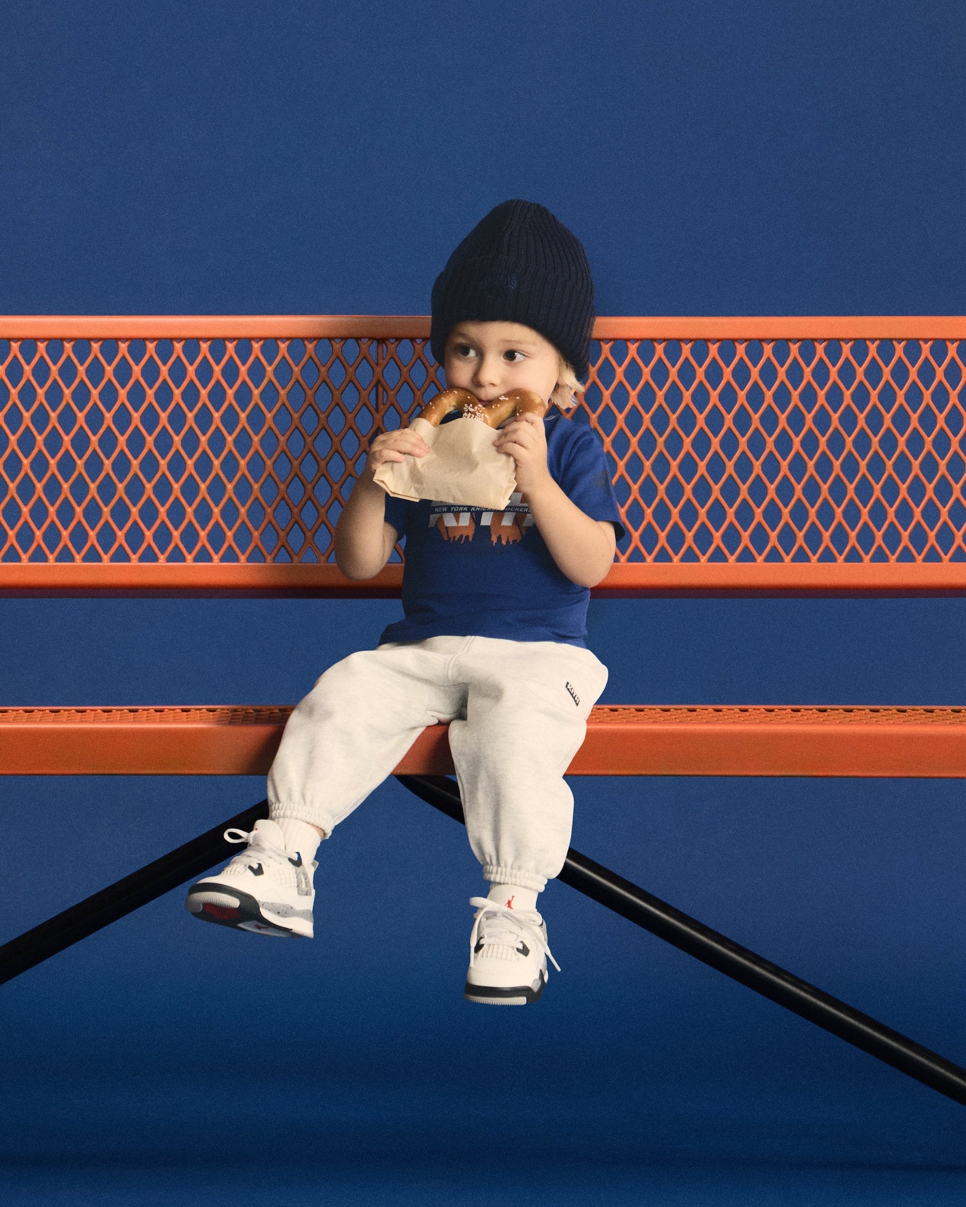 今季は、キッズサイズで展開される Kith Kids のコレクションも登場。ラインナップには、Tシャツ、ボディスーツ、Nelson Hoodie & Crewneck、刺繍入りビーニーが揃い、メインコレクションと同じカラーパレットで構成されています。ヴィンテージとモダンの両方のタイポグラフィを特徴とし、コート中央に描かれるチームロゴのアートワークを、Kith のレタリングで再構築。 “New York to the World” のクラシックなモチーフをコレクションの随所に配しました。