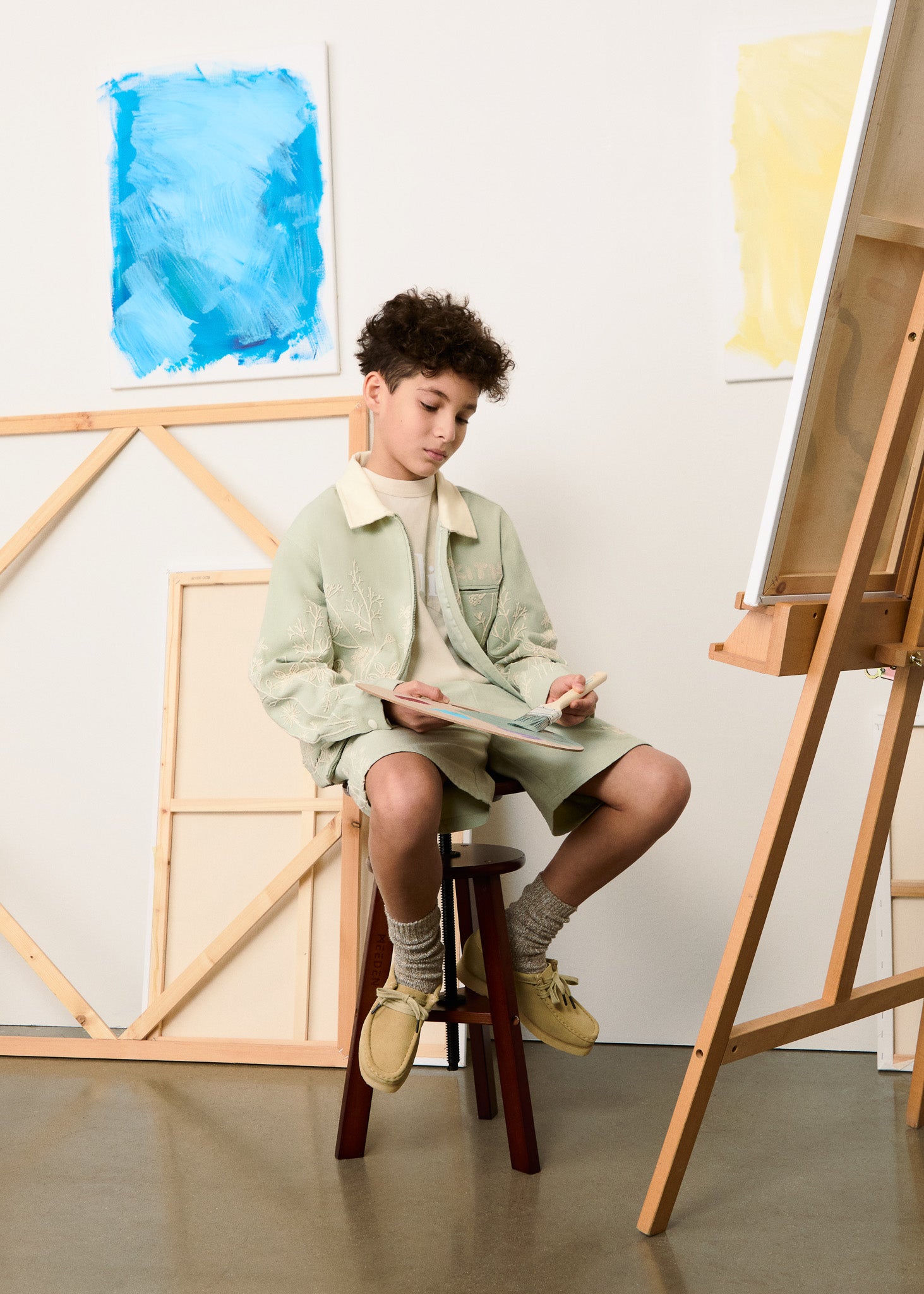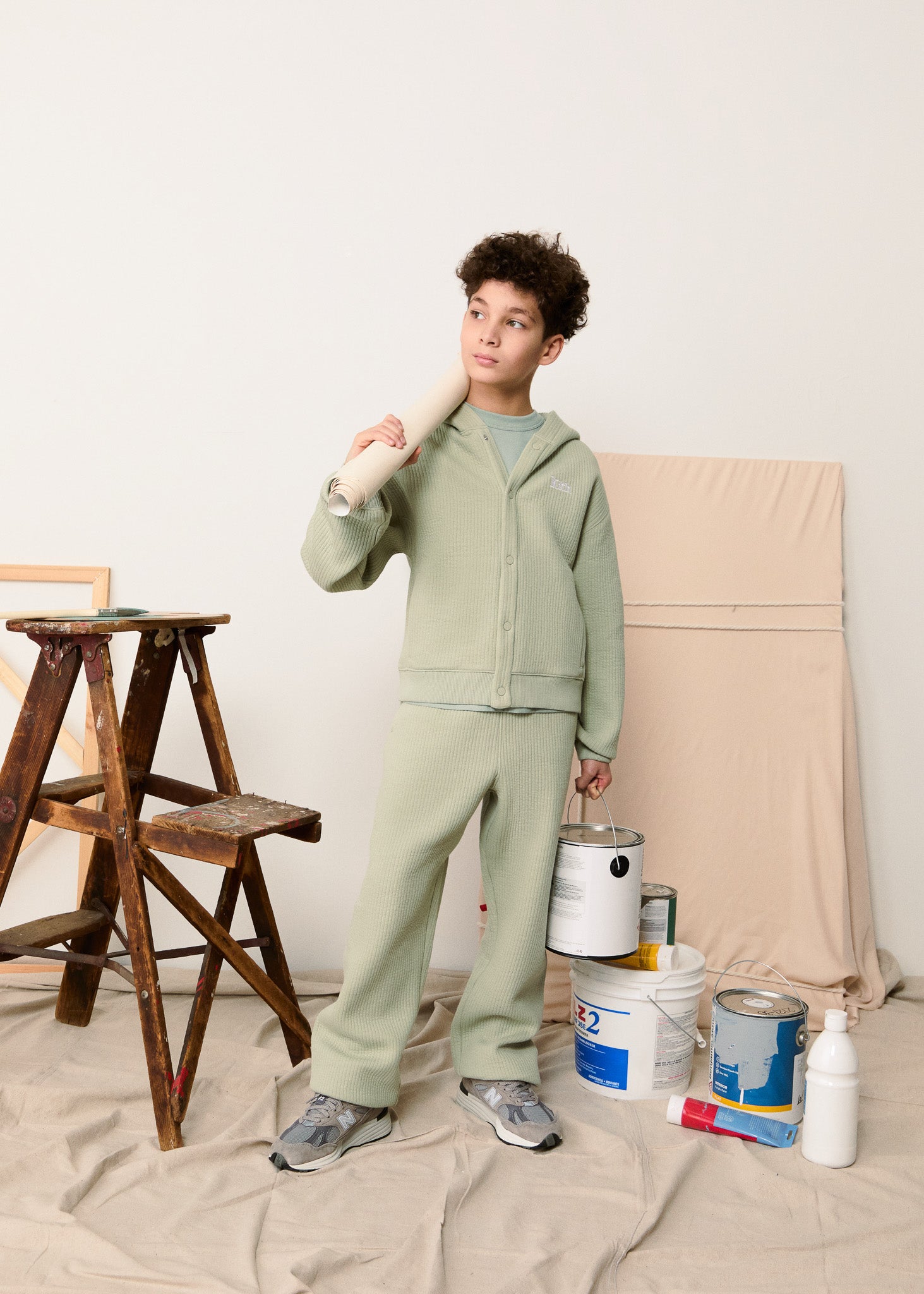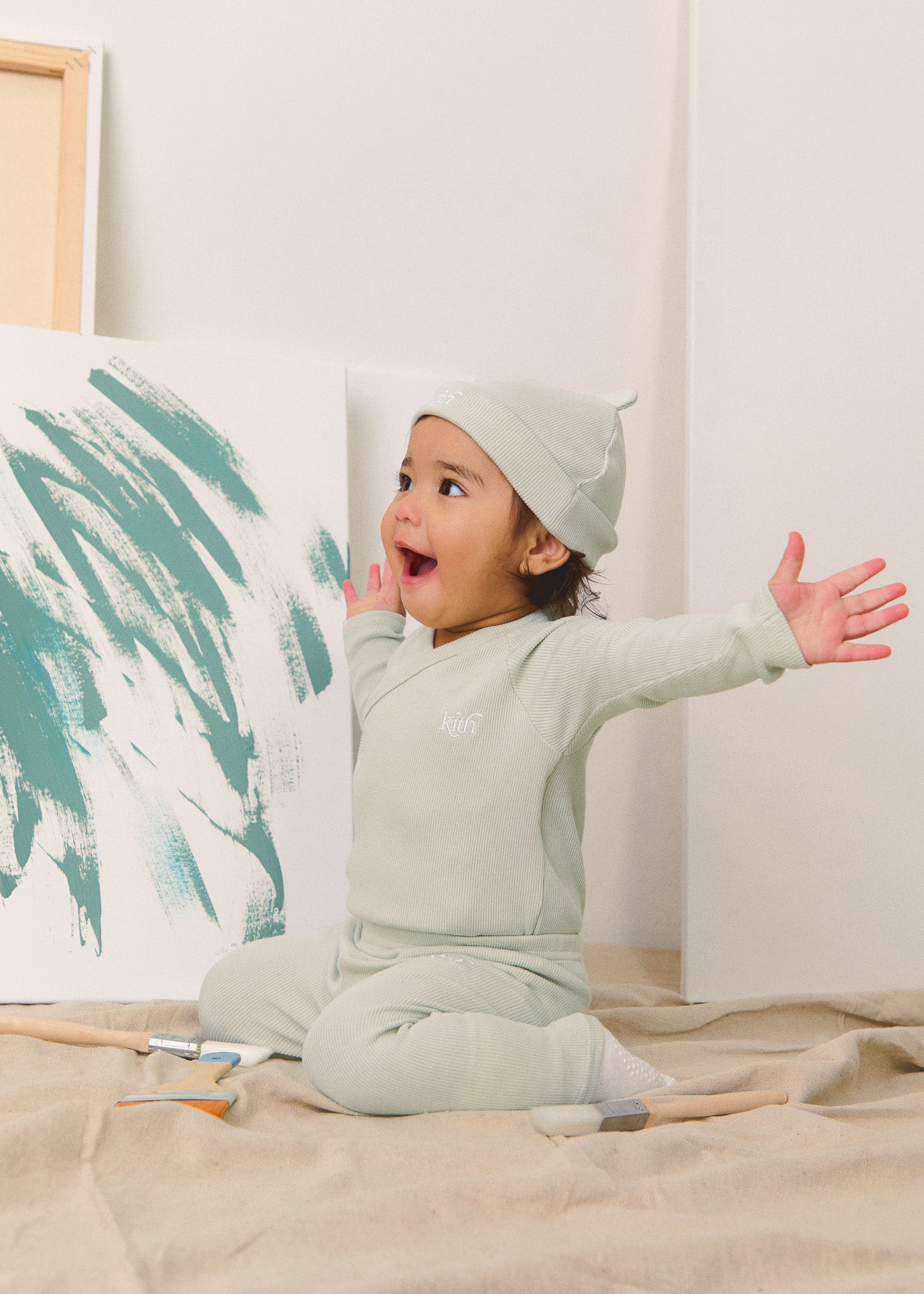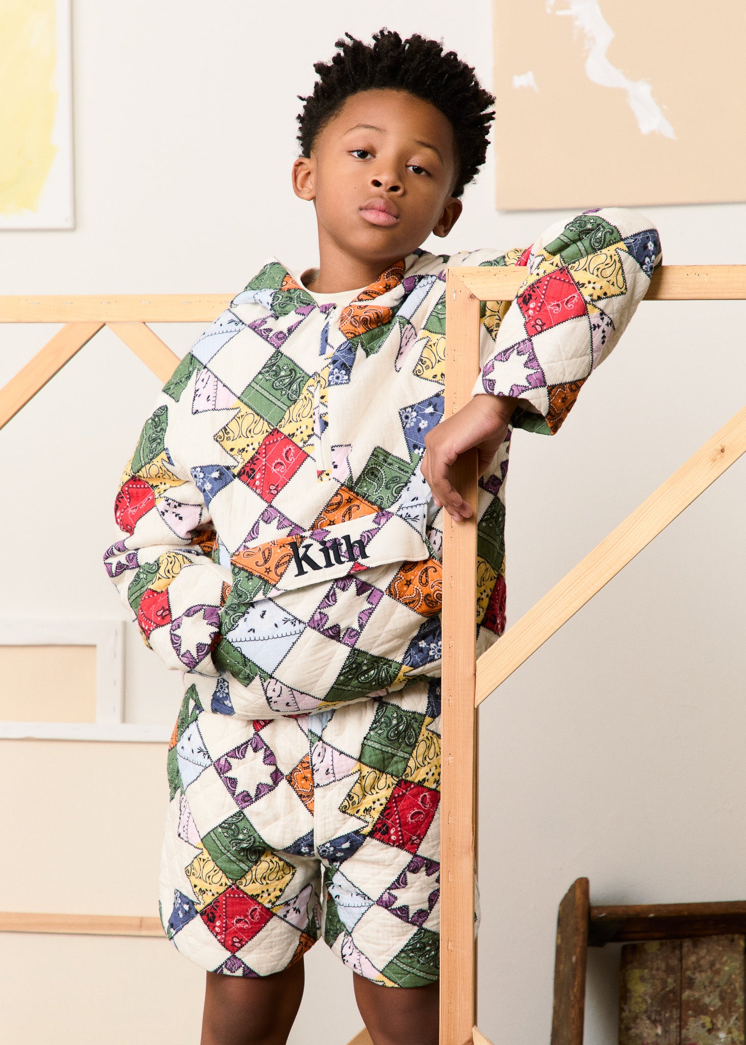 本コレクションでは、フローラル、パッチワーク、ペイズリー、カラーブロックを取り入れた新作デザインが登場。Kith Kids Spring 2025のカラーパレットは、Sandrift、Nocturnal、Genesisといったベーシックカラーに加え、Mint Green、Farrow Blue、Echo Purpleといった春らしい淡いパステルトーンを採用しました。また、ポリエステルサテン、軽量コットンキャンバス、コットンガーゼ、コットンブラッシュドフリースなどの素材を使用し、これからの季節に最適な快適でトランジショナルな着心地を実現しました。