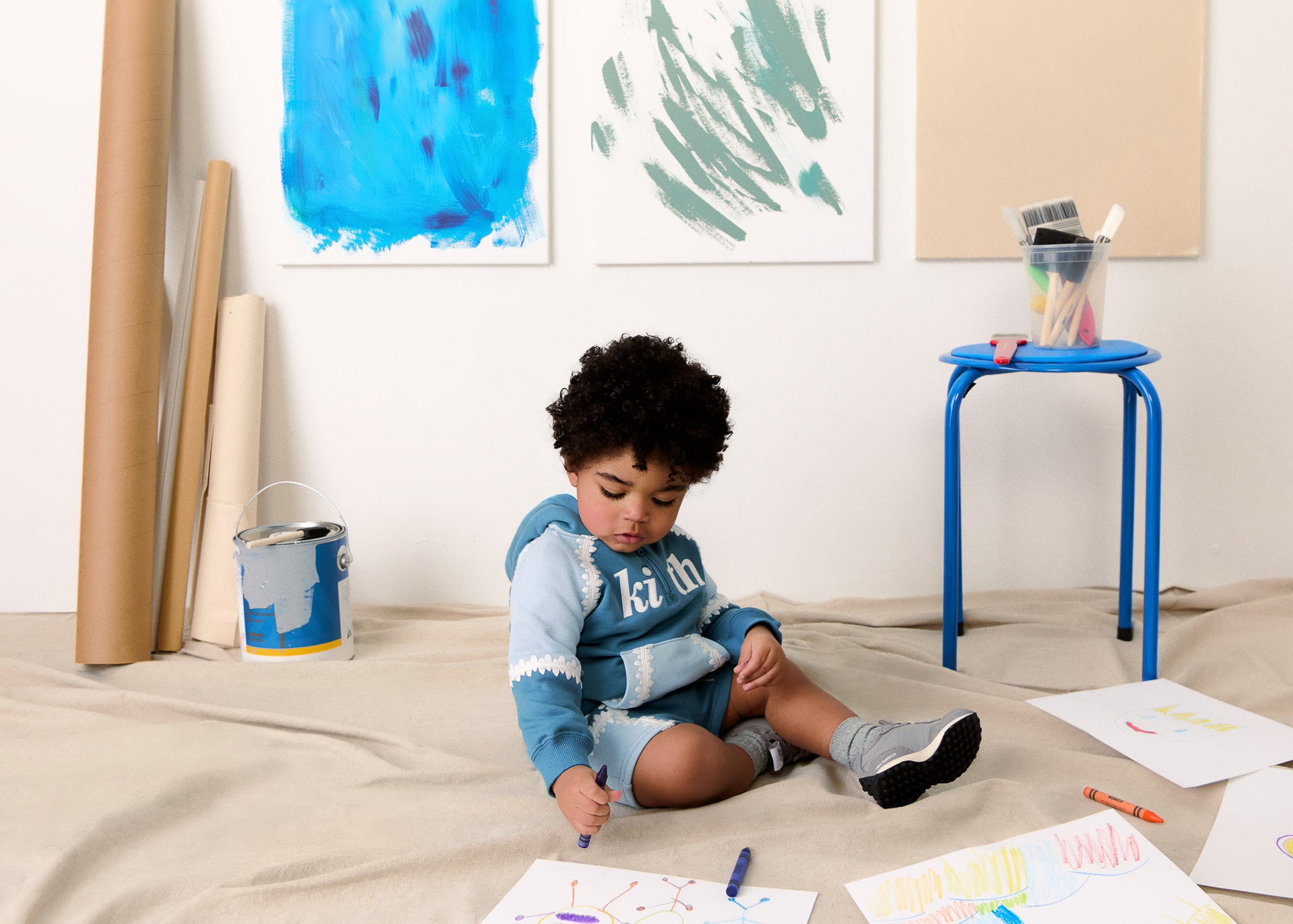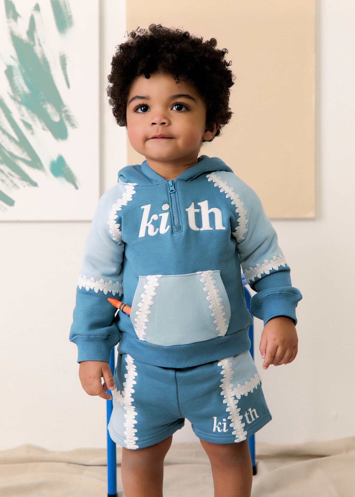 Kith Baby’s seasonal collection includes a selection of outerwear, hoodies, crewnecks, shirts, shorts, pants, coveralls, bodysuits and more that match Kith Kids designs.
