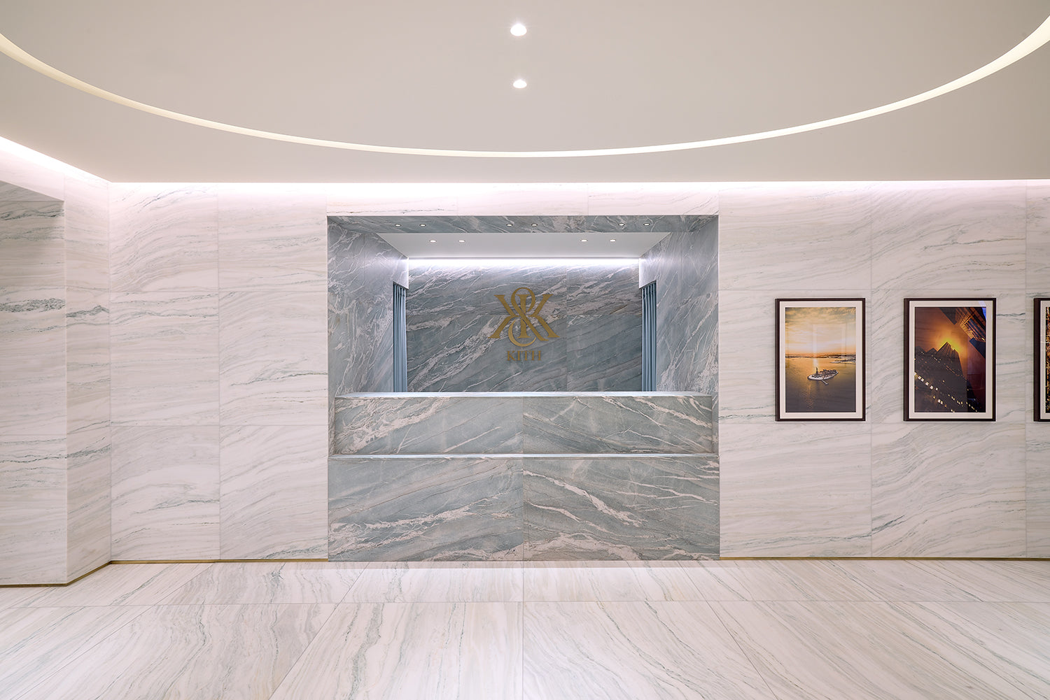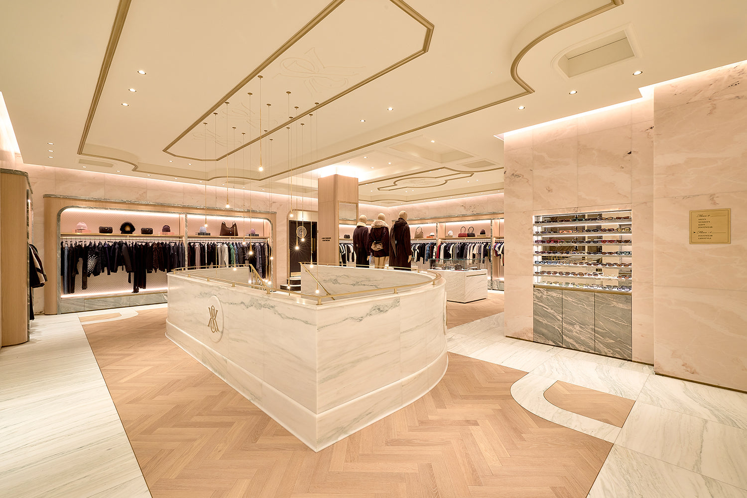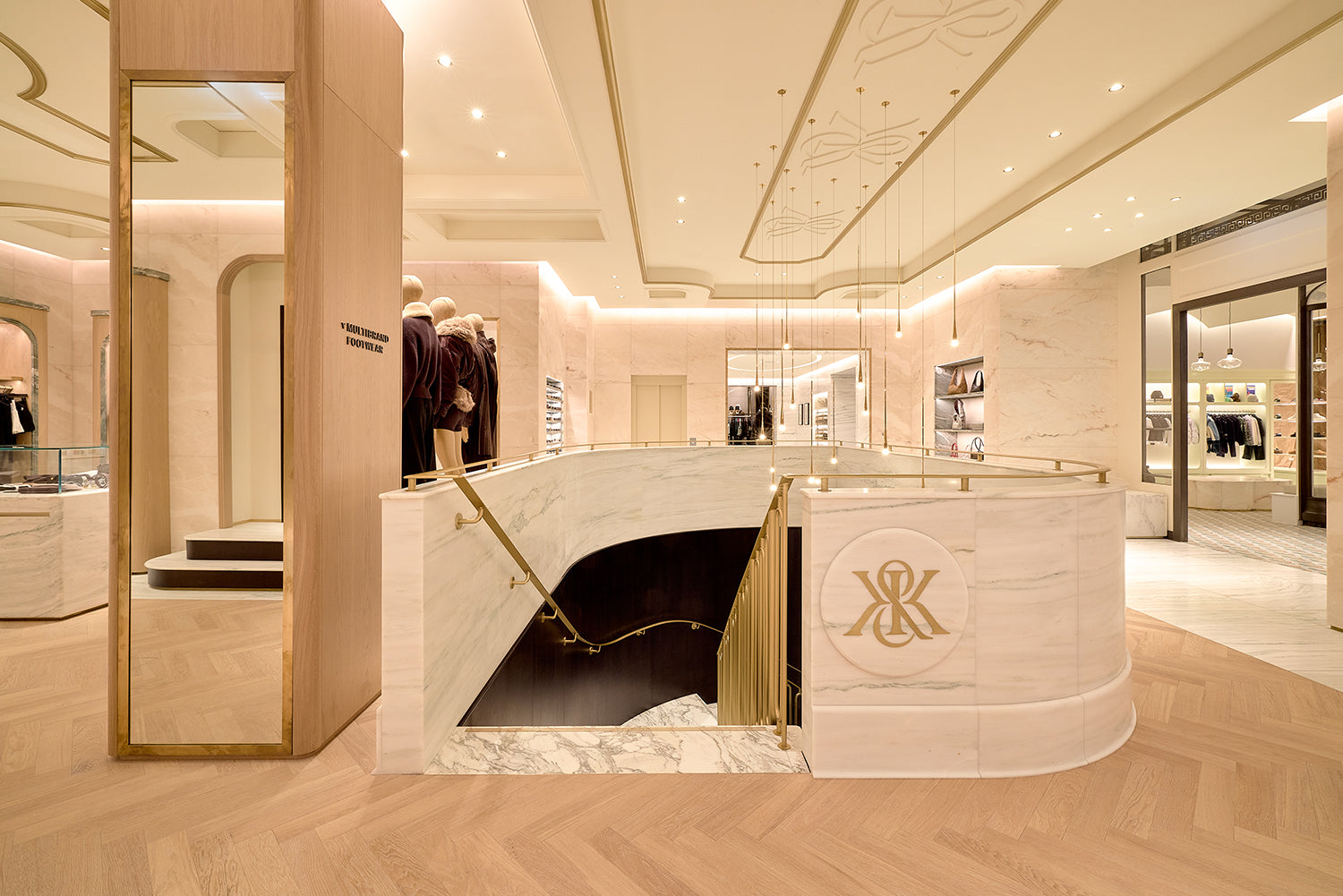 As guests walk through the entrance and past the two respective left and right destinations, they are welcomed into a much lighter space—the designated Kith Women area. Defined by custom white oak millwork embellished with Crystal Tiffany marble, Estremoz marble lined walls, and Pentelikon marble band and inlay with an oak herringbone floor, this space is reminiscent of recent Kith Women builds in Chicago and New York City. Here, the complete assortment of Kith Women apparel and accessories live, including the latest seasonal collections and collaborations.