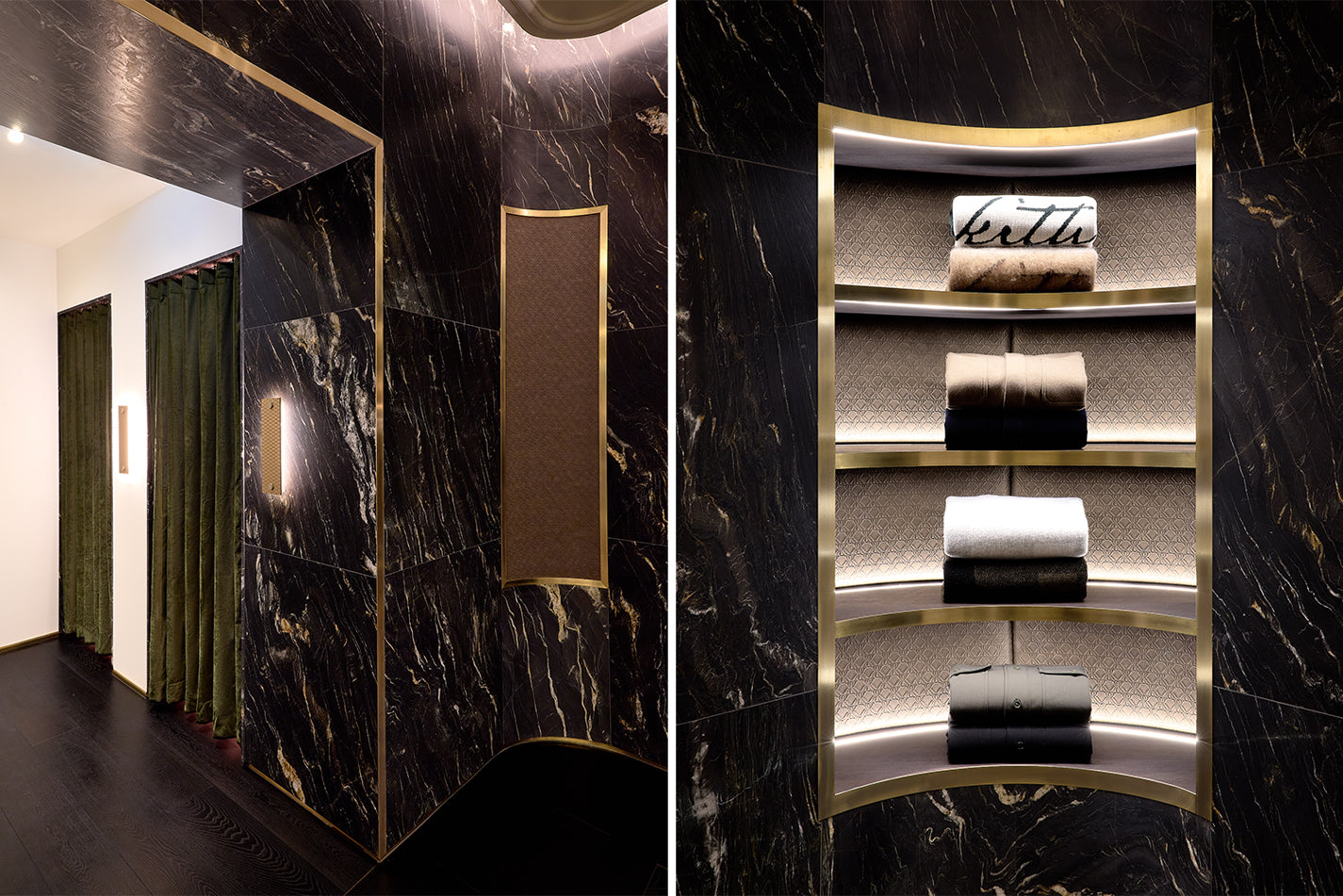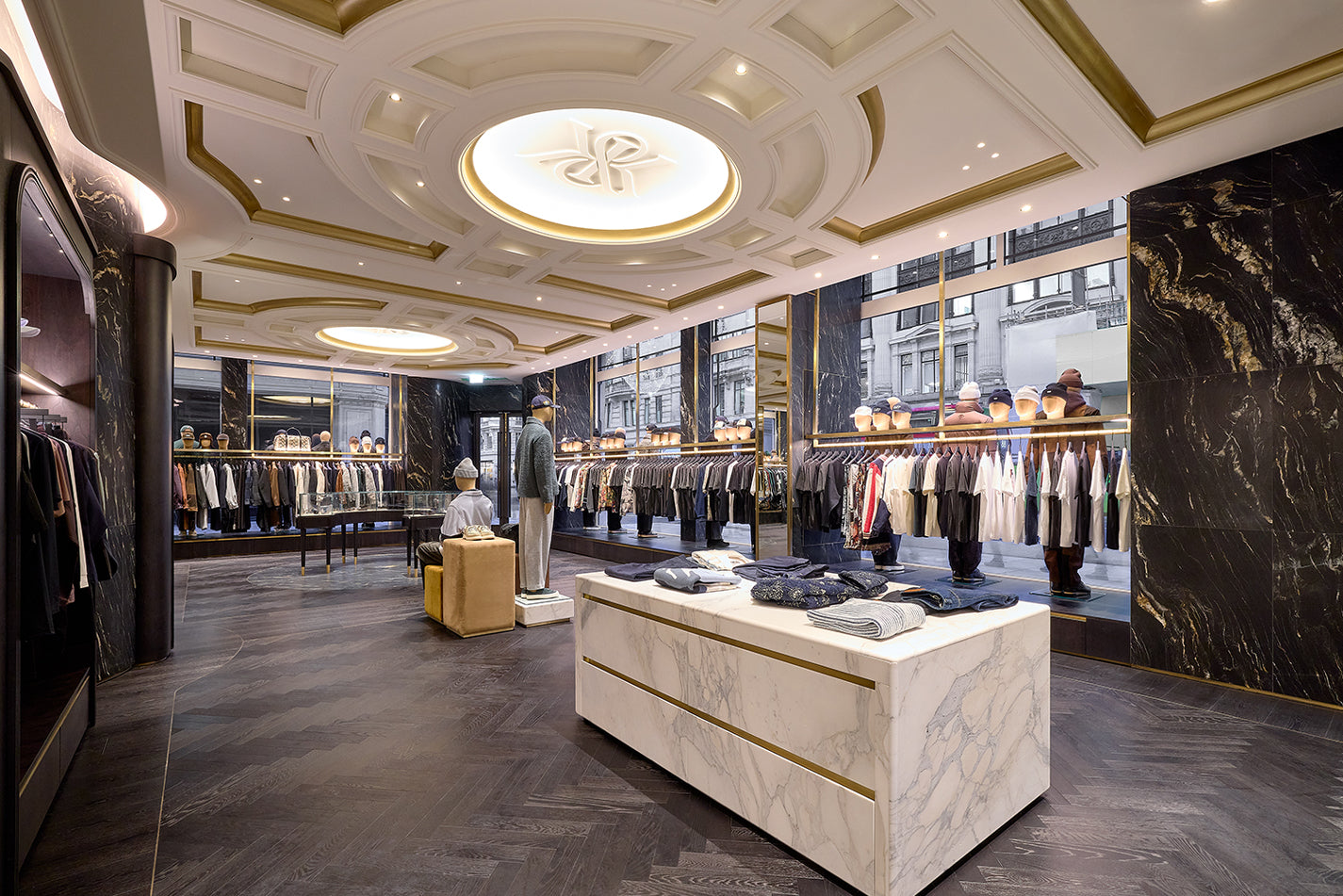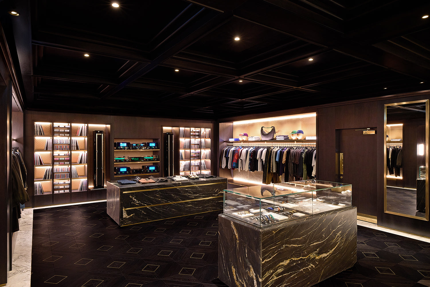 To the right of the Kith Women space and through the checkout area, guests will experience a much darker, richer palette, consisting of walnut millwork, Belvedere marble walls and Calacatta Vagli marble tables , alongside Kith embossed leatherwork throughout. It is complete with deep wood herringbone floors, diamond-tufted green velvet accents, and recessed lighting on the plaster moulded ceilings, evoking a warm, intimate feeling throughout the space that is vast by square footage. This is where Kith seasonal collections can be shopped, accessories alongside fine jewelry, and Kith collaborations. Kith London-exclusive apparel and accessories will also be available at this location.