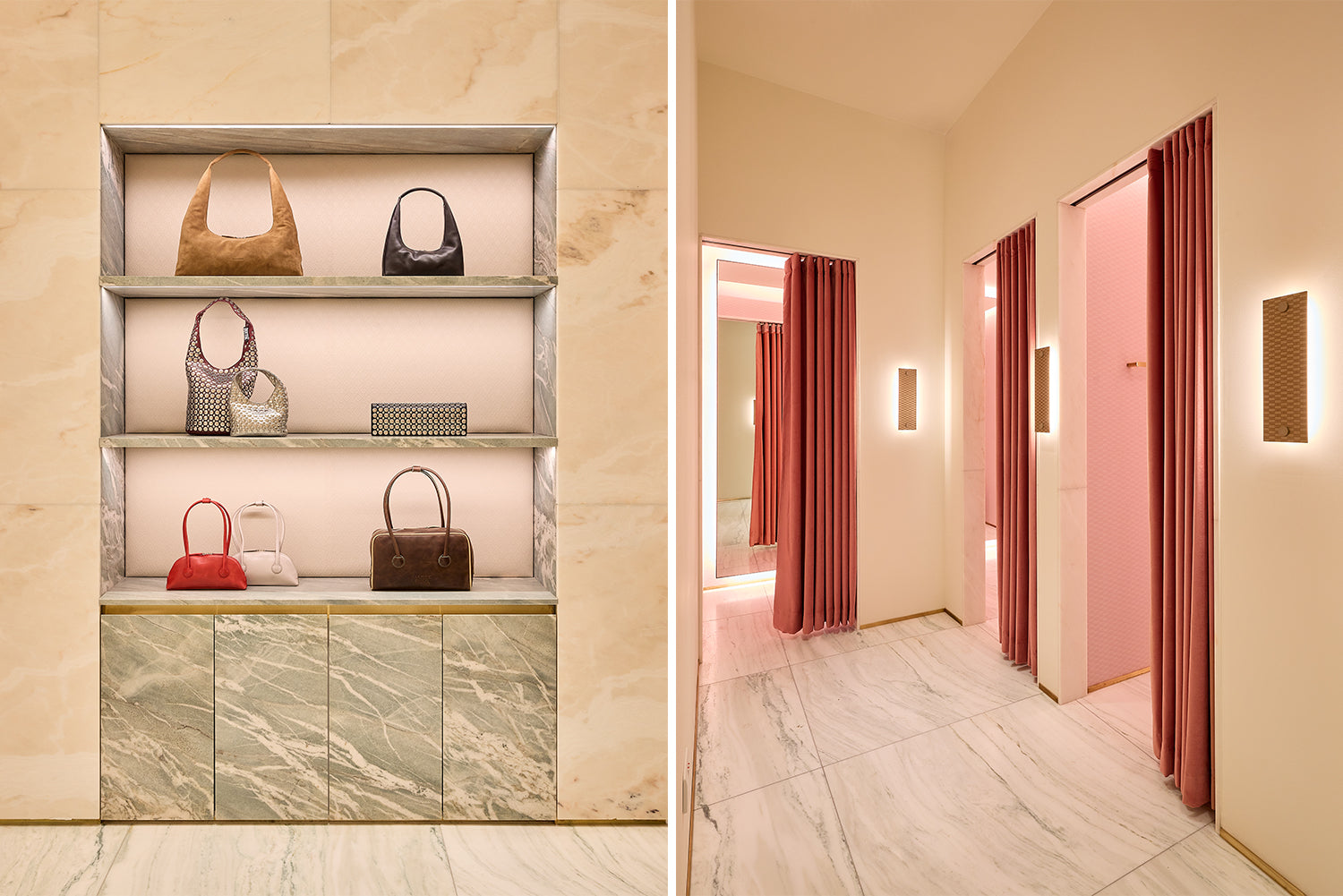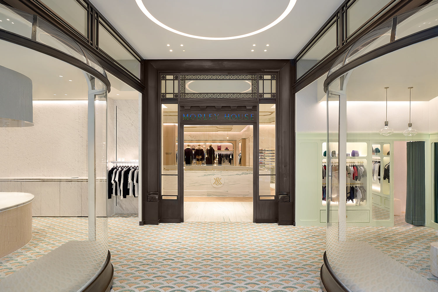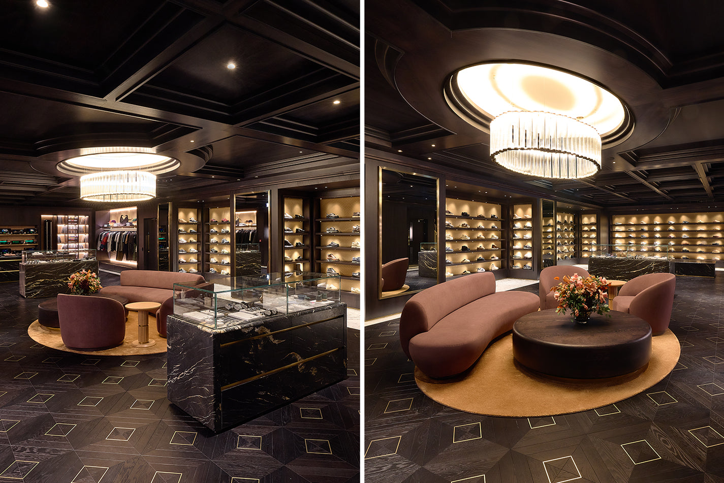 To the right of the Kith Women space and through the checkout area, guests will experience a much darker, richer palette, consisting of walnut millwork, Belvedere marble walls and Calacatta Vagli marble tables , alongside Kith embossed leatherwork throughout. It is complete with deep wood herringbone floors, diamond-tufted green velvet accents, and recessed lighting on the plaster moulded ceilings, evoking a warm, intimate feeling throughout the space that is vast by square footage. This is where Kith seasonal collections can be shopped, accessories alongside fine jewelry, and Kith collaborations. Kith London-exclusive apparel and accessories will also be available at this location.