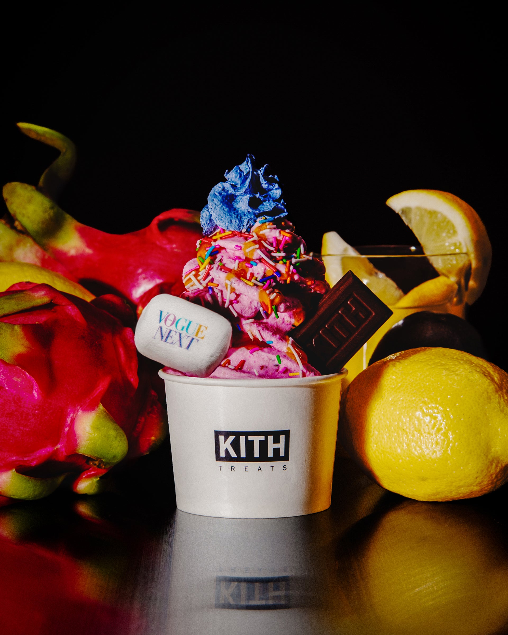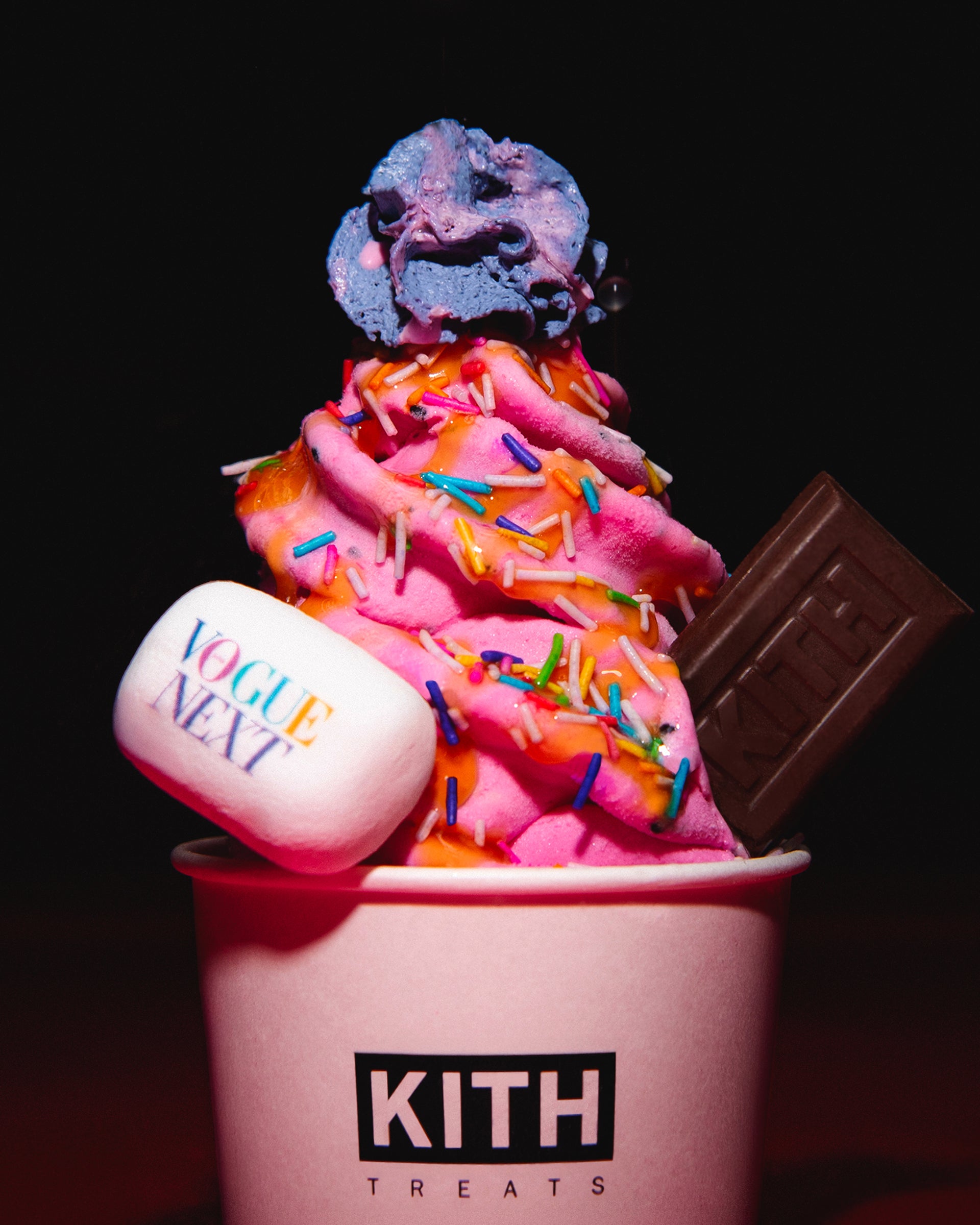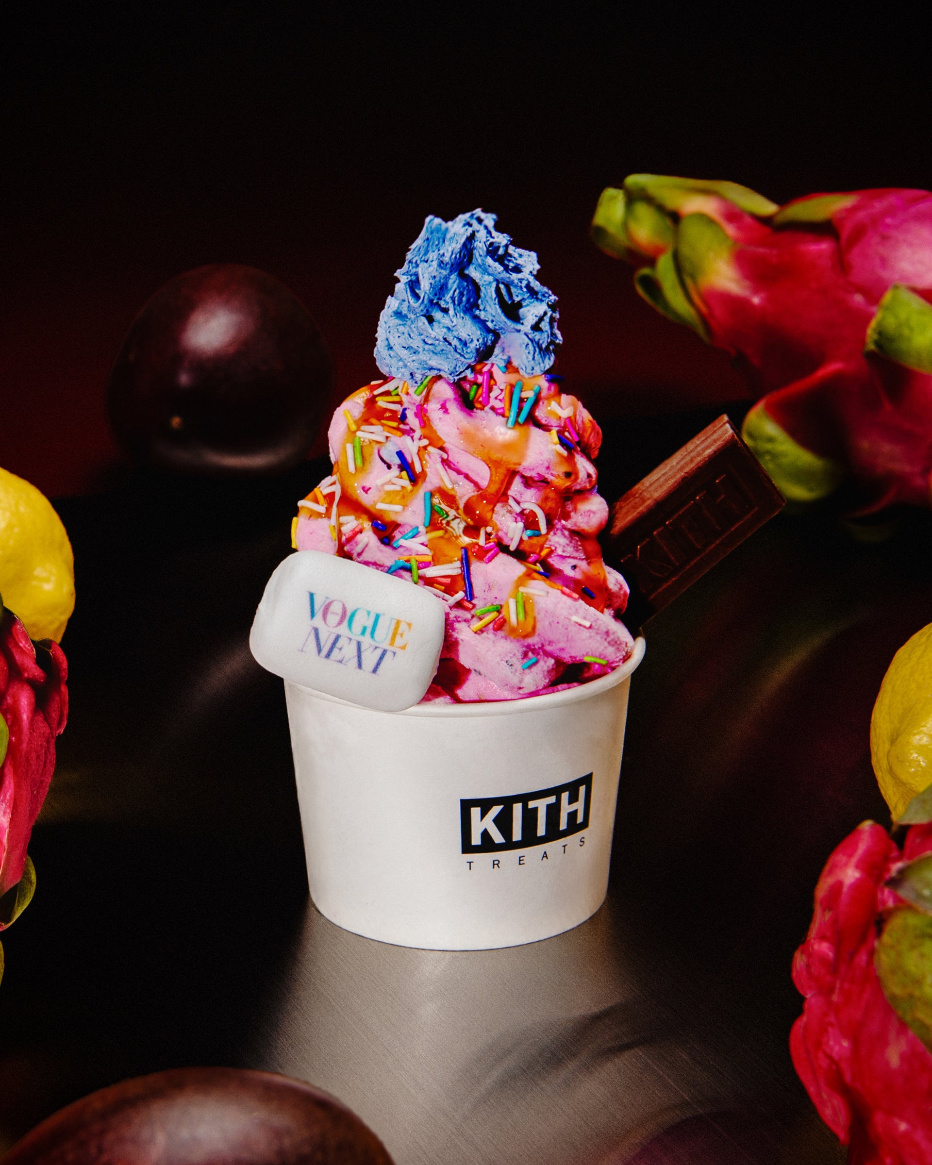 クラシックなバニラアイスクリームに、ドラゴンフルーツ、フルーツグラノーラ、ココナッツクッキー、バブルラムネをブレンド。さらに、パッションフルーツソース、レインボースプリンクル、バタフライピーホイップクリームをトッピングしました。仕上げには「VOGUE NEXT」 のロゴ入りマシュマロと Kith チョコレートを添え、最後にスポイトひとさじの仕掛けで、予想外の変化を体験いただけます。