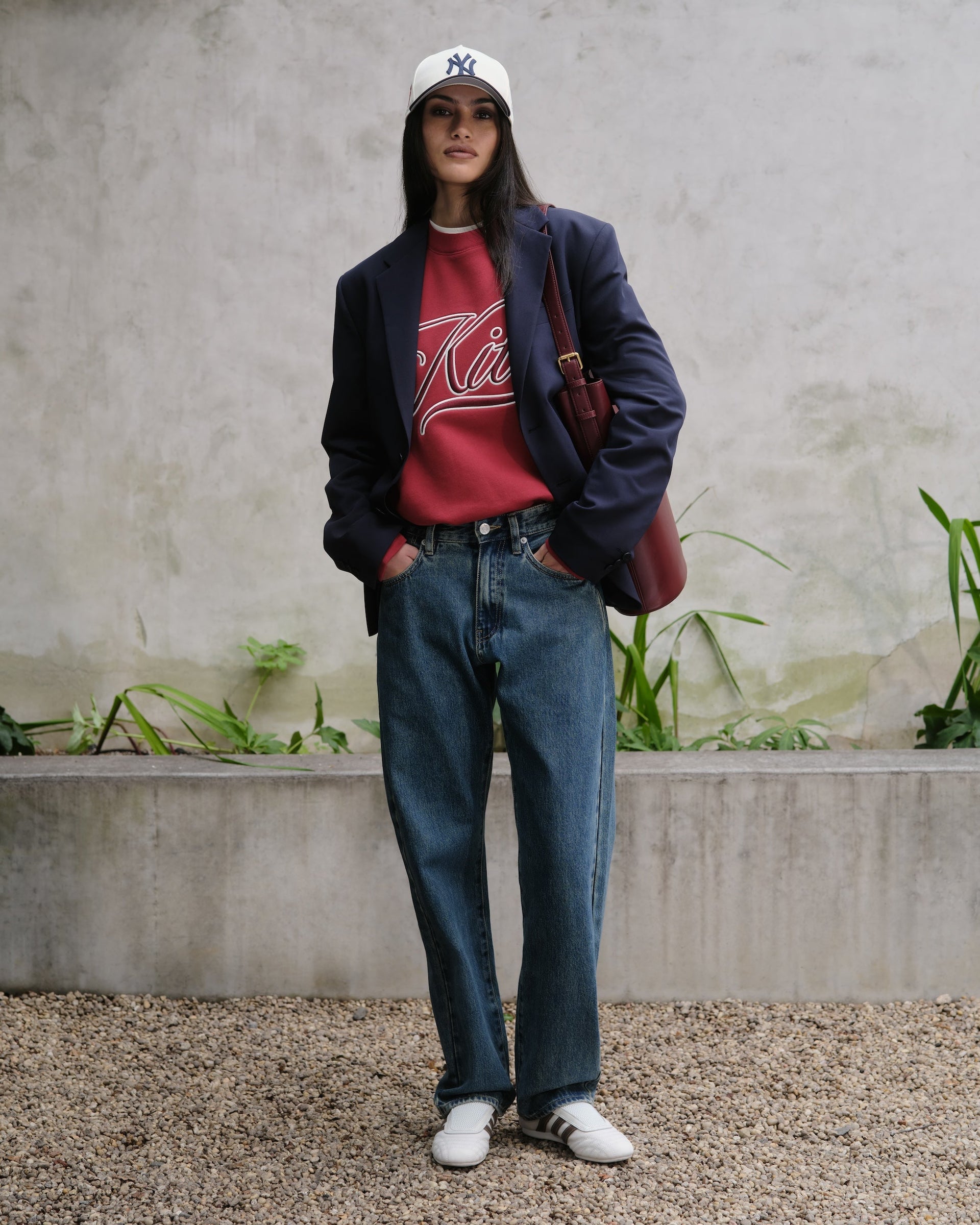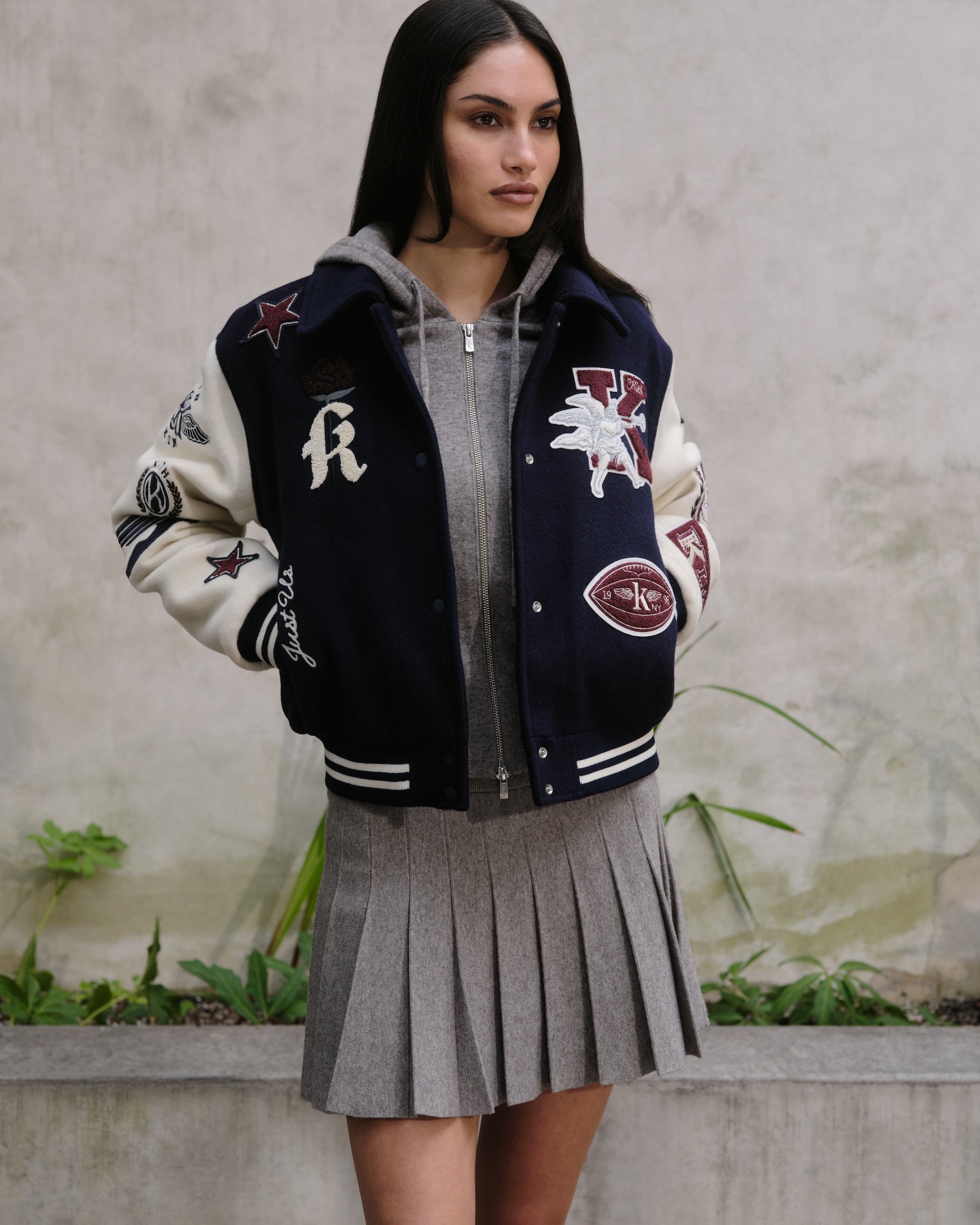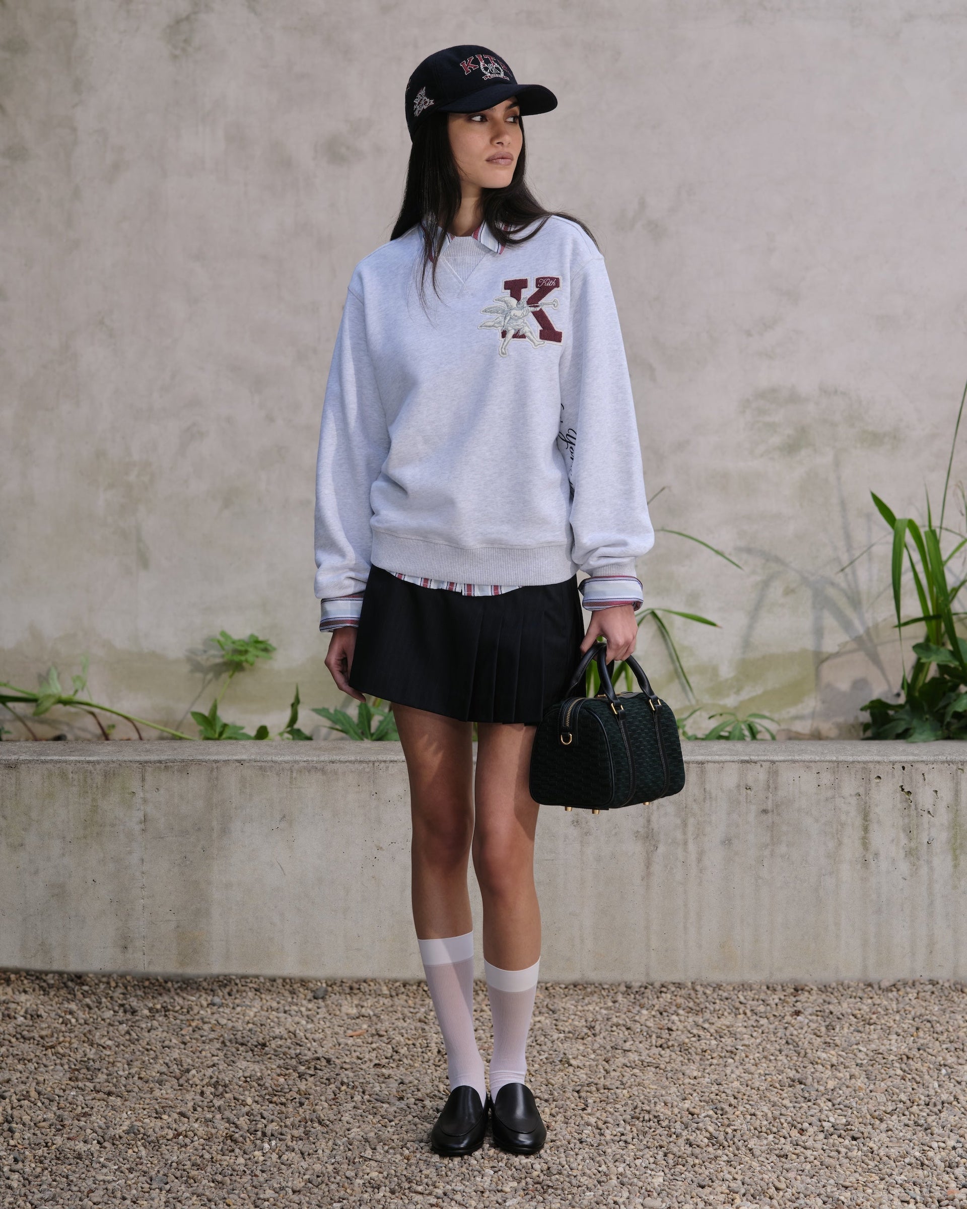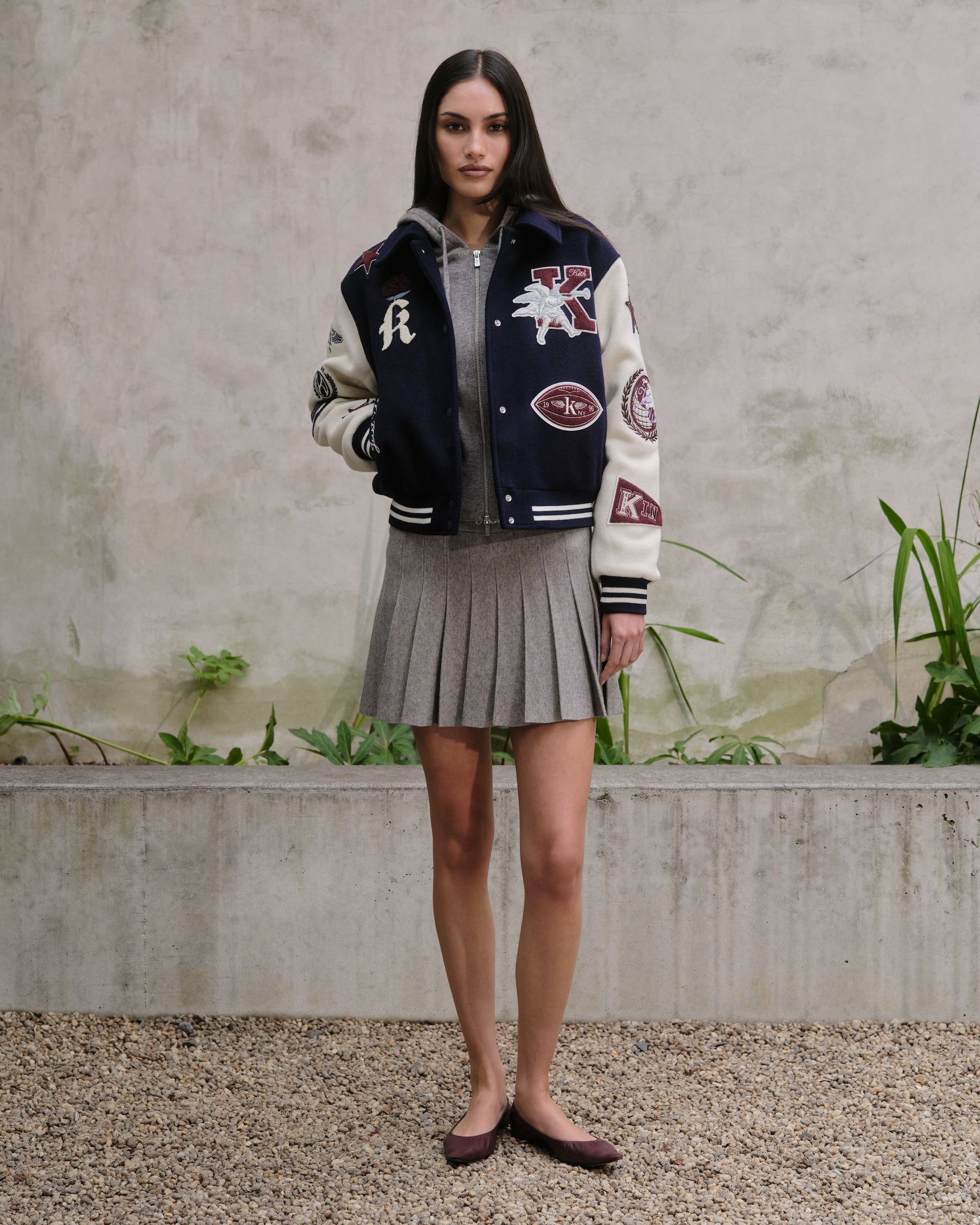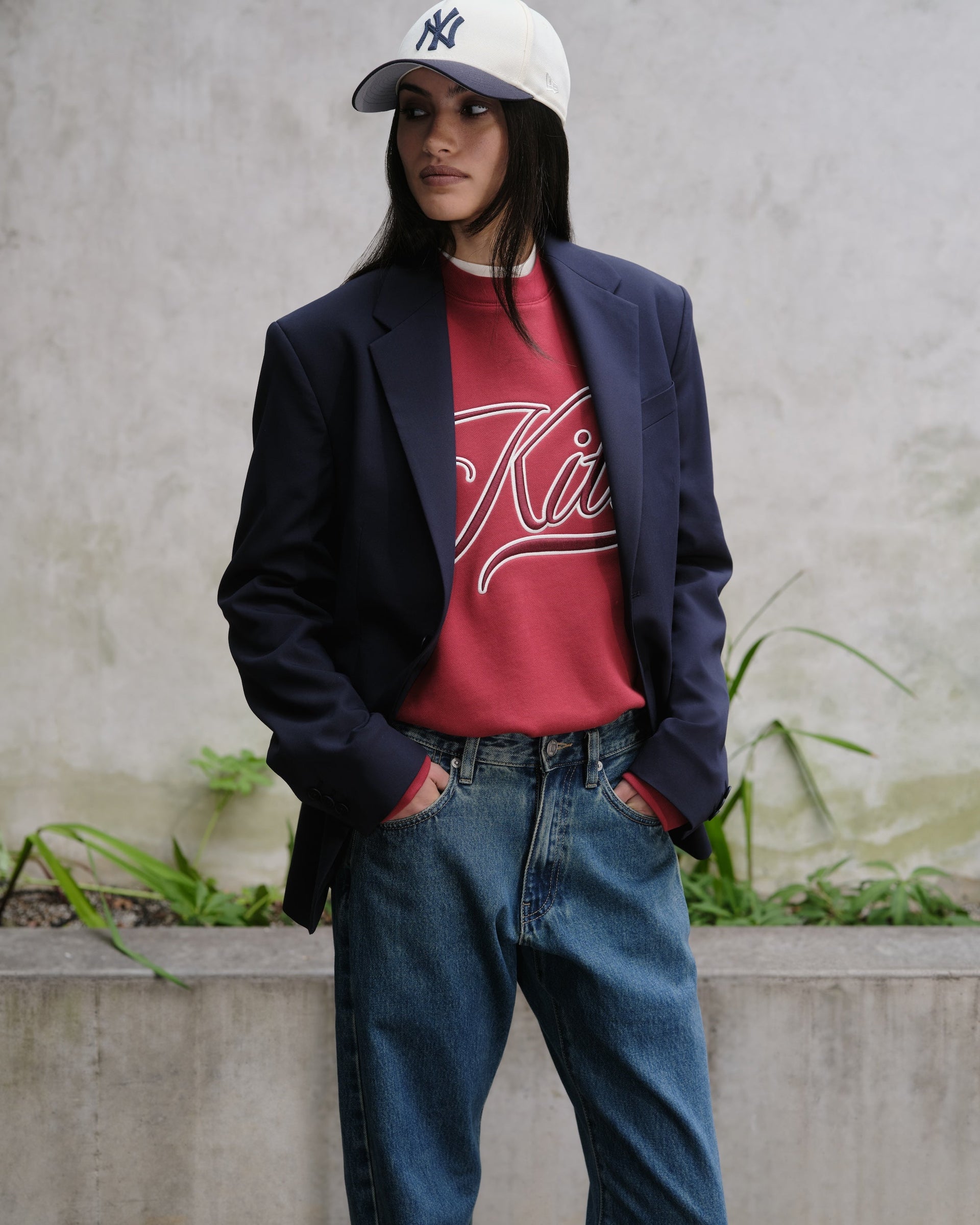 Kith Women Fall 2025 is defined by versatile matching sets, transitional knitwear ideal for when the weather gets colder, and outerwear in a variety of silhouettes including coats, cropped jackets, and bombers. The collection features collegiate-inspired graphics, seen on the Campbell II Melton Varsity Bomber, the Ashwin Polo Sweater, and the Tanner NY Apple Hoodie, tailored separates designed for day-to-night dressing such as the Corwin Script Faille Jacket, the Eliah Boucle Tank, and the Riko Script Faille Mini Skirt, and Western-inspired silhouettes—the Palesa Moto Jacket, the Miren Paisley Pant, and assorted graphic tees. The primary materials used in this collection are a jacquard faille blend ideal for tailored silhouettes, transitional wool, and fine brushed interlock for a premium hand-feel.