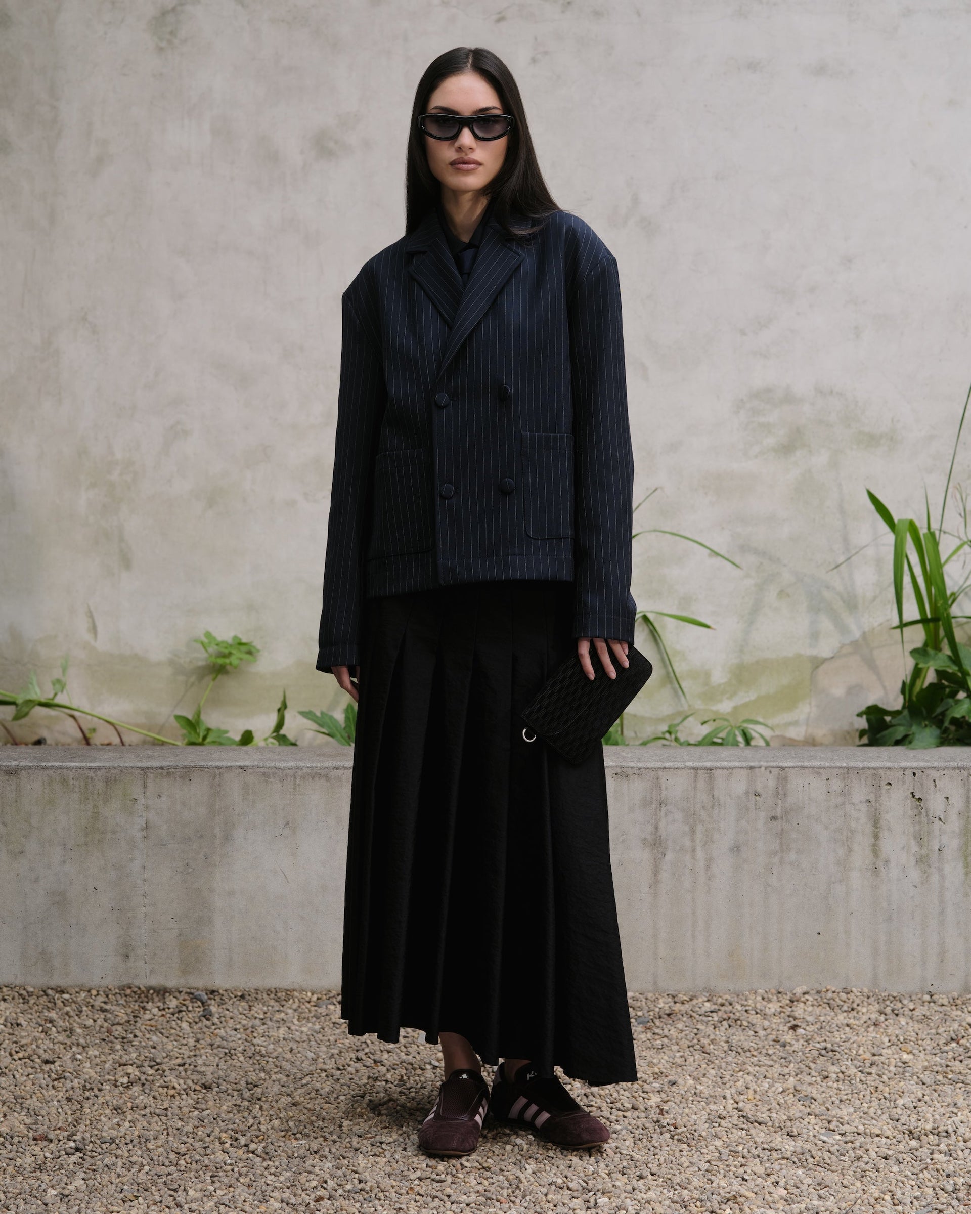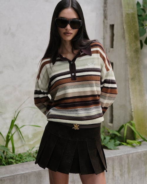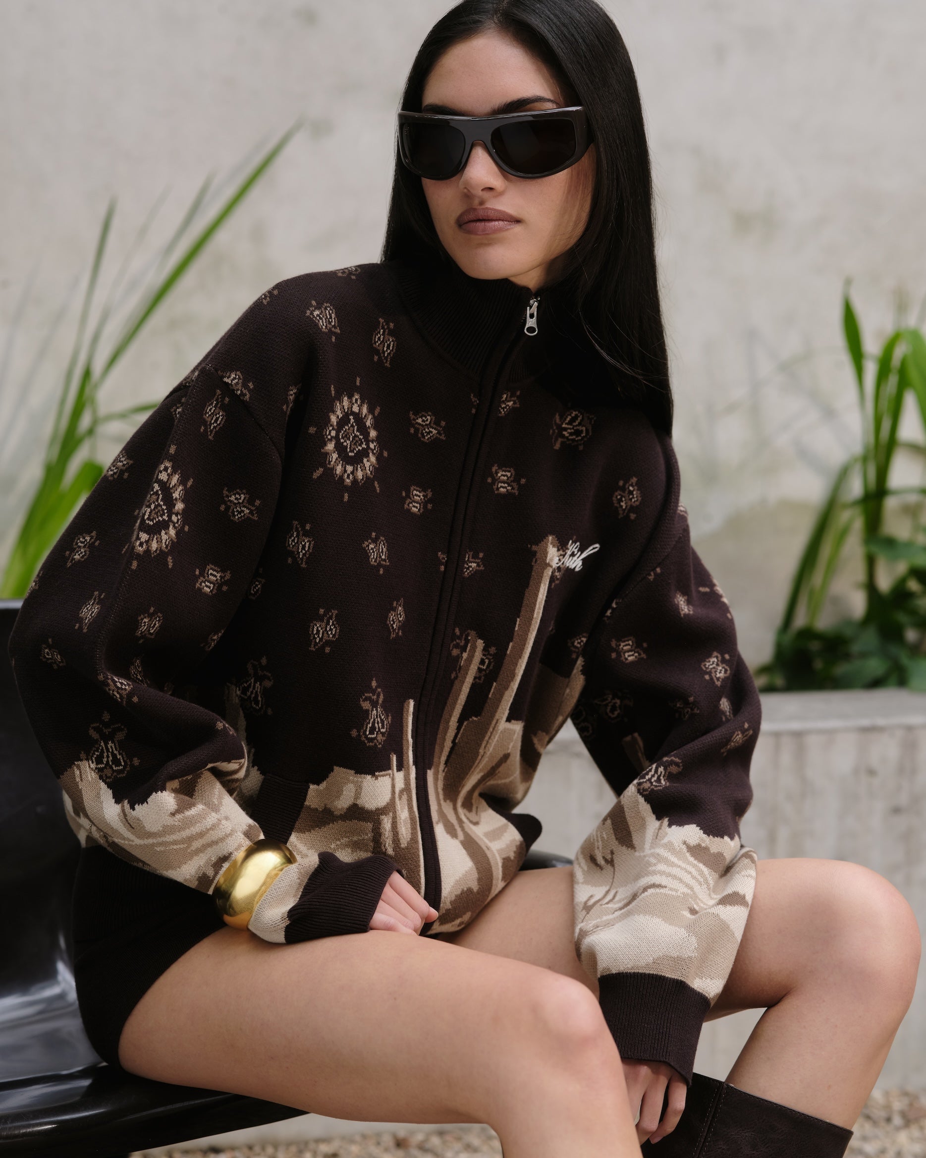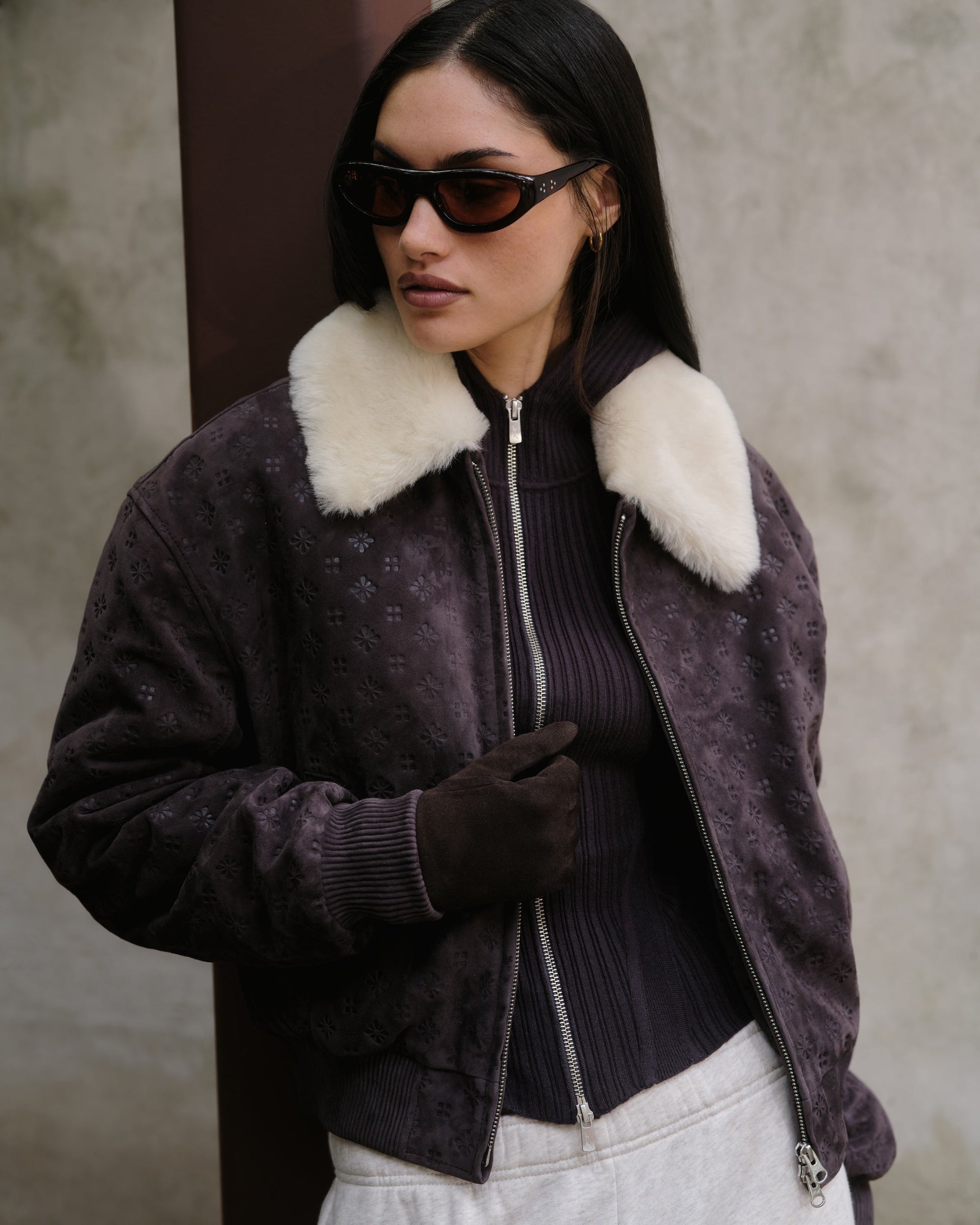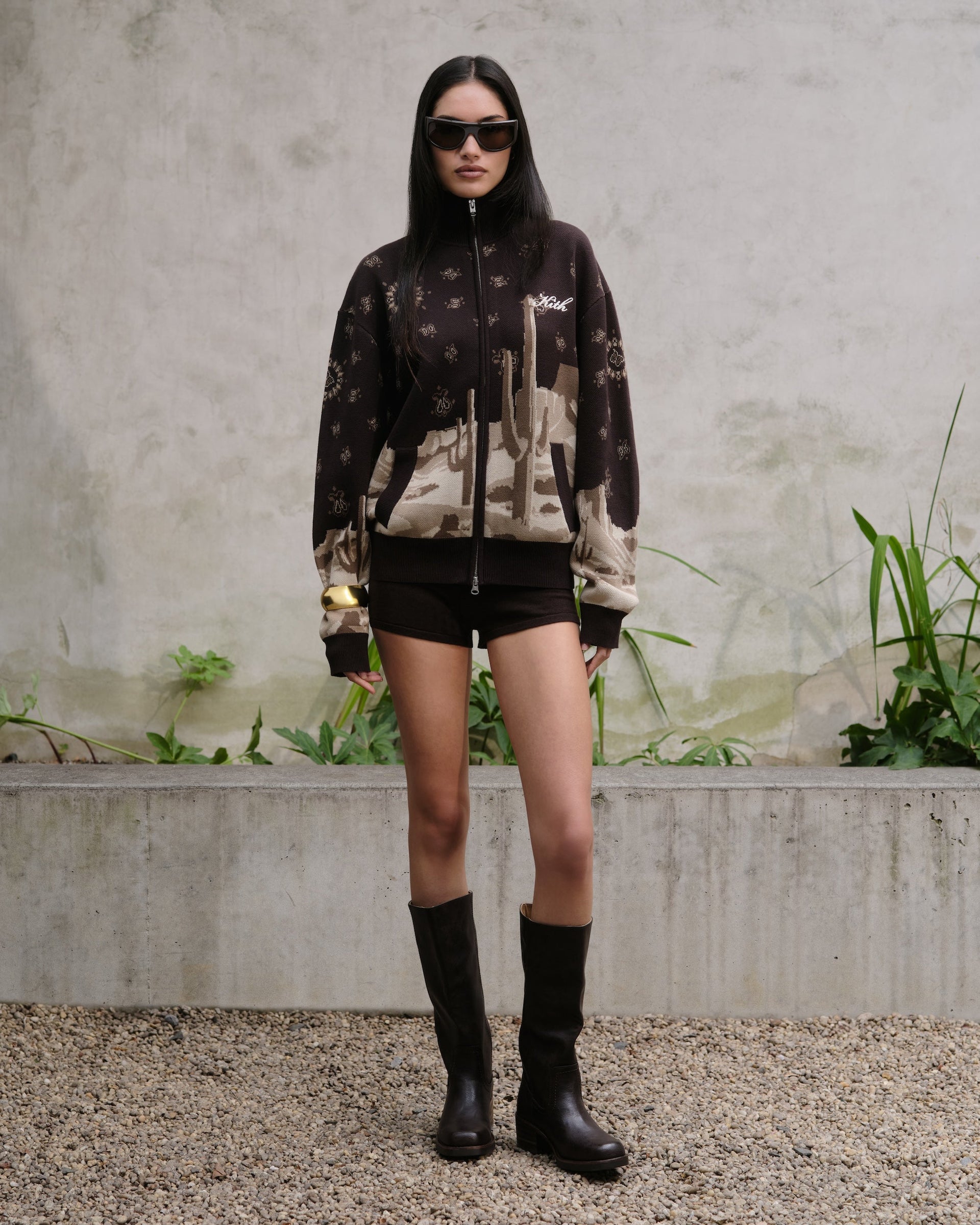 Kith Women Fall 2025 is defined by versatile matching sets, transitional knitwear ideal for when the weather gets colder, and outerwear in a variety of silhouettes including coats, cropped jackets, and bombers. The collection features collegiate-inspired graphics, seen on the Campbell II Melton Varsity Bomber, the Ashwin Polo Sweater, and the Tanner NY Apple Hoodie, tailored separates designed for day-to-night dressing such as the Corwin Script Faille Jacket, the Eliah Boucle Tank, and the Riko Script Faille Mini Skirt, and Western-inspired silhouettes—the Palesa Moto Jacket, the Miren Paisley Pant, and assorted graphic tees. The primary materials used in this collection are a jacquard faille blend ideal for tailored silhouettes, transitional wool, and fine brushed interlock for a premium hand-feel.