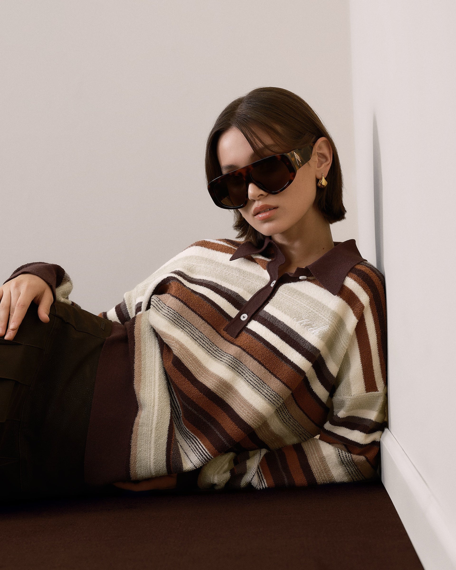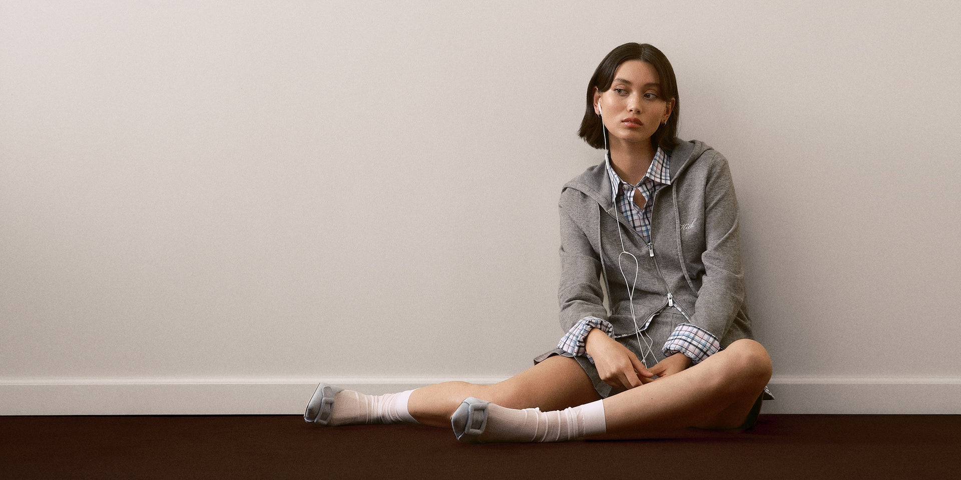 Made of loopback terry striped blends, diamond jacquard cotton knits, and technical nylon ribbed fabric, each silhouette from the Fall 2025 Knitwear collection places emphasis on a soft hand-feel, featuring vintage-inspired shapes like the Selma Towel Polo Long Sleeve, contemporary styles like the Mina Backless Sweater Hoodie, and matching sets like the Faryn Hooded Zip Up and the Hana Pleated Sweater Skort.