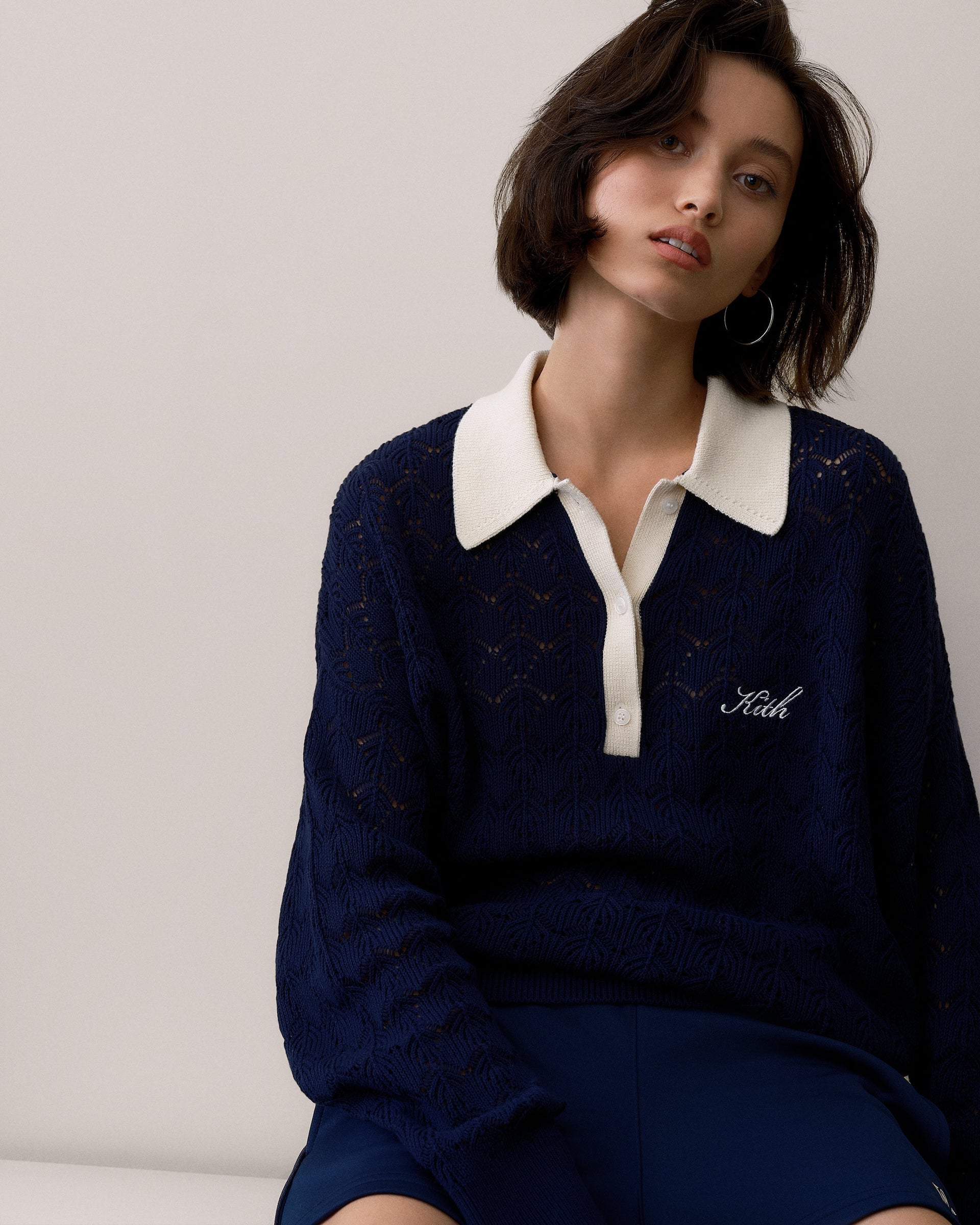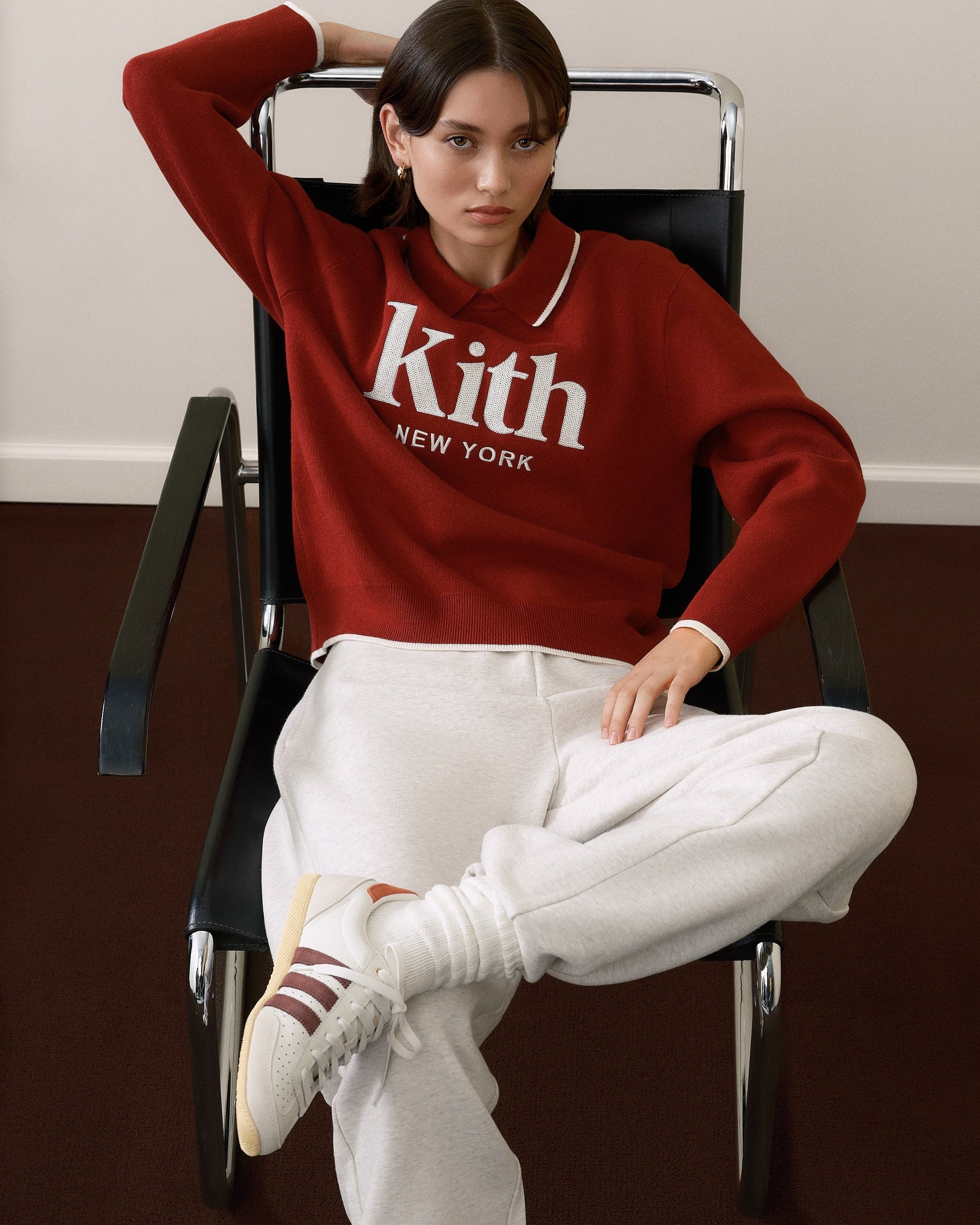 さらに、アウターとして活躍する定番アイテムも展開。Kith Men’s コレクションの Wyona から着想を得た Wyler は、今季はカラーブロッキングやオールオーバーアートワークを施したバージョンで再登場。オーバーサイズシルエットで仕立てられており、これからの寒い季節のレイヤリングに最適です。その他にも、クラシックなプルオーバーとして Ashwin Polo Sweater、Selma Crochet Polo Long Sleeve、クロップド丈の Emi Crest Sweater などが登場し、いずれも Kith の刺繍ロゴをさりげなくあしらいました。