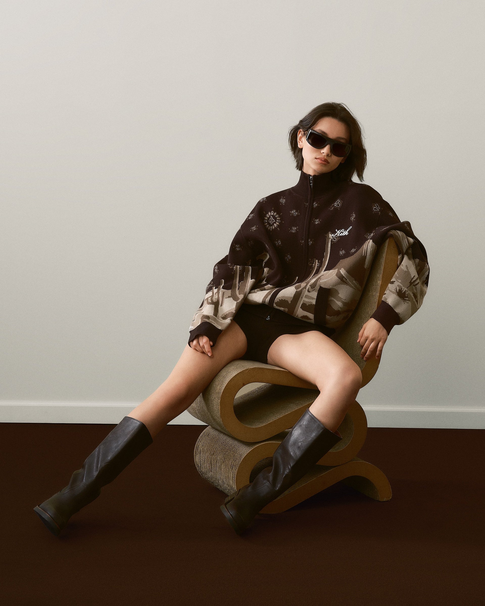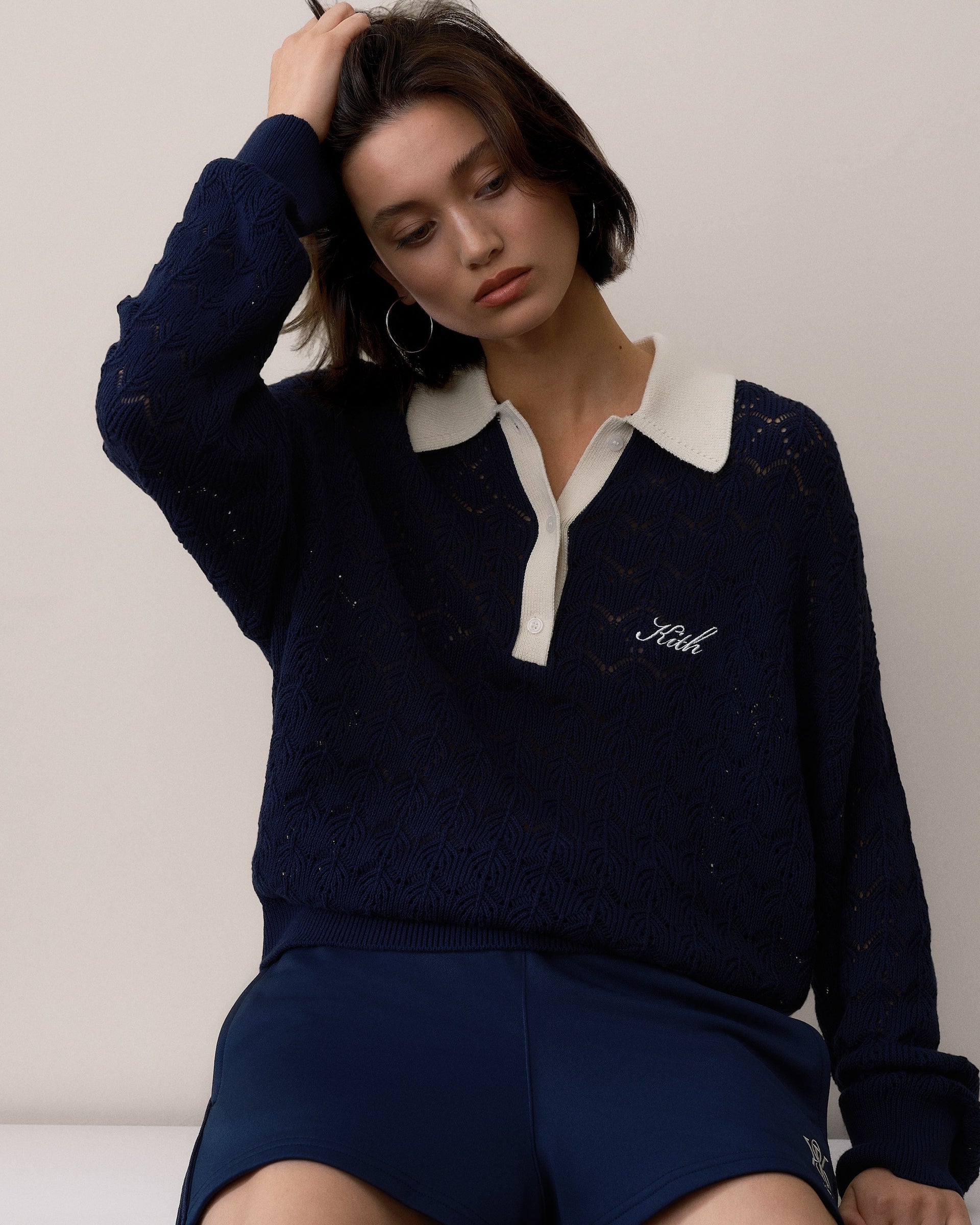 Also featured in the Knitwear assortment are outerwear staples. The Wyler, inspired by the Wyona from the Kith men’s collection, returns for this season in iterations with color-blocking and all-over artwork. It is designed to have an oversized silhouette, ideal for layering during the colder months ahead. Other layerable sweaters from this collection include classic pullovers such as the Ashwin Polo Sweater, the Selma Crochet Polo Long Sleeve, and the cropped Emi Crest Sweater, all complete with subtle embroidered Kith branding.