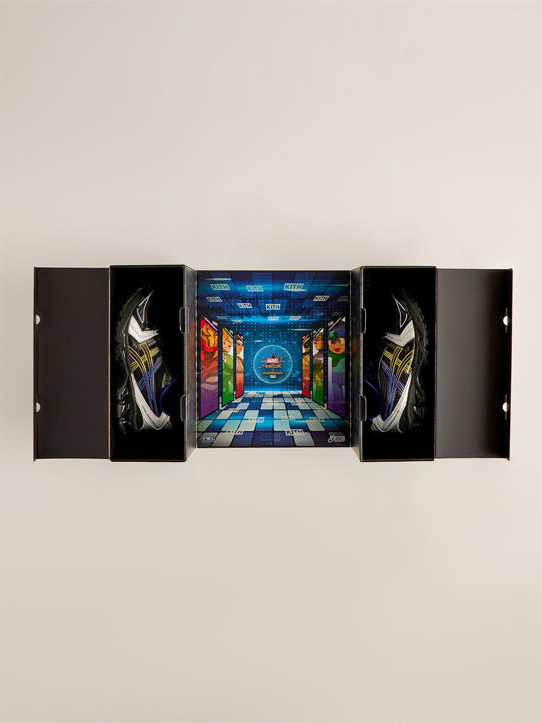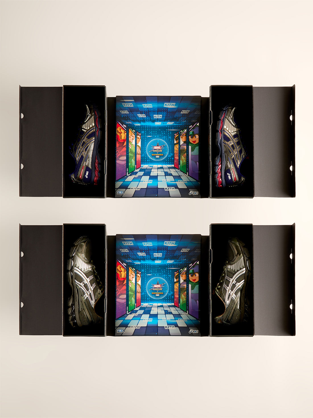 The second double box is inspired by Marvel’s Iron Man and Capcom’s Mega Man styles in the GEL-NIMBUS 10.1. Iron Man’s iteration is made of gradient ripstop underlays, with tonal synthetic leather overlays, ASICS and Kith branding on the tongue and heel, and a tonal rubber outsole. Mega Man’s silhouette is equipped with a closed mesh underlay and synthetic iridescent leather overlays, designed in Mazarine Blue and Silver with Red at the midsole. It has the same branding locations as the Iron Man silhouette, and both are highlighted by ASICS’ iconic tooling for optimal comfort.