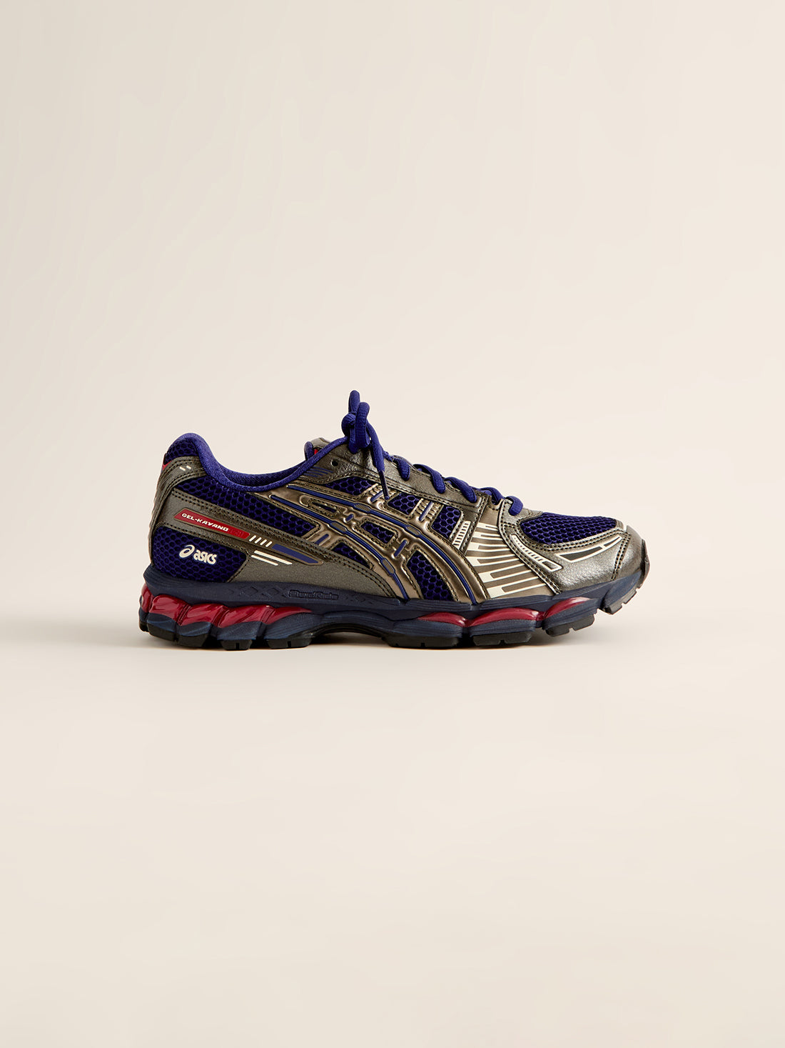 2つ目のダブルボックスは、Marvel の Iron Man と Capcom の Mega Man(ロックマン) をモチーフにした GEL-NIMBUS 10.1 を採用しています。Iron Man のモデルは、グラデーションのリップストップアンダーレイに、同系色のシンセティックレザーオーバーレイを重ねたデザイン。タンとヒールには ASICS と Kith のブランディングを施し、アウトソールもトーンを合わせたカラーで統一しています。Mega Man のモデルは、クローズドメッシュのアンダーレイに、イリディセント加工のシンセティックレザーオーバーレイを組み合わせた仕様。Mazarine Blue と Silver を基調に、ミッドソールに Red のカラーリングをアクセントとして取り入れています。ブランディングの配置は Iron Man モデルと同じで、どちらのモデルも ASICS ならではの快適性を支えるアイコニックなツーリングを採用しています。