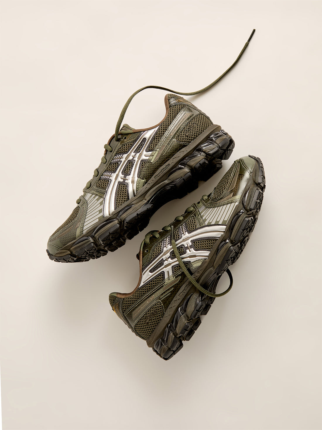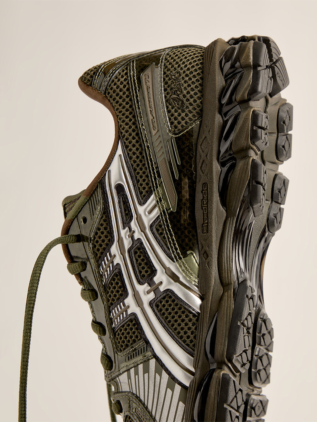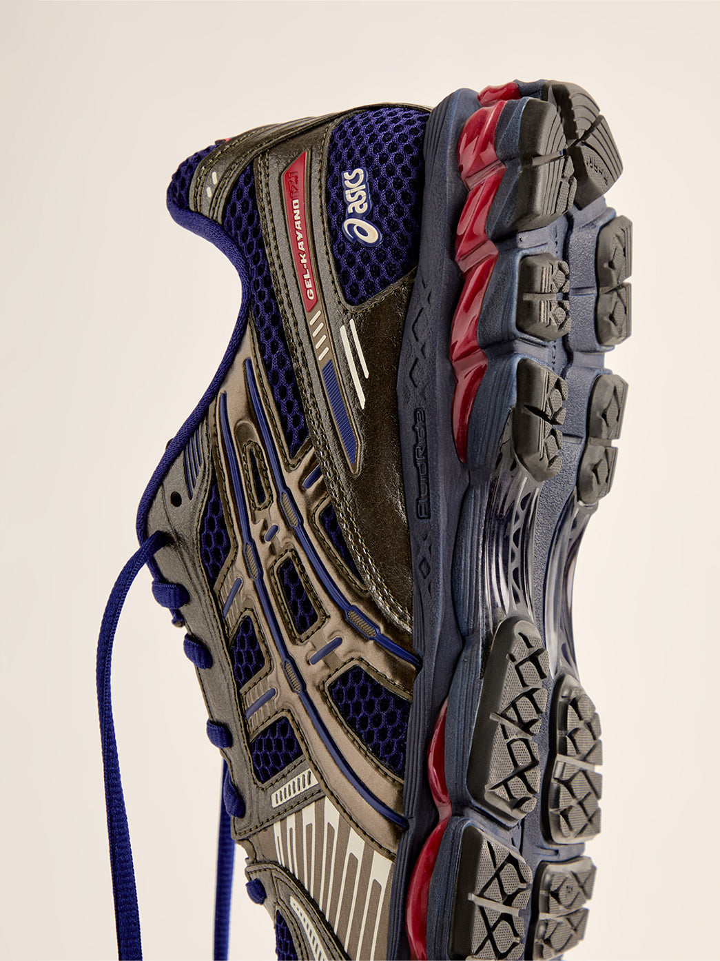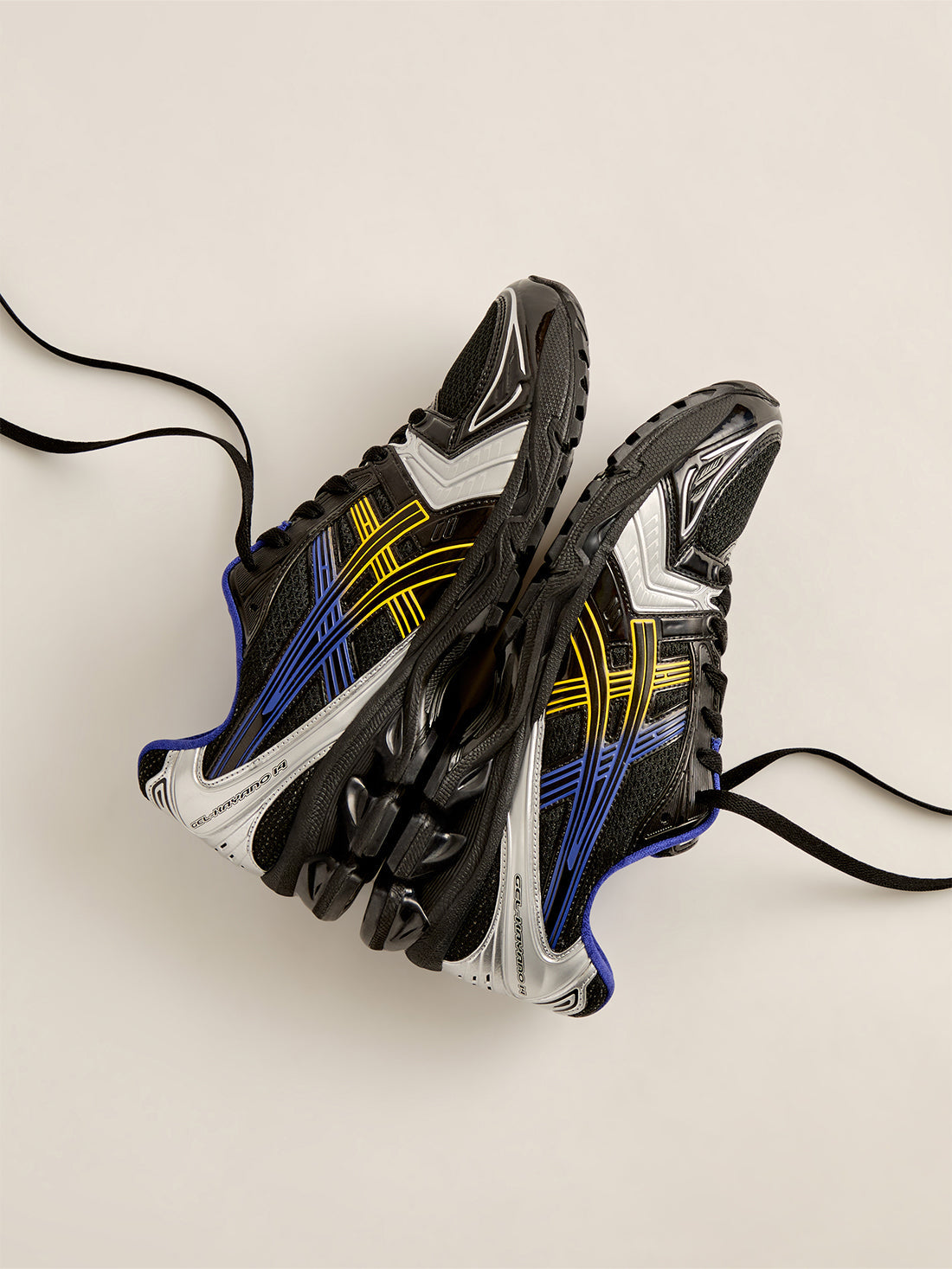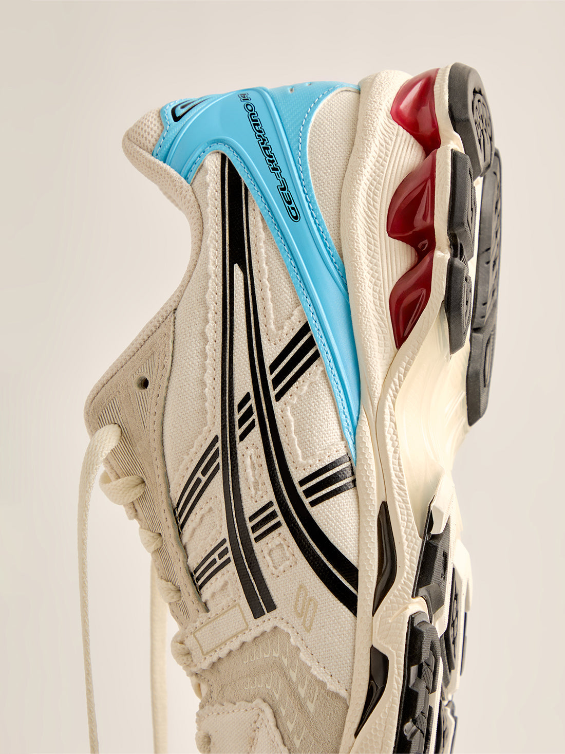 最後に、ラインナップを締めくくるのは、Marvel の Wolverine をイメージしたブラック × イリディセントのカラーウェイと、Capcom の Ryu をイメージしたココナッツミルク × ブラックのカラーウェイを採用した、2型の GEL-KAYANO® 14 です。Wolverine モデルは、オーバルメッシュのアンダーレイに、イリディセント仕上げのシンセティックレザーオーバーレイを組み合わせたデザインで登場。片足のヒールには Fieg ブランディング、もう片足には GEL ブランディングを配し、タンにはコントラストの効いたイエローのタイガーストライプと共にコーブランディングを施しています。Ryu モデルは、Capcom の世界観から着想を得たココナッツミルク × ブラックの配色で登場。アッパーにはダメージ加工を施したフリンジキャンバスを使用し、ヌバックのディテール、シンセティックのヒールケージを組み合わせた仕様で、ブランディングの配置は Wolverine モデルと同様です。どちらのモデルも、足元に搭載した GEL™ テクノロジーをはじめ、GEL-KAYANO™ 14 が誇る耐久性とクッショニングを備えています。