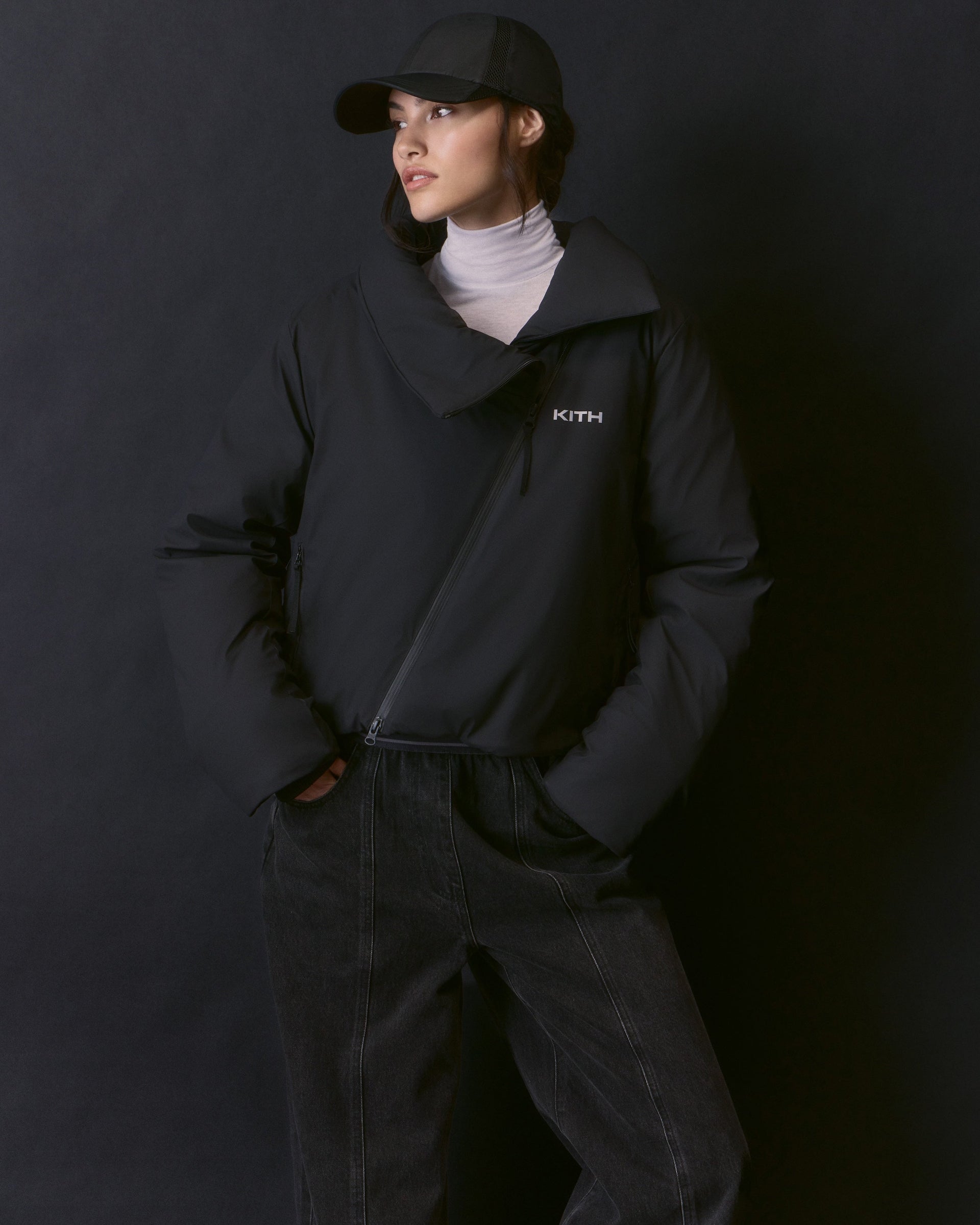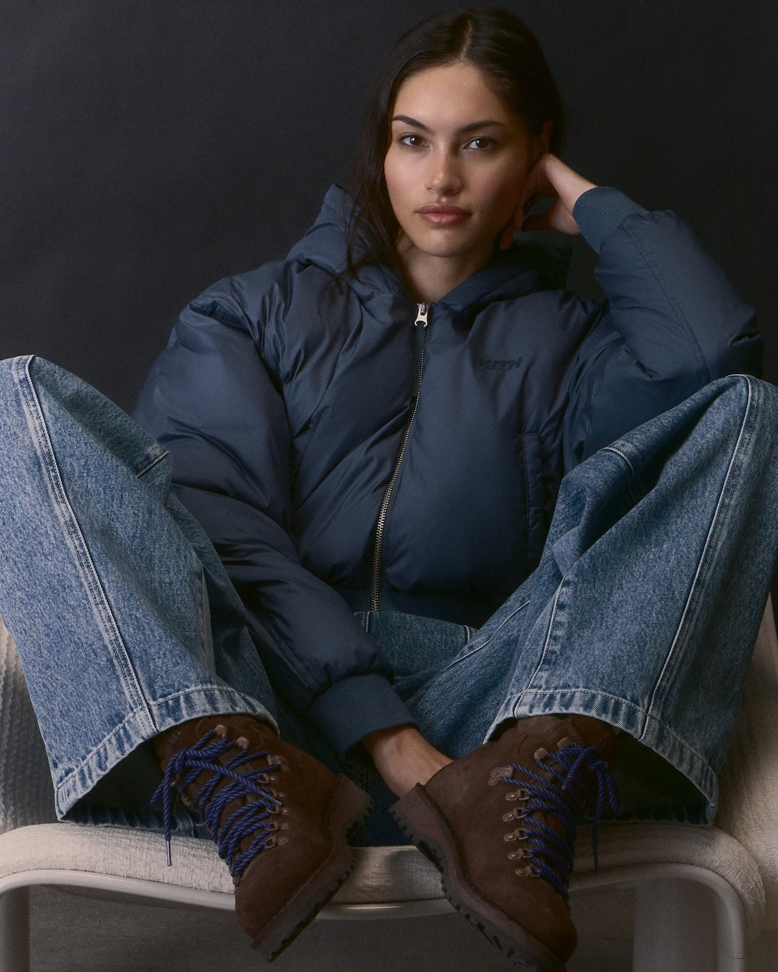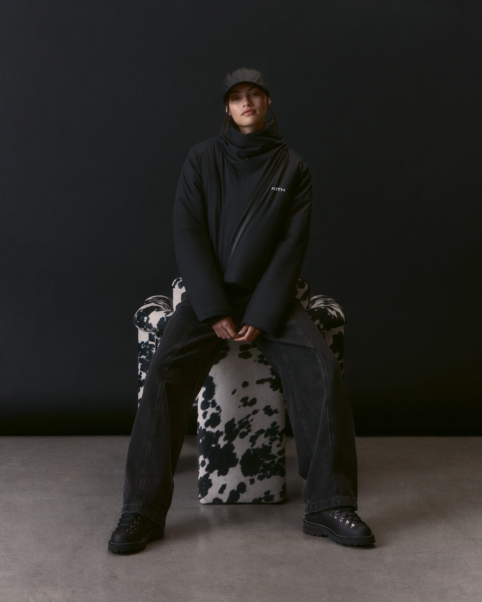 From reversible silhouettes like the Rory II Coat and convertible styles that zip-off from jacket to vest like the Wynne Puffer, to tailored wardrobe staples such as the Maeva Melton Stripe Scarf Coat, this assortment features a range of standout styles with all-over Kith branding and mix of materials from premium wool to faux fur and sherpa. Ideal for day-to-night dressing, statement outerwear selects such as the Senna Faux Fur Reversible Bomber and the premium shearling Waylon II Monogram Jacket make for effortless holiday occasionwear. More understated silhouettes from the Winter Classics assortment include the Brisa Patina Bomber made of textured velvet, the Corey Hooded Nylon Puffer, a favorite from the Classics assortment in seasons past, and the Shae Cropped Denim Puffer in a range of hues.