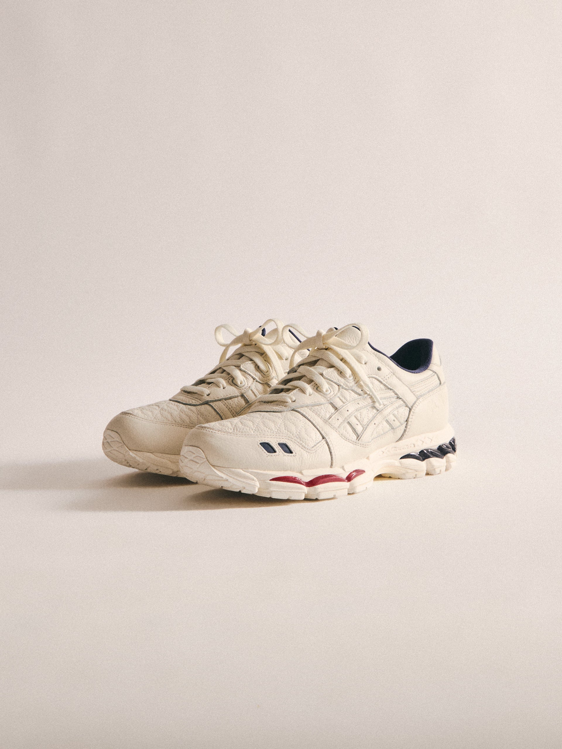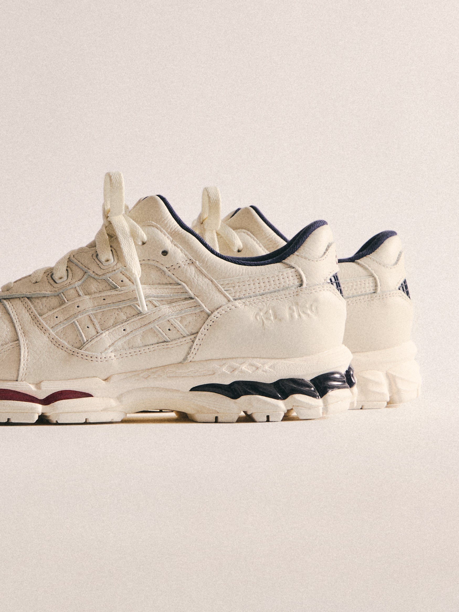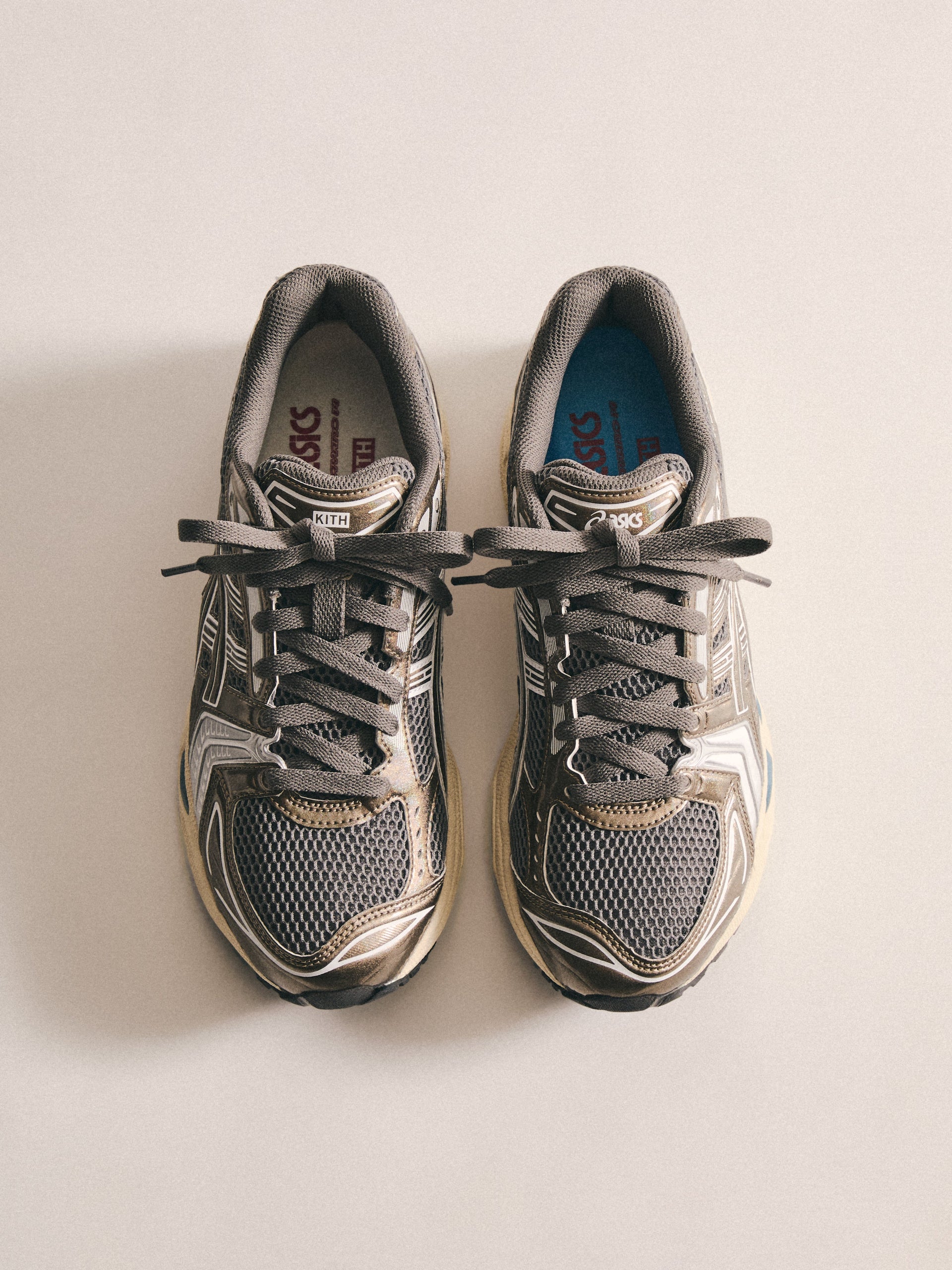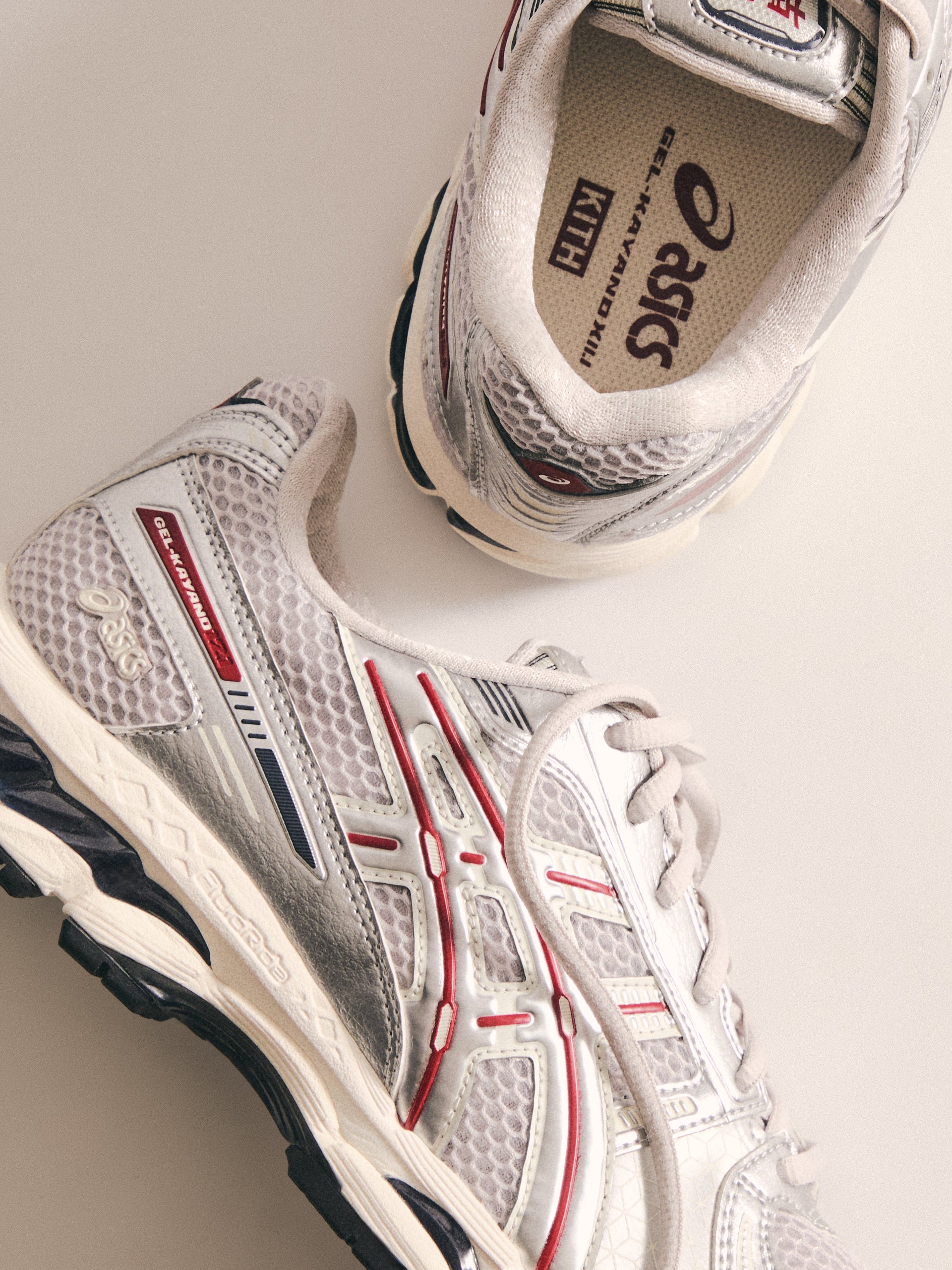 最新の GEL-KAYANO 12.1 は、過去のモデルをベースに Wind Chime と Pure Silver の新カラーでアップデート。アメリカへのオマージュとしてデザインされ、オープンメッシュのアッパー、シンセティックオーバーレイ、タンとフットベッドには Kith のブランディングを配しています。90年代に登場したアーカイブモデル GEL-MAI を再解釈した Ronnie Fieg’s 0.1 バージョンは、オリジナルと同様の fuzeGEL™ テクノロジー を採用しつつ、ライフスタイル仕様にアップデート。メッシュのアンダーレイとシンセティックレザーのオーバーレイで構成され、タンに Fieg、ヒールに Kith のロゴ、さらにコラボレーションフットベッドを備えています。カラーは “Japan” をテーマにデザインされています。GEL-LYTE 3.1 は、GEL-LYTE III のアイコニックなアッパーと GEL-NIMBUS 17 のソールを融合したモデル。デュアルデンシティ構造とジェルパディングを採用し、レザーアッパーにキルティングのアンダーレイ、Fieg ロゴ入りのスプリットタン、そして1900年パリ万博を讃えるデボスアートワークをサイドにあしらっています。そしてコレクションを締めくくるのは、“Chicago” GEL-KAYANO 14®。グラナイトを基調にグレーとホワイトのアクセントを効かせ、イリディセント加工を施したシンセティックレザーのオーバーレイ、タンに Kith、ヒールに Fieg のロゴ、さらに特製パッケージが付属します。