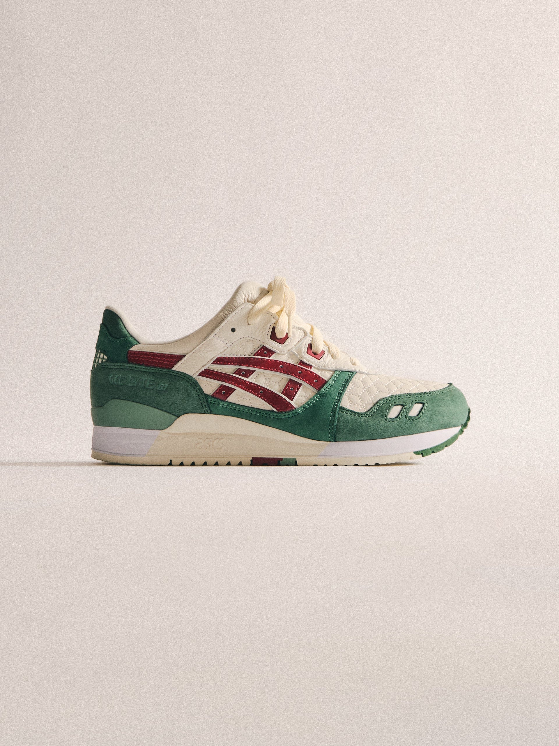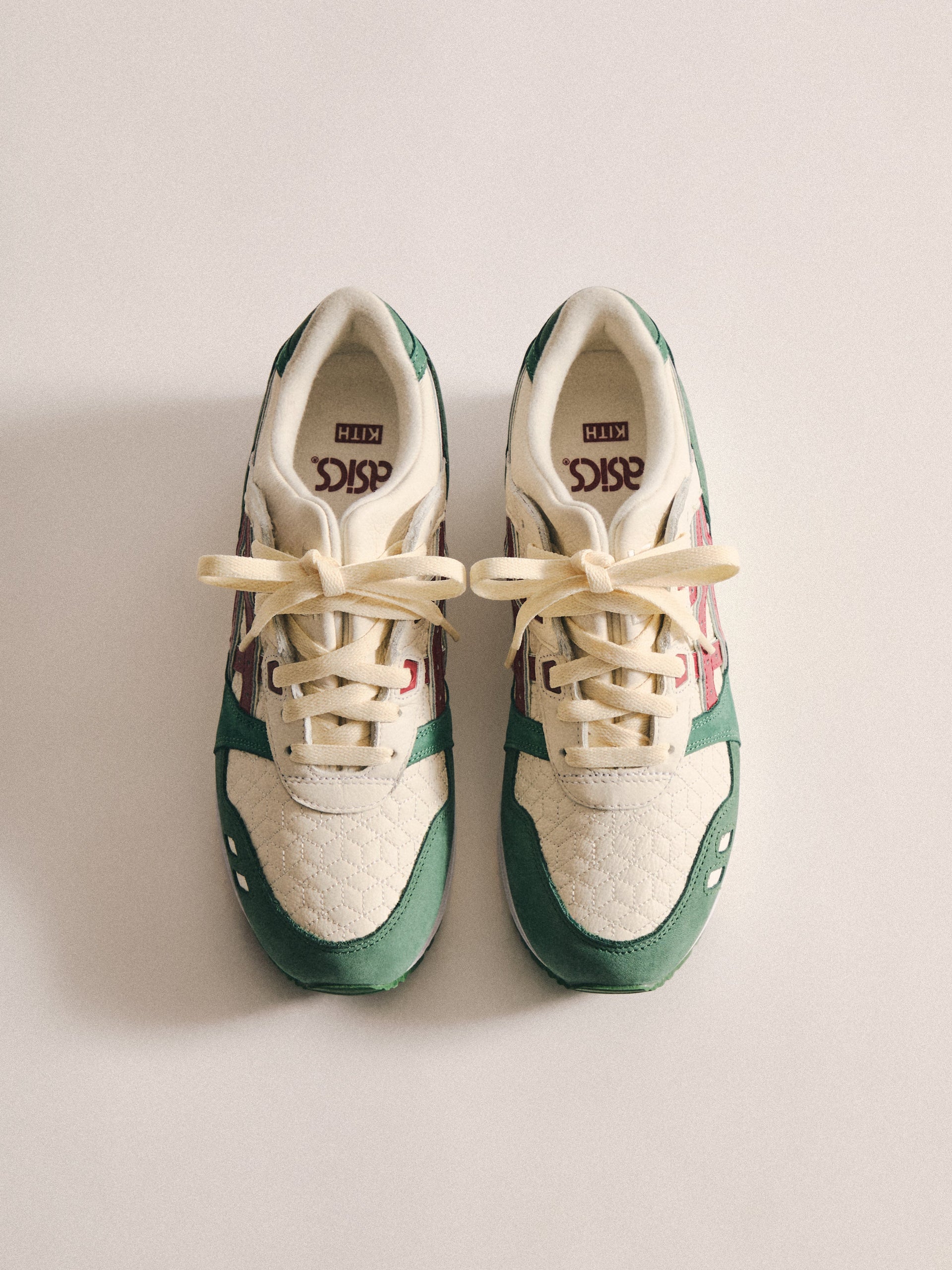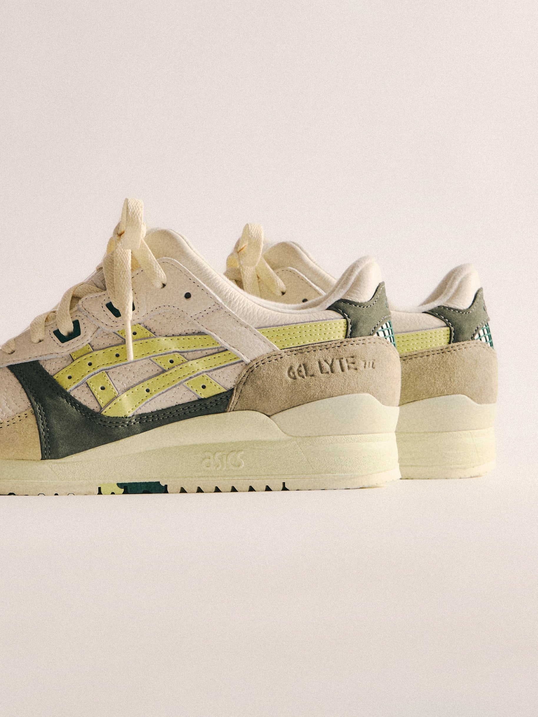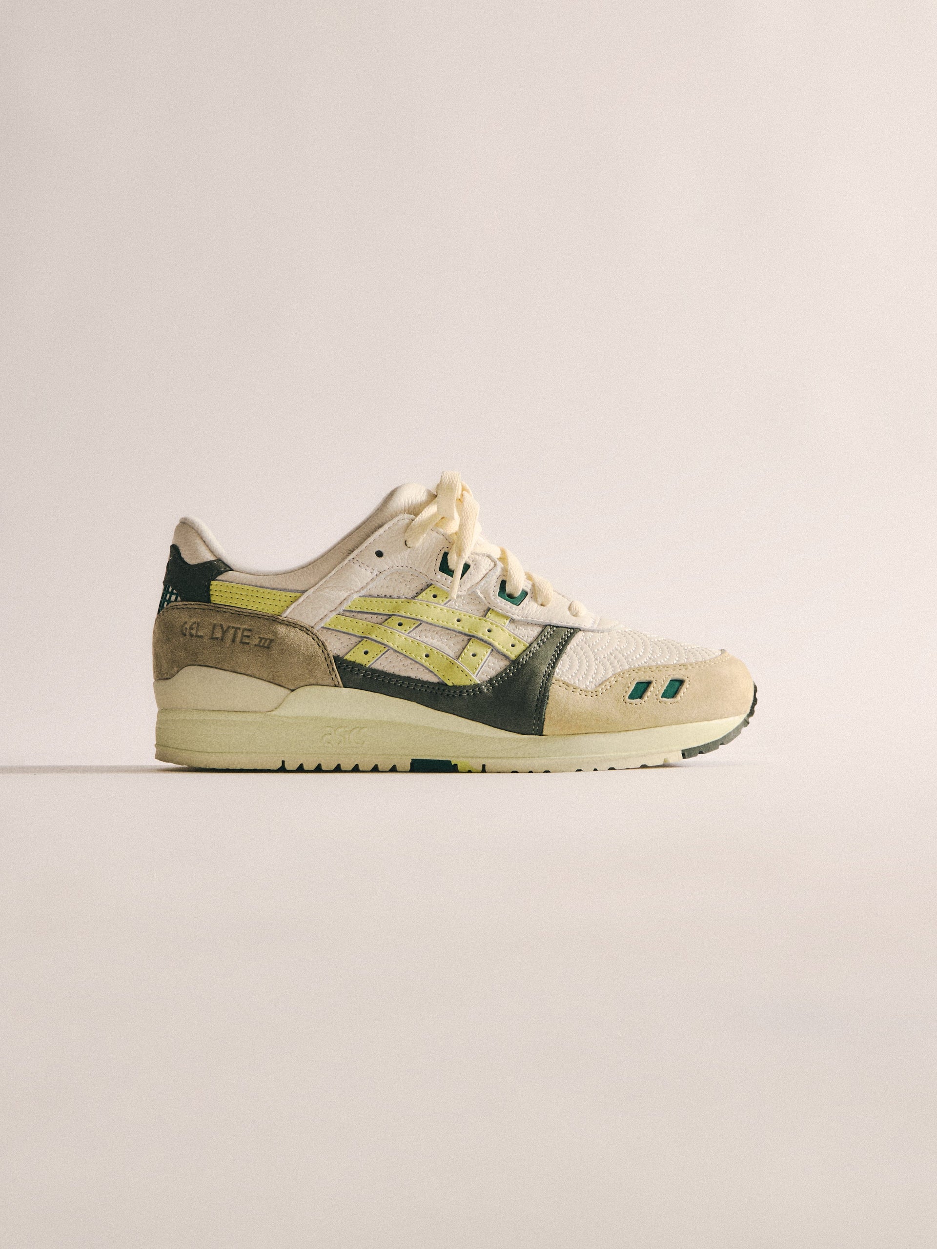 本コレクションは、Ronnie Fieg が 2011 年に手がけた初の Kith フットウェアコラボレーションである GEL-LYTE III から始まります。4つのブロッキングで構成されたカラーパレットに、キルティングを施したアンダーレイ、サイドにはパテントレザーのタイガーストライプ、そして Fieg のブランディングをあしらったアイコニックなスプリットタンを組み合わせたデザイン。各モデルには替え紐が付属し、サイドには「GEL-LYTE III」のワードマーク、フットベッドにはコラボレーションロゴが配されています。Ronnie Fieg for ASICS GEL-LYTE III “World’s Fair” は、Brazil、South Korea、Italy、Canada から着想を得たカラーウェイで展開されます。