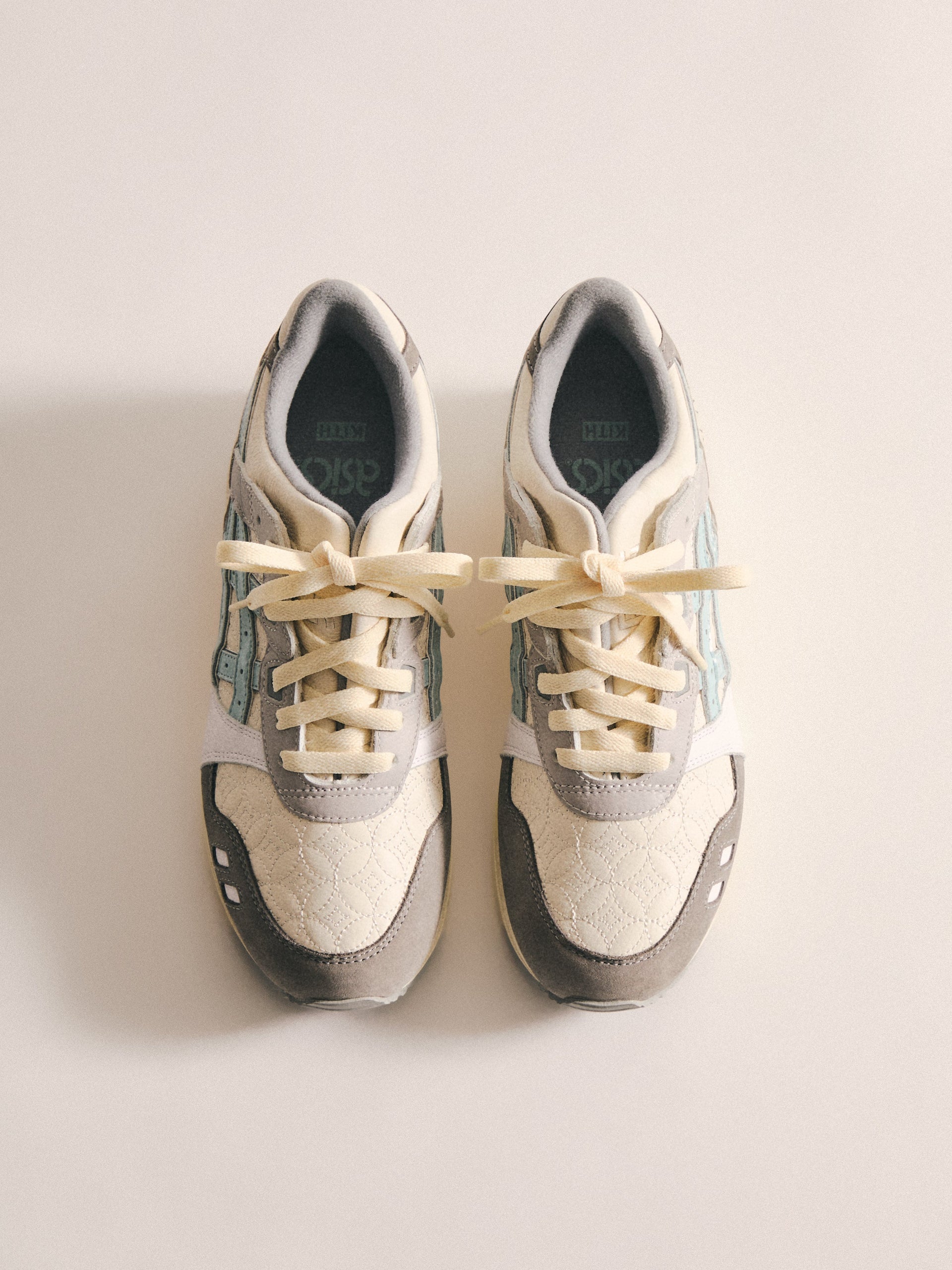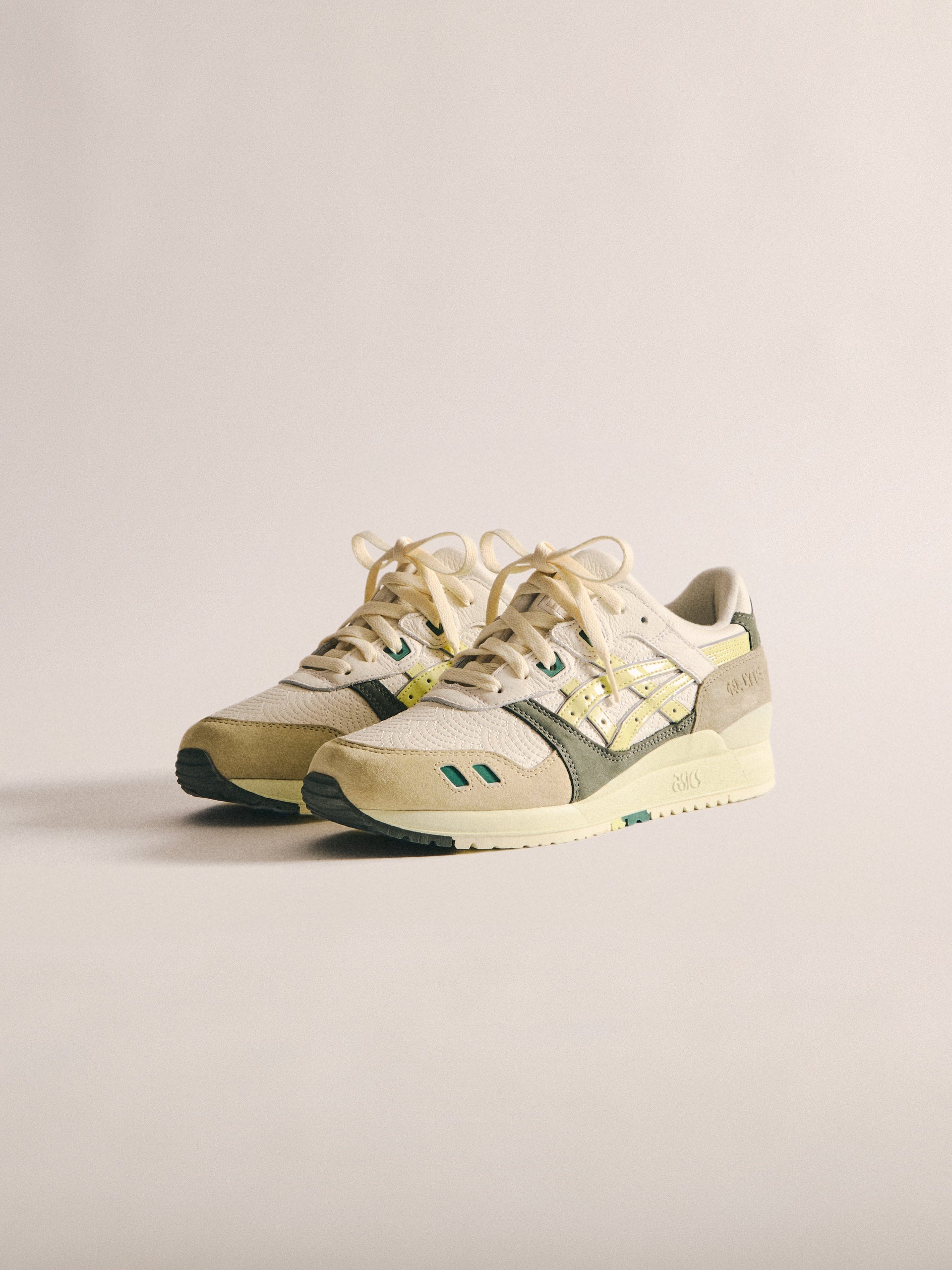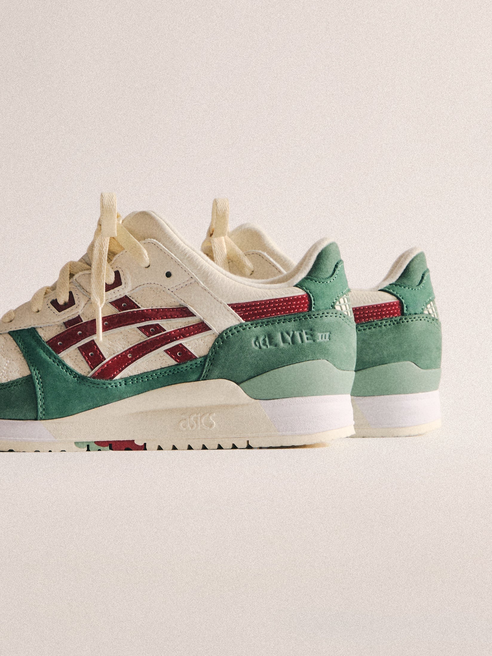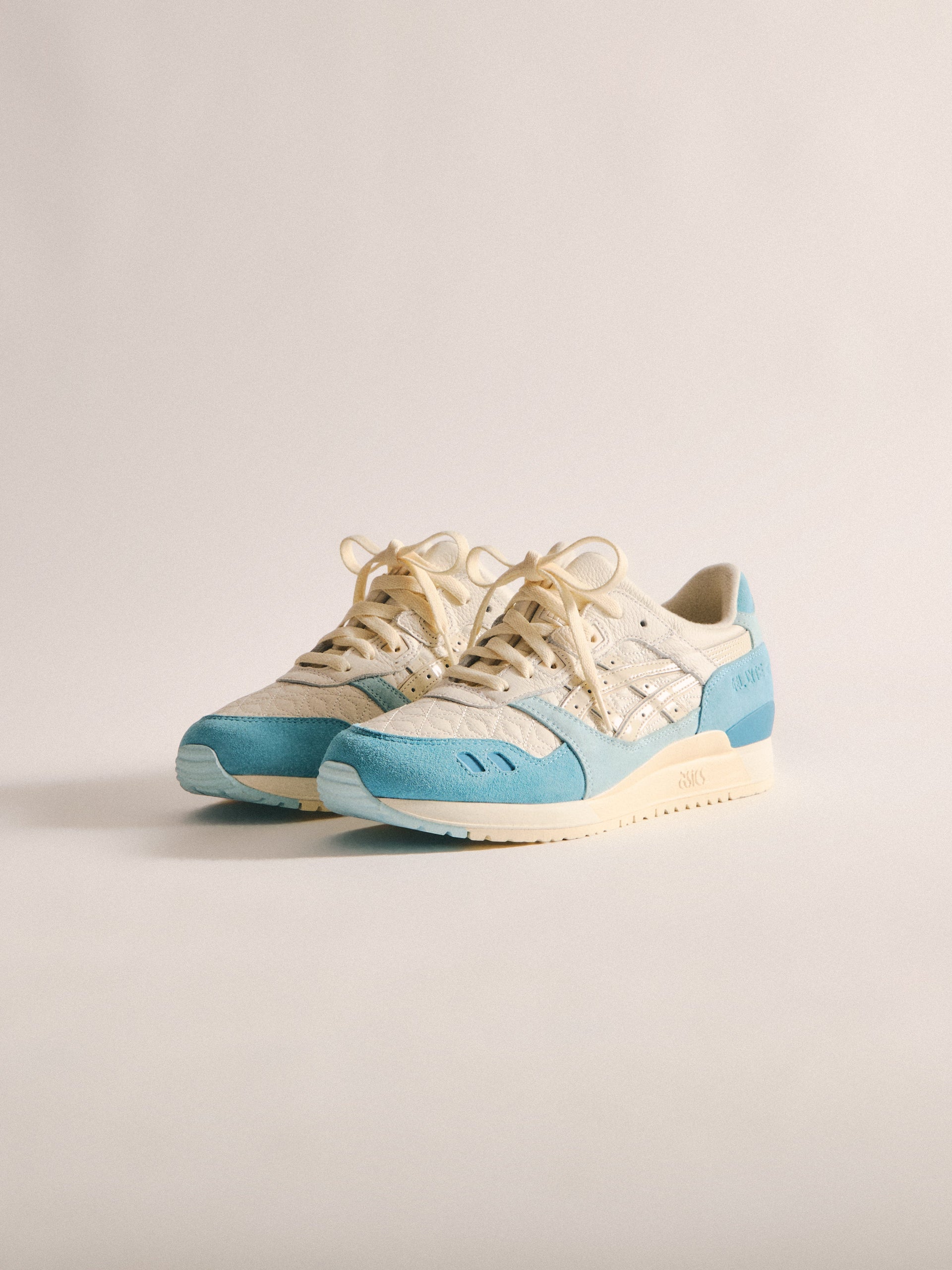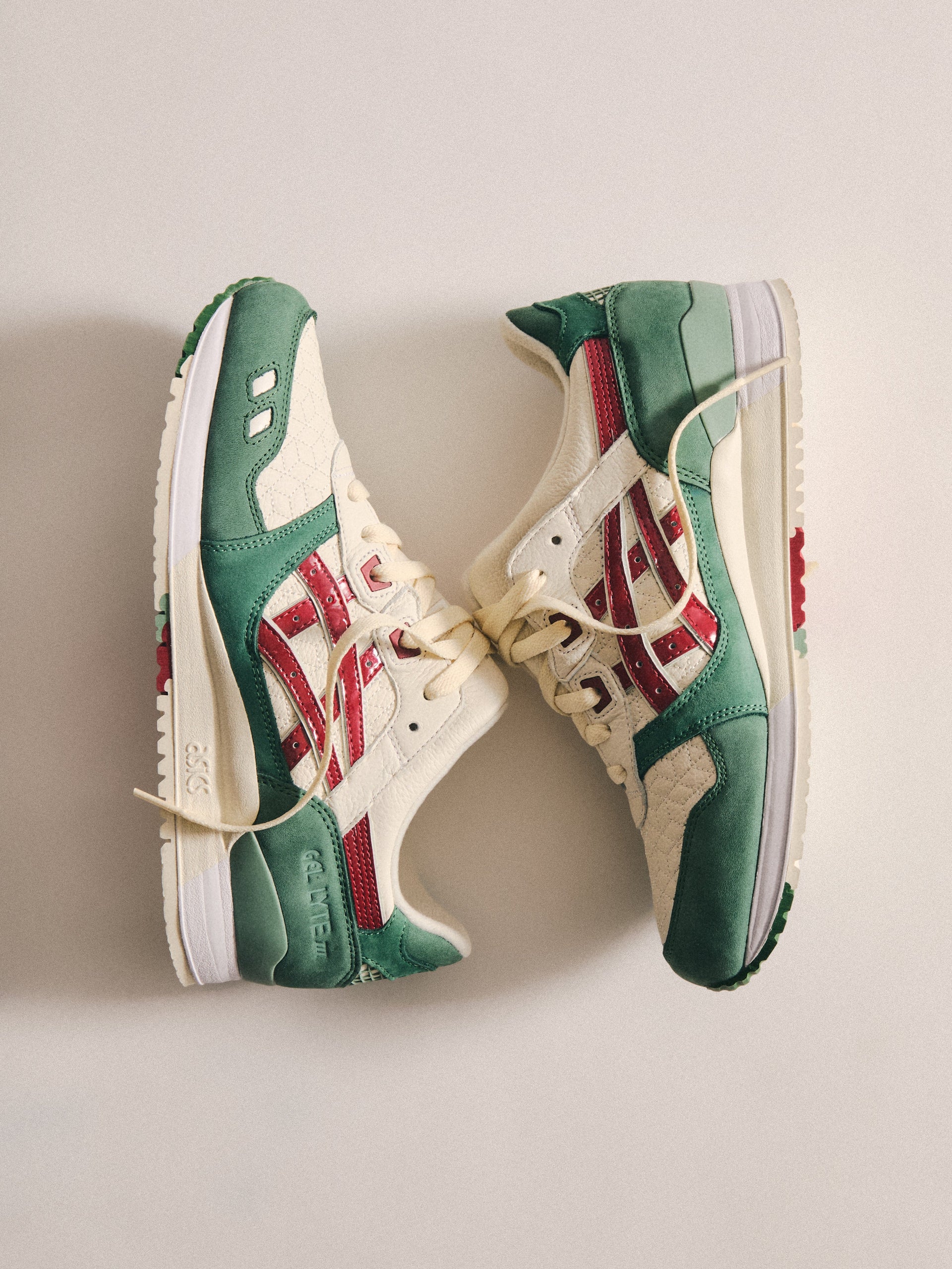 本コレクションは、Ronnie Fieg が 2011 年に手がけた初の Kith フットウェアコラボレーションである GEL-LYTE III から始まります。4つのブロッキングで構成されたカラーパレットに、キルティングを施したアンダーレイ、サイドにはパテントレザーのタイガーストライプ、そして Fieg のブランディングをあしらったアイコニックなスプリットタンを組み合わせたデザイン。各モデルには替え紐が付属し、サイドには「GEL-LYTE III」のワードマーク、フットベッドにはコラボレーションロゴが配されています。Ronnie Fieg for ASICS GEL-LYTE III “World’s Fair” は、Brazil、South Korea、Italy、Canada から着想を得たカラーウェイで展開されます。