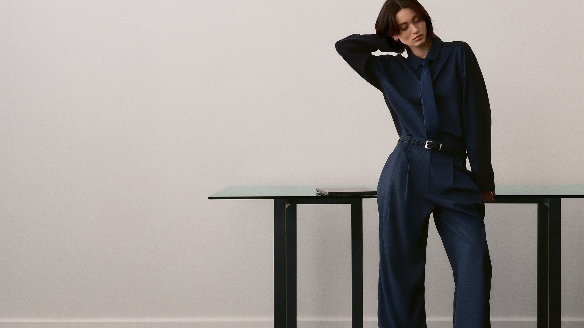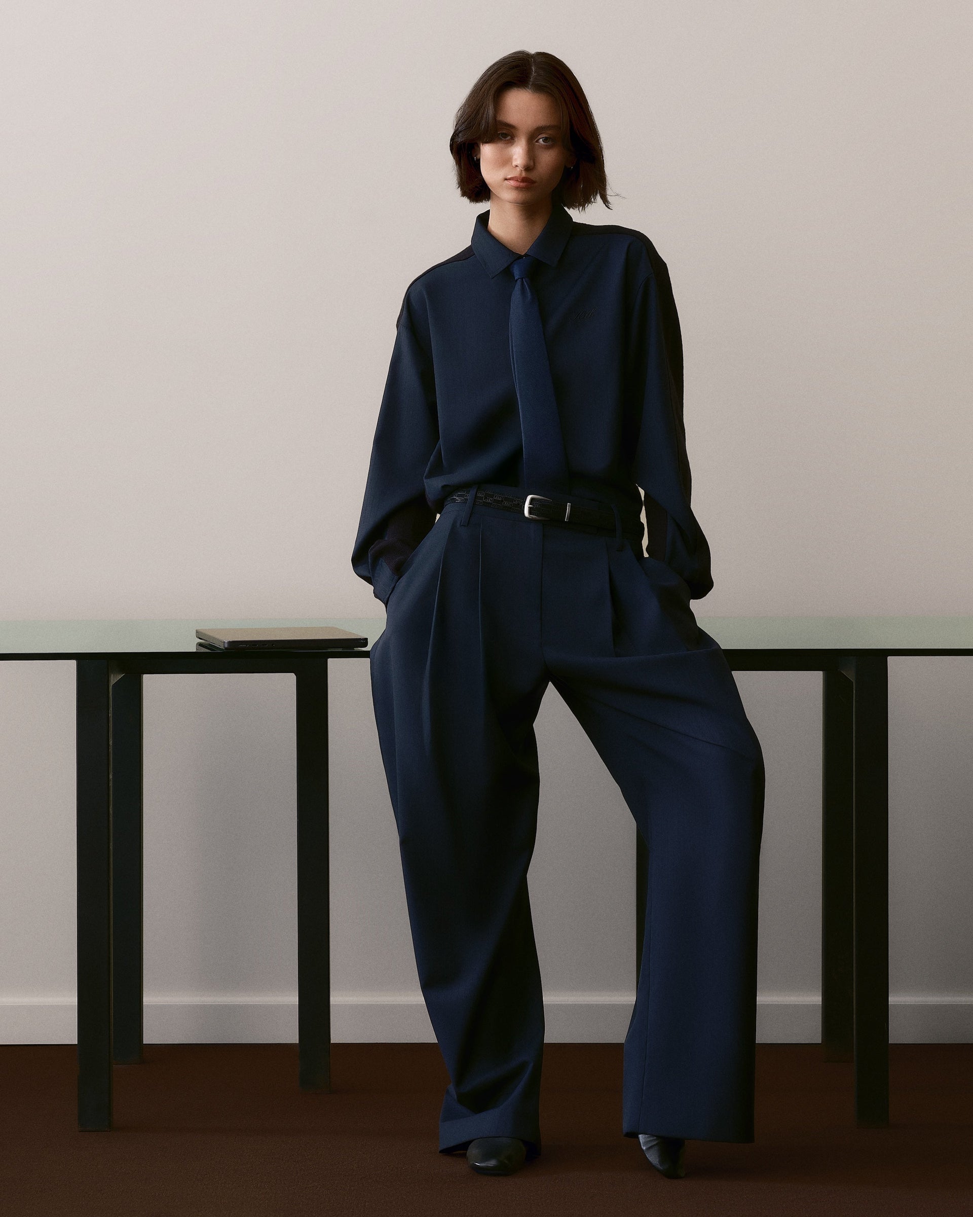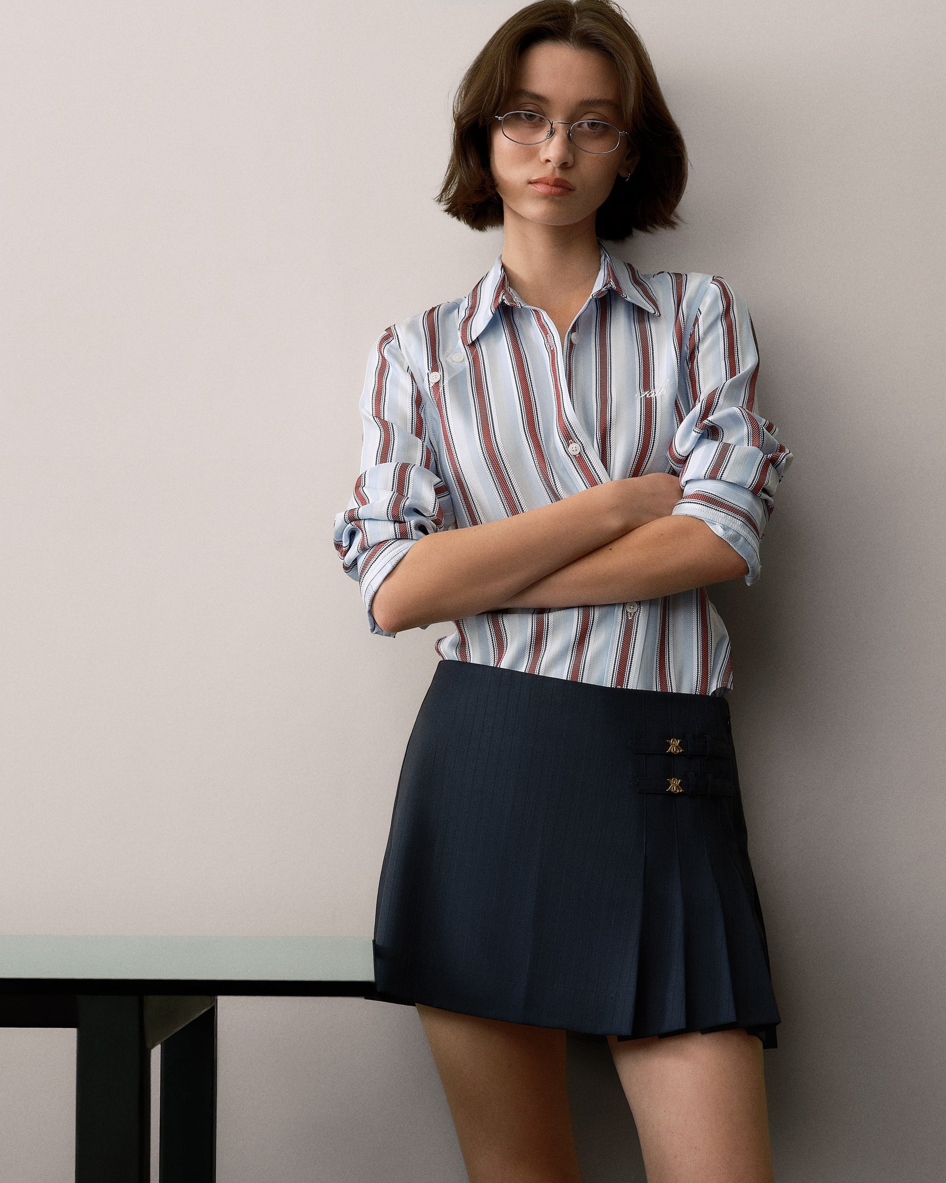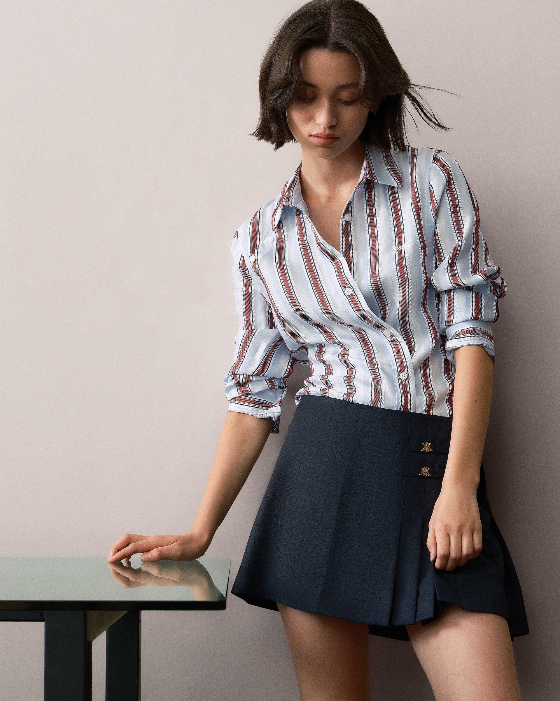 本コレクションの注目アイテムには、ビスコースストライプジャカードを使用した Sidney Stripe Asymmetrical Shirt、シャドーダブルストライプツイルで仕立てた Ora III Sweater Shirt、バックルタブのディテールとプリーツ仕様が特徴の Emira Pleated Micro Skirt など、スーツから着想を得た洗練されたシルエットが揃います。