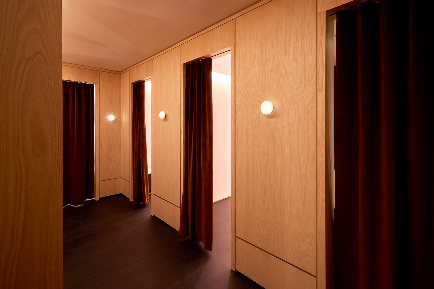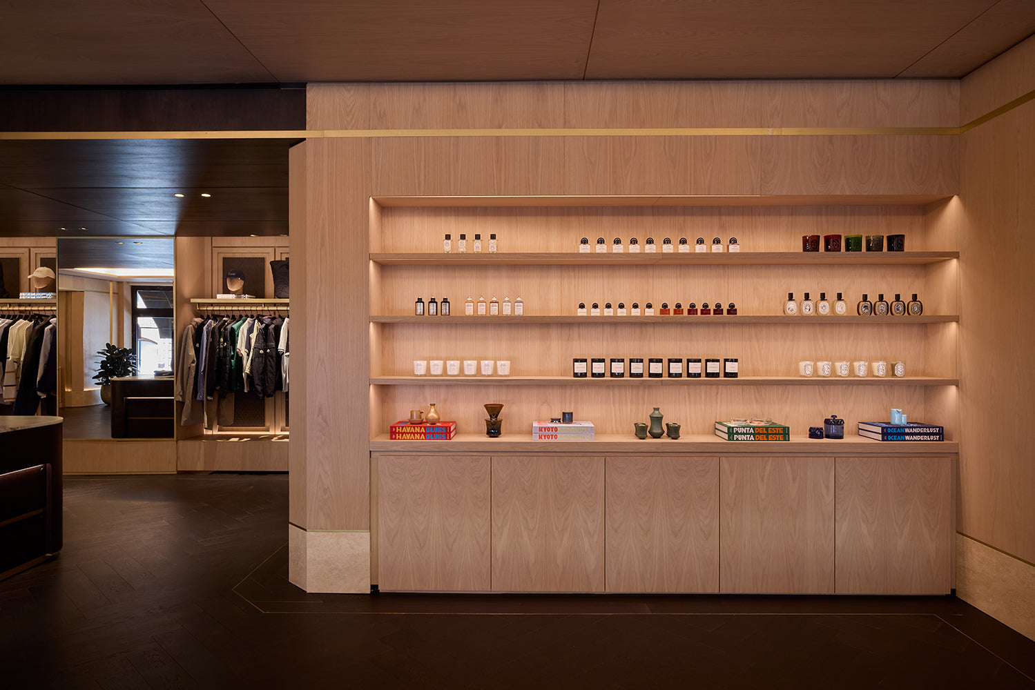 The second floor features an expertly curated selection of multi-brand apparel and accessories. Here, the dark walnut walls from the first floor are juxtaposed with white oak, creating a visual contrast for guests while maintaining a cohesive design language throughout the space. Beveled Varias Green stone portals frame each entryway, adding architectural depth and reinforcing the intentional flow throughout the space.
